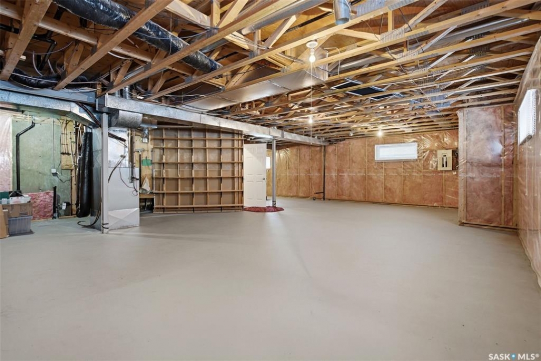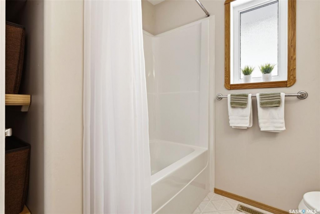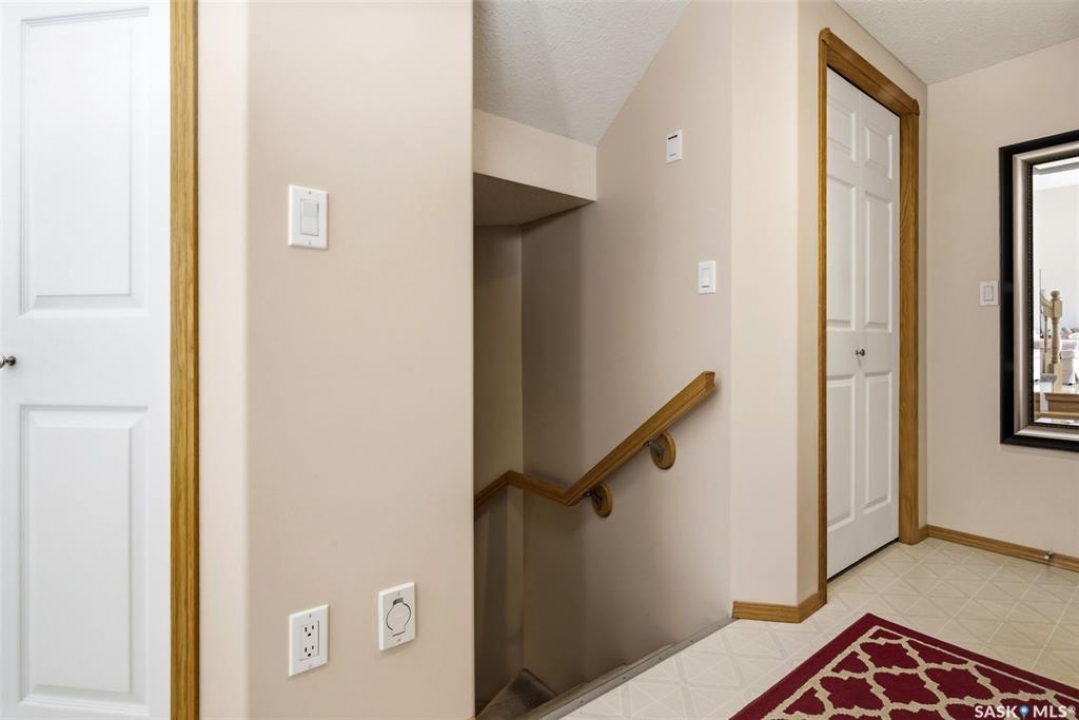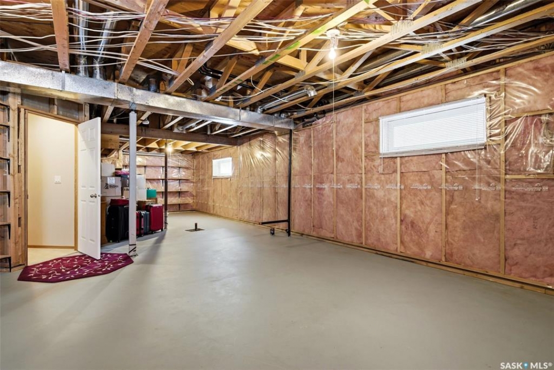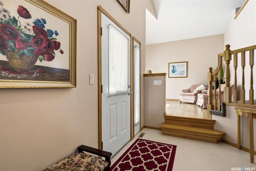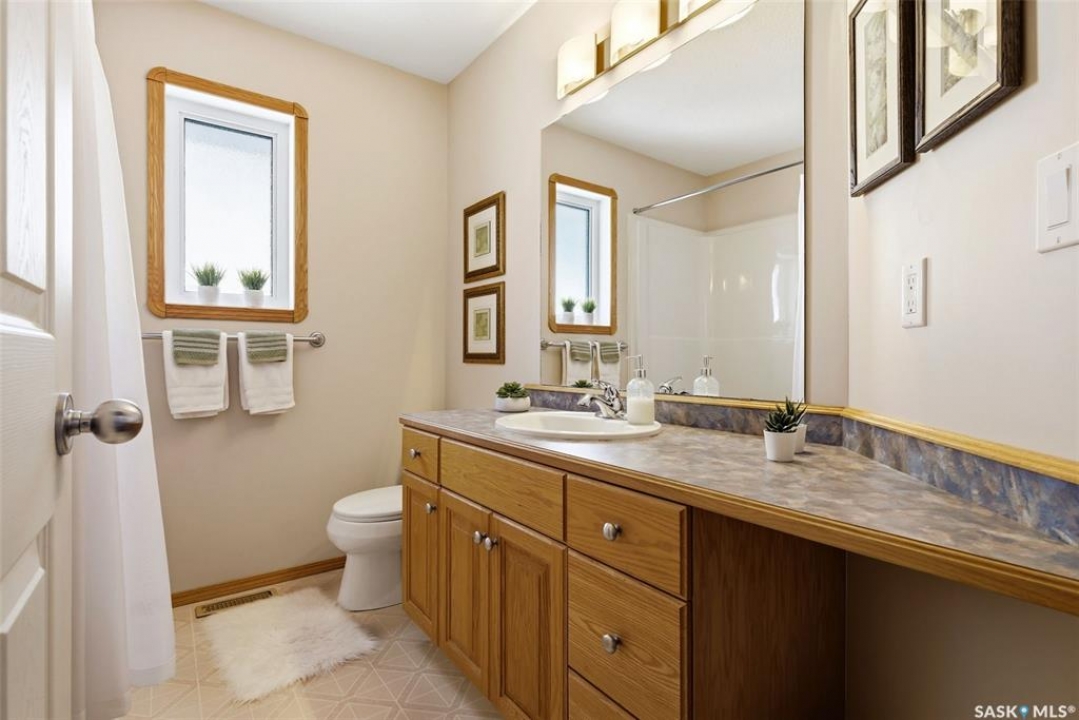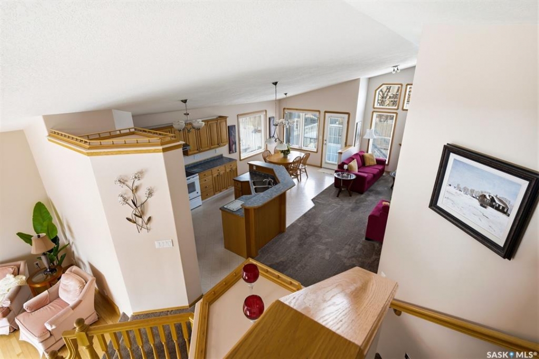 Absolute gem! Meticulously kept, custom-built by Emerald Park Homes, this unique modified bi-level offers 1,674 sq ft of thoughtfully designed living space with the primary suite above the garage. Step into a welcoming front entry featuring a versatile den/flex room—perfect for a home office or playroom. The open-concept main floor showcases a bright kitchen, dining area, and great room with vaulted ceilings, a cozy natural gas fireplace, and an impressive wall of windows that flood the space with natural light. The main level also includes two spacious bedrooms, a full bathroom, and a convenient laundry room. Upstairs, retreat to your private primary suite complete with a walk-in closet and full ensuite—your own peaceful escape. The bright basement features large windows, is fully insulated, and offers a wide-open layout ready for future development (basement plans available). The double attached garage (22' x 21') includes an additional 7' x 12' space ideal for a workshop or extra storage. Value-added upgrades include: Newer PVC fence (2020/21), Shingles (2015), New stove & dishwasher (2026). Additional highlights: corner pantry, under-cabinet lighting, closet lighting, central air conditioning, central vacuum, and all appliances included. Located in a fantastic family-friendly area close to St. Gabriel and Jack MacKenzie Schools—this is a wonderful place to call home!