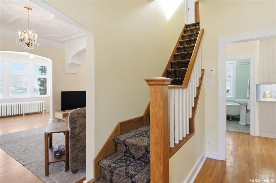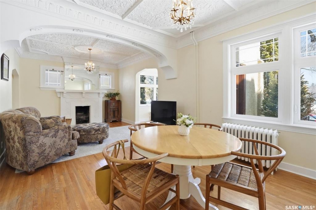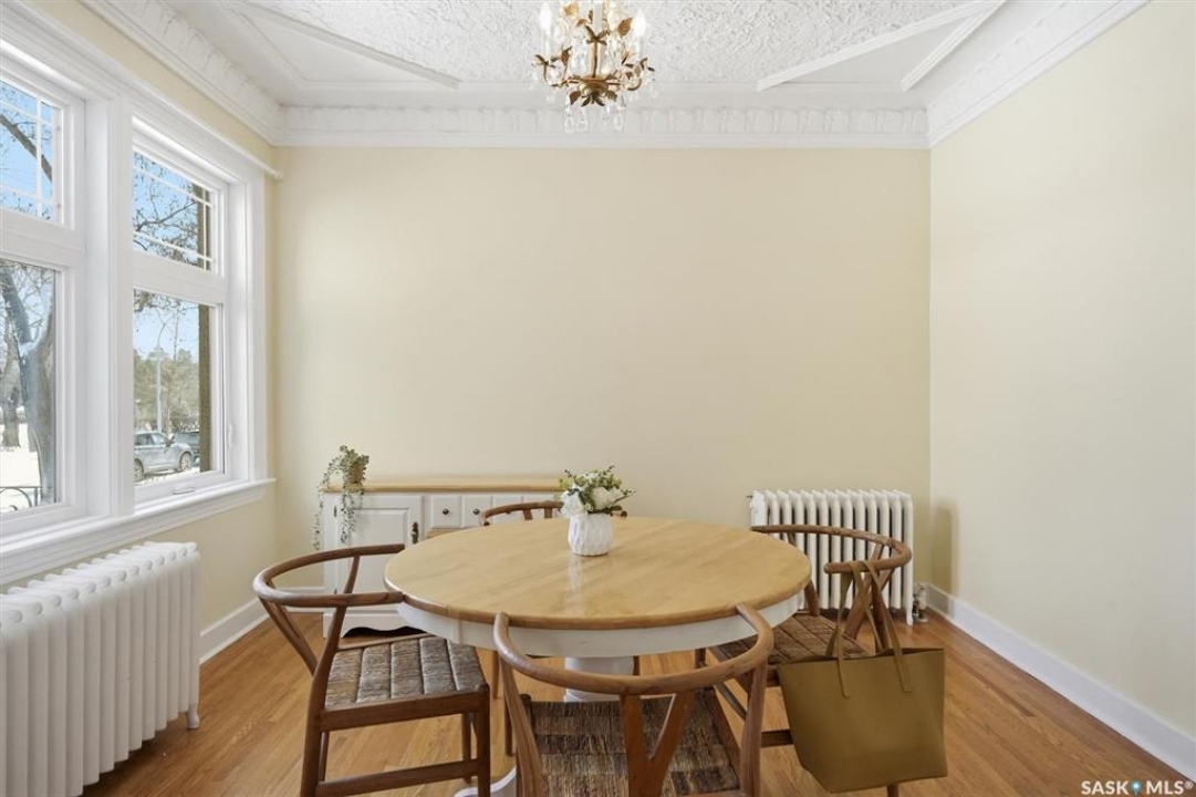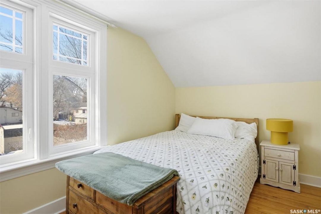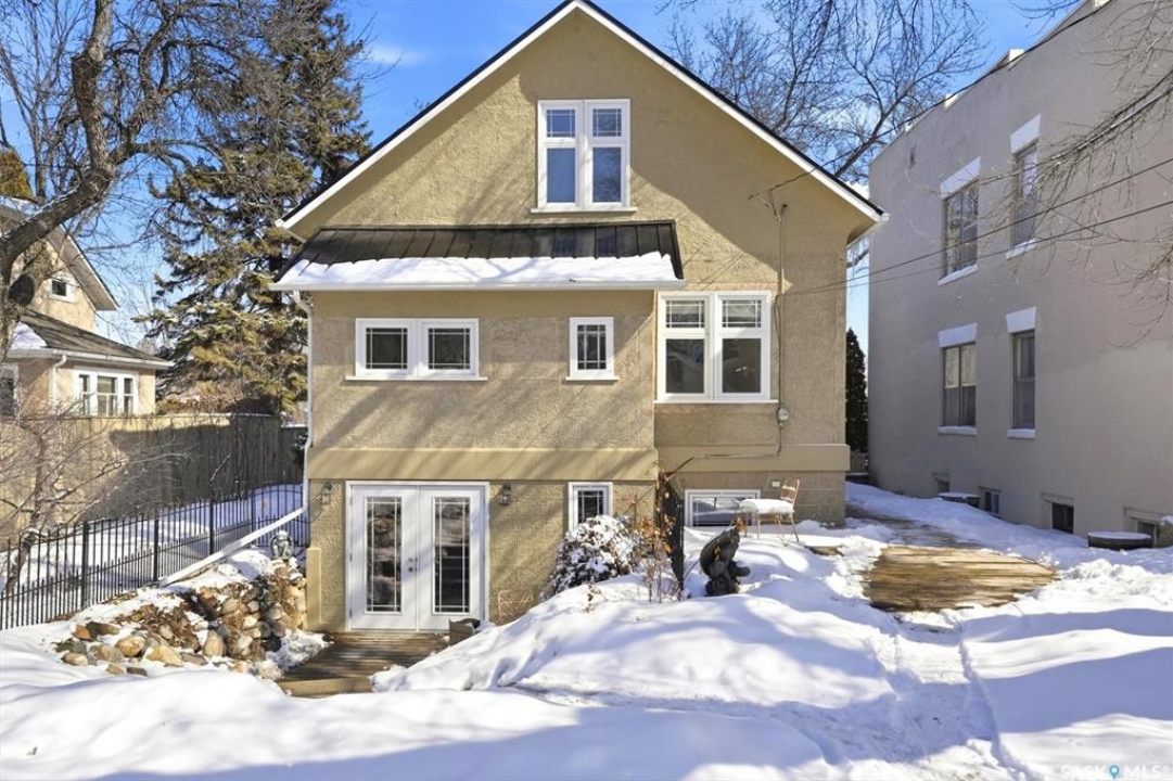 A truly rare home where timeless character, crown mouldings, archways, and a bright walkout basement come together in a way you don't often see. Set on a 50 x 134 ft. lot across from Wilson Park and just steps to the river, this property immediately stands out for its craftsmanship and attention to detail. The spacious front foyer offers flexibility as a sitting area or office and leads into a warm, inviting living room with a wood-burning fireplace. The living and dining spaces are truly special, featuring detailed ceilings, crown mouldings, and stunning archways that create a seamless, elegant flow throughout. The kitchen is both functional and thoughtfully updated with high-quality Redl cabinetry, quartz countertops, and a dedicated coffee bar or prep space with granite in the nook. The main floor includes a versatile bedroom or office and a full four-piece bathroom with stained glass windows and a claw foot tub. Upstairs, the primary bedroom features a private balcony overlooking the park, along with a second bedroom and a three-piece bathroom. The walkout basement is a standout bright, open, and beautifully finished with in-floor heating. The spacious family room is filled with natural light and opens directly to the backyard through garden doors. This level also offers an additional bedroom, a three-piece bathroom with walk-in shower, and a generous laundry area. Wet bar rough-in provides excellent potential for entertaining or a future suite. The backyard feels private and established with mature greenery, patio space, garden boxes, and a shed. Additional features include a heated double detached garage, on-demand hot water, and extensive upgrades to mechanical, plumbing, electrical, along with metal roofing and fiberglass fascia on both the house and garage. Located minutes to City Park Elementary, City Hospital, and quick access to main routes, this is a rare opportunity to own a character home where pride of ownership shines throughout.