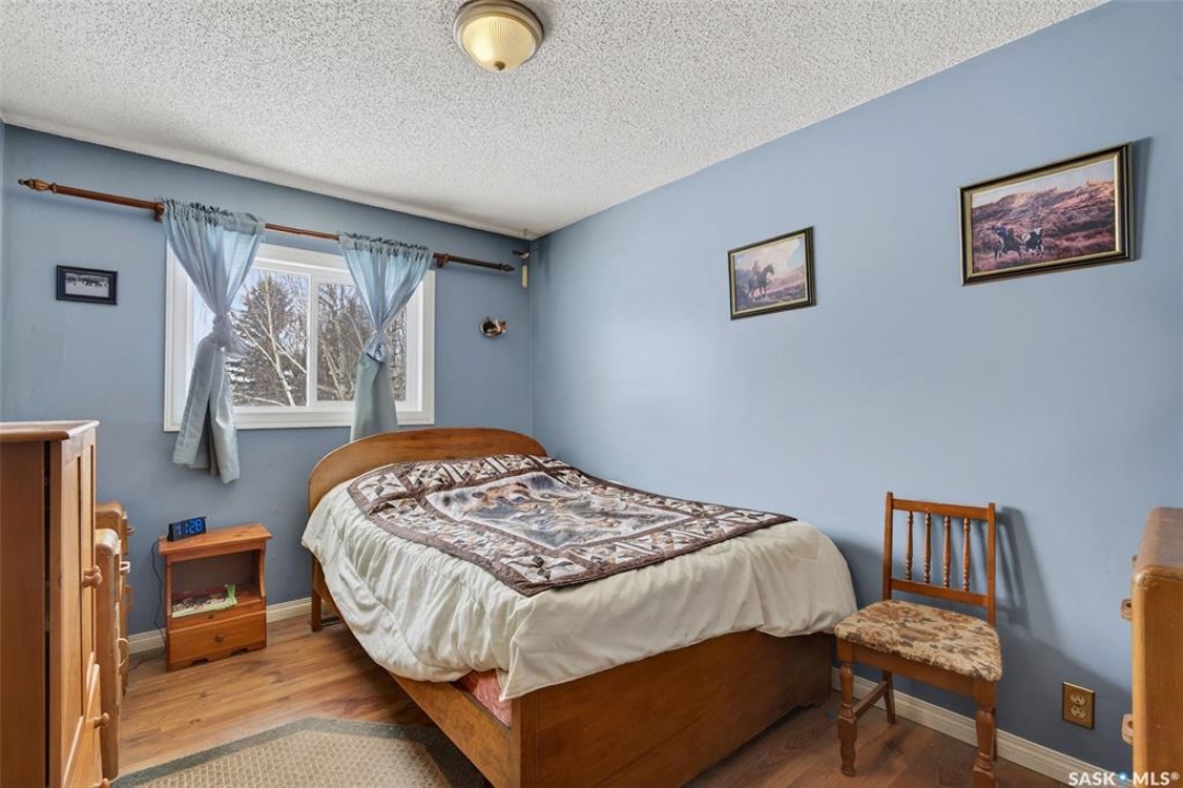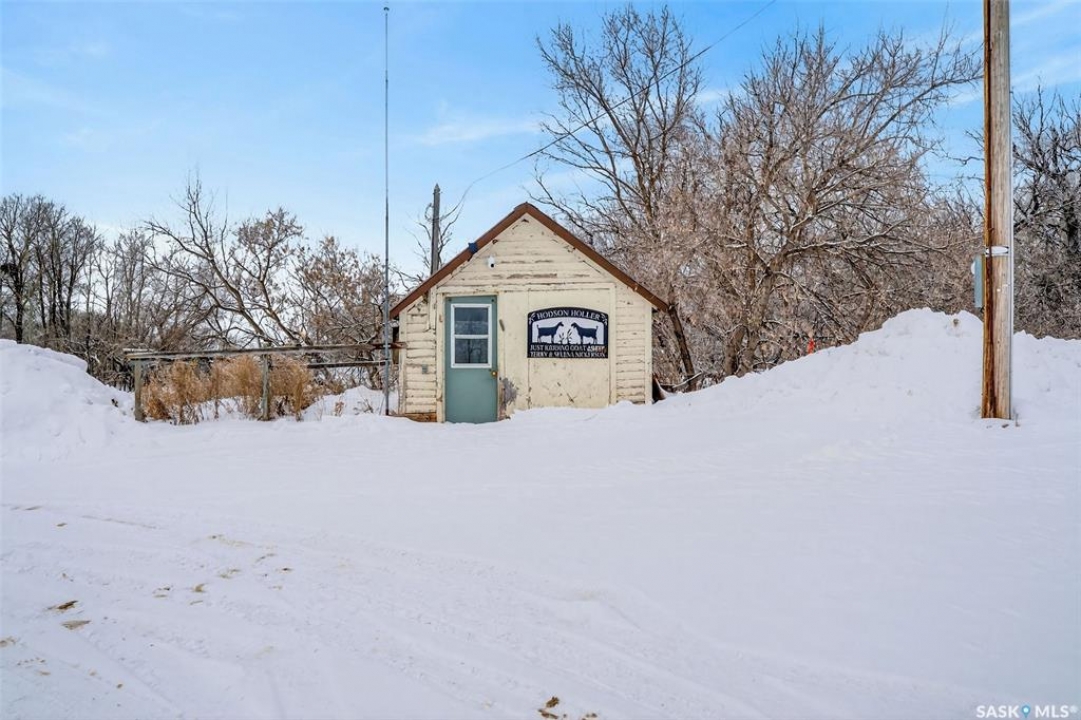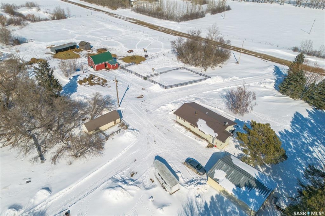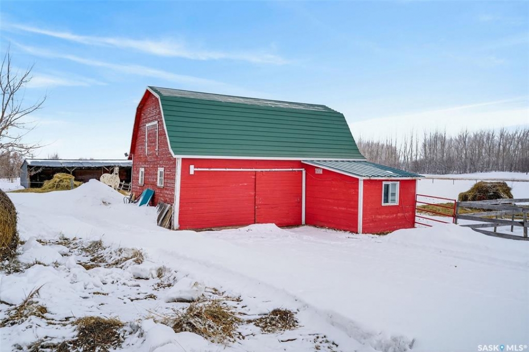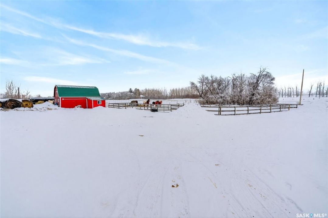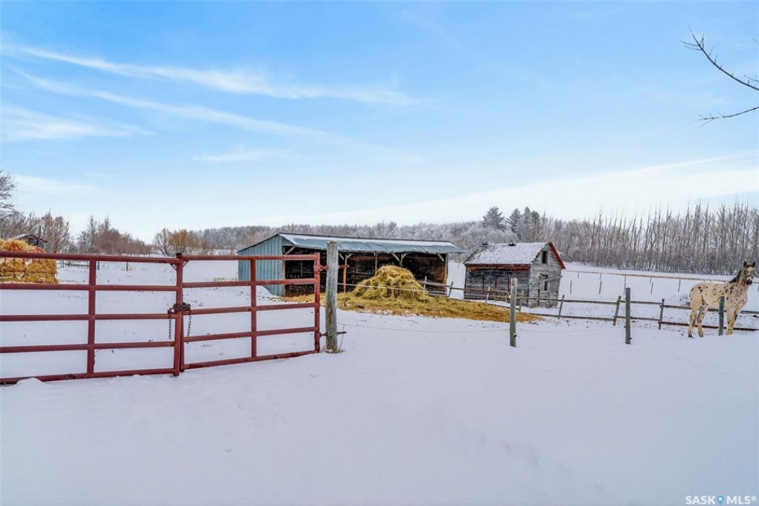 Full Quarter, Fully Set Up....Built for Living, Ready for Animals! Located in the RM of Lake Lenore commuting distance to Naicam, Lake Lenore & St. Brieux. School bus pickup to Lake Lenore. This property includes a 1065 sq.ft. bungalow (3 bedrooms, full bath on main and basement is partially finished with three piece bath/laundry. Includes fridge, stove (gas propane), portable dishwasher, washer, dryer. Large double detached garage (24' x 32'), hen house (12' x 26'). Fenced outdoor riding arena (approx. 84' x 120'). The machine shed includes 4 bays with power, approx 30' x 57' with an addition of 30'x 23' that is closed in. Barn has 3 stalls plus tack room. 2 Paddocks fenced in at front of property (to barn) with animal shelter and heated watering bowl direct feed from dugout. There is additional fencing (page wire) done behind machine shed when owners had sheep. Approx 99 acres of seeded hayland, mostly open, few to no stones (hay used for personal use as well as an income source). Septic tank installed in 2015. Electric Water Heater & Forced Air Propane Furnace installed approx 4 years ago. Ample water supply from two dugouts that feed into wells (one well used, other is backup). Private location, great for animals and family life fun of camping, fishing/recreational a short drive away!