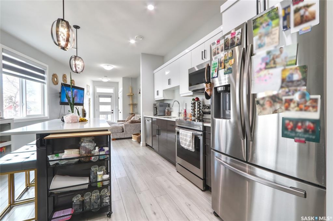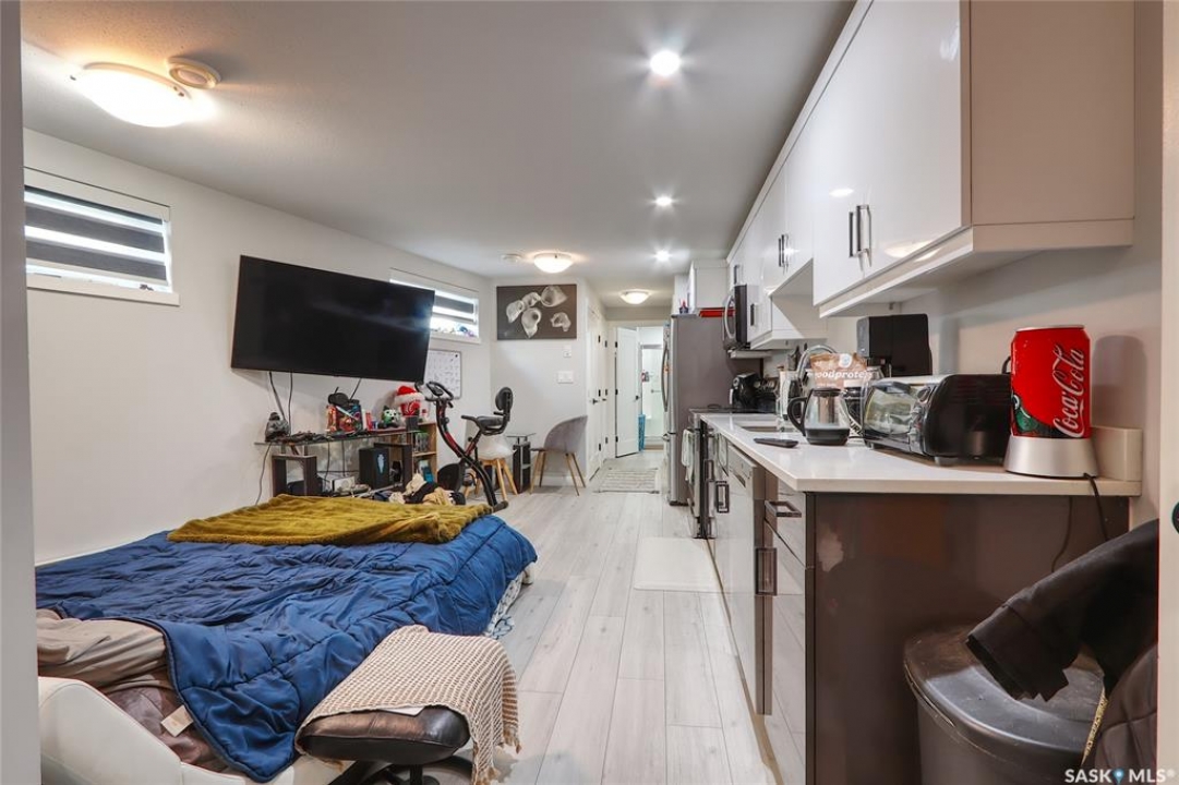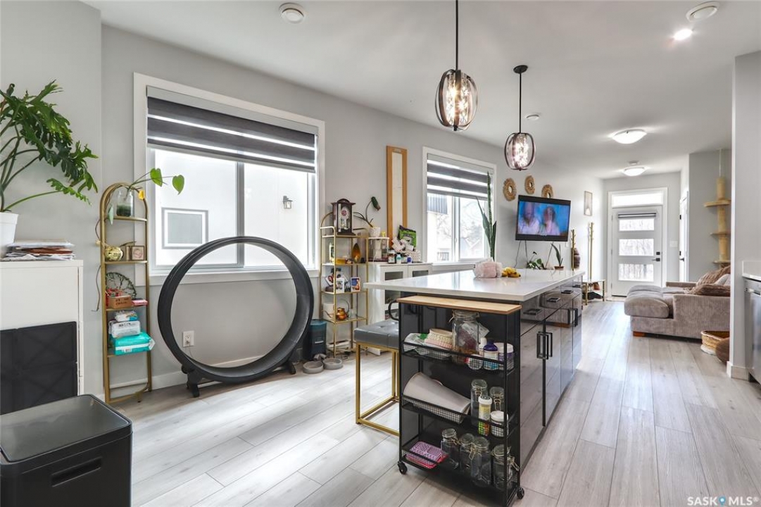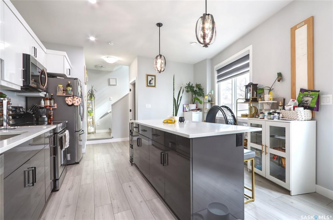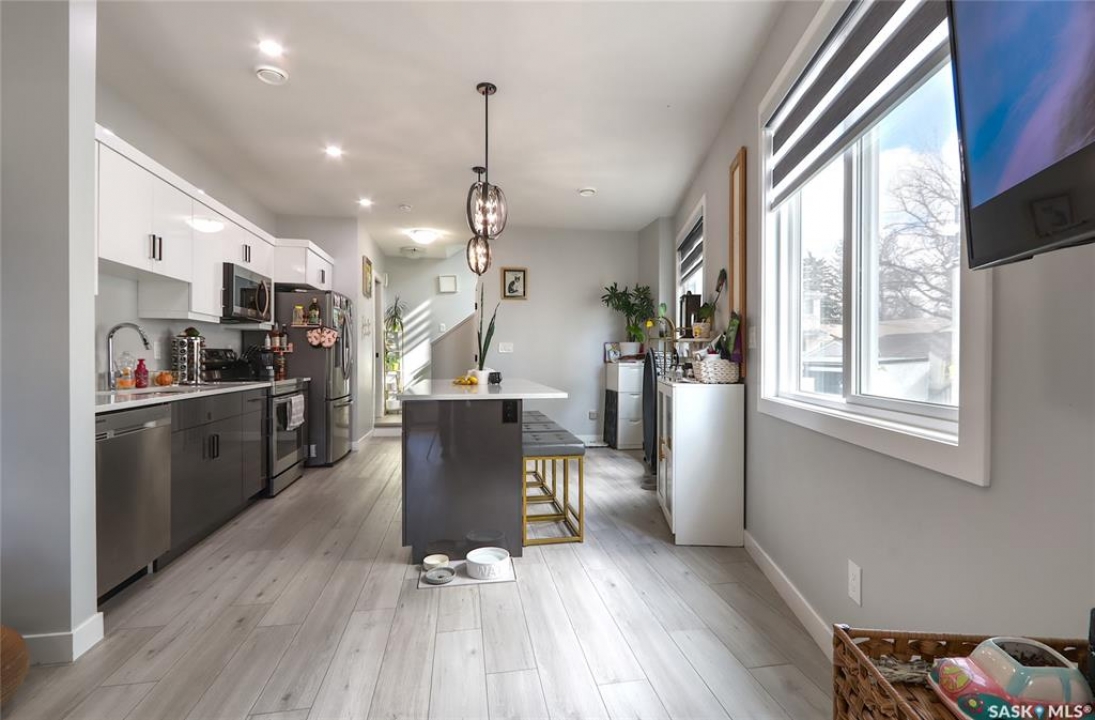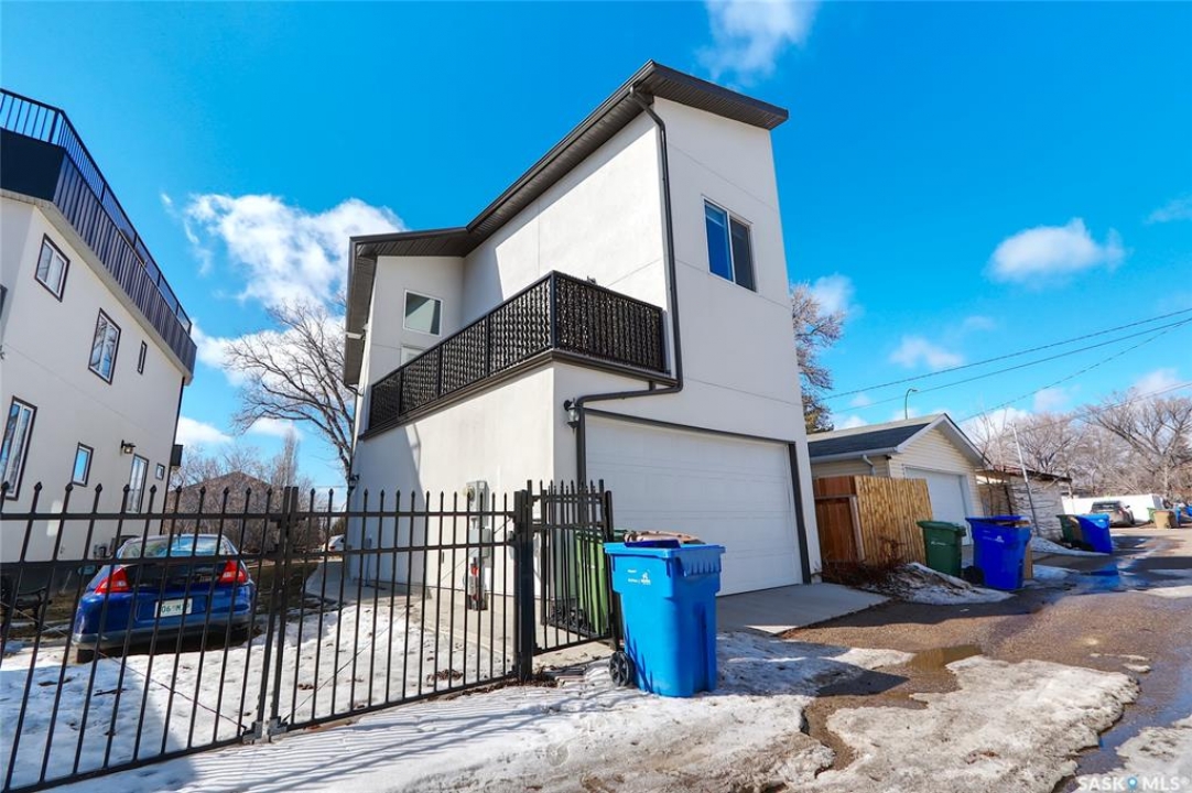 Welcome to this highly customized 2-storey home offering 1,293 sq ft of stylish and functional living space. Thoughtfully designed with modern finishes throughout, this home is perfect for homeowners and investors alike. The main floor features a bright open-concept layout seamlessly connecting the living room, dining area, and kitchen—ideal for both everyday living and entertaining. The kitchen is beautifully finished with two-tone white and brown cabinetry, stainless steel appliances, and ample storage space. A convenient 2-piece bathroom completes the main level. Upstairs, you're greeted by a unique balcony space that adds character and charm. The second floor offers two spacious bedrooms and two full bathrooms. The primary bedroom includes double closets and a private 3-piece ensuite, creating a comfortable retreat. The basement is fully developed with a regulated studio suite, complete with its own separate entrance. It features a modern two-tone white and brown kitchen, a 3-piece bathroom, and an efficient layout—making it an excellent mortgage helper or investment opportunity. At the rear of the home, you'll find a detached two-car garage, providing secure parking and additional storage. Located in cathedral neighbourhood of Regina, this property offers quick access to downtown, schools, parks, and public transit. Its proximity to amenities and key institutions like the University of Regina and Saskatchewan Polytechnic makes it especially attractive for students, professionals, and investors. A fantastic opportunity to own a modern, income-generating home in a convenient and established location.