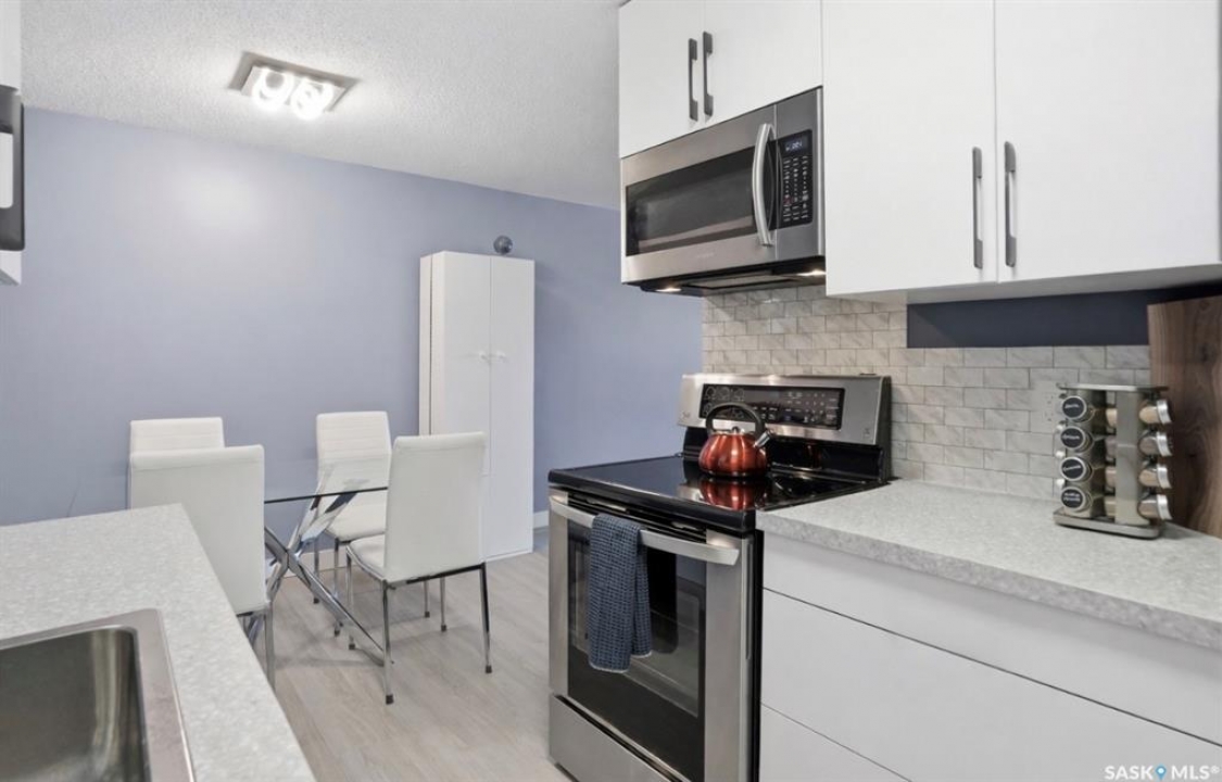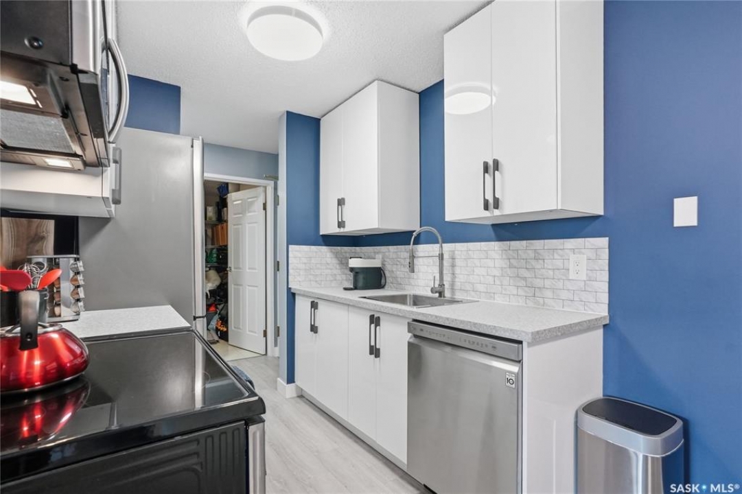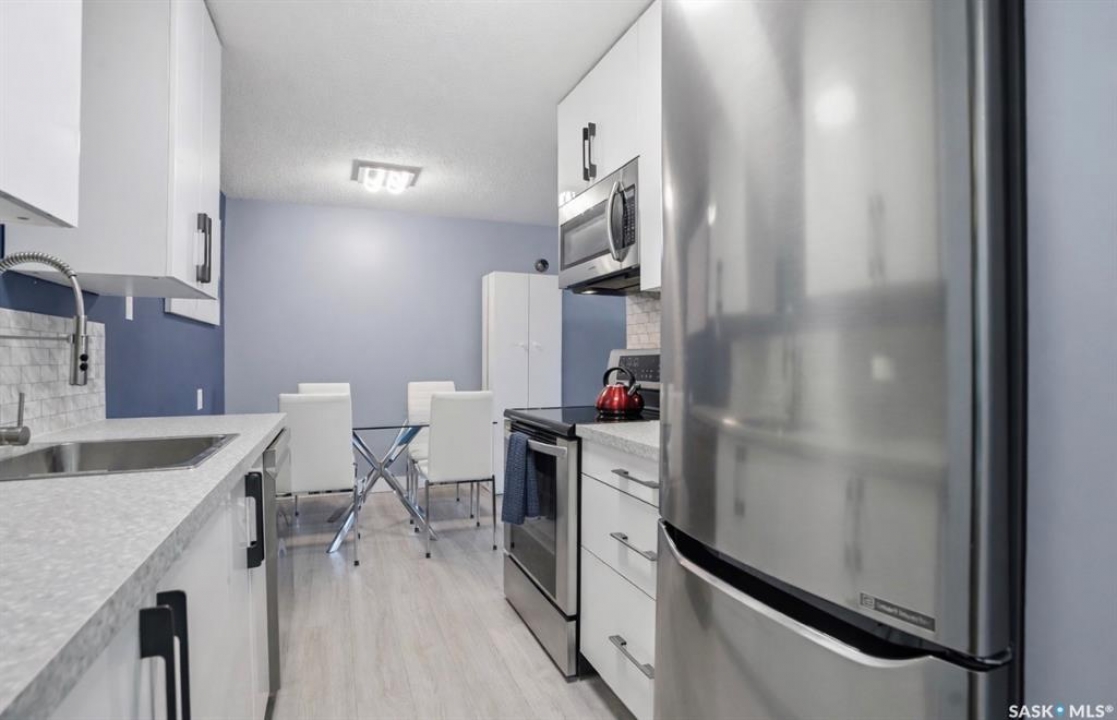 Lakeview condo—third-floor unit, fully renovated and absolutely impressive! Stylish living is now incredibly affordable. This two-bedroom condominium is located in a safe, well-maintained community and includes one exterior parking stall. Step inside and immediately be impressed — The bright white NEWER lacquer kitchen features gleaming stainless appliances, an over-the-range microwave, newer countertops, a built-in dishwasher, tile backsplash and vinyl plank flooring. The adjoining dining area also has updated vinyl plank flooring, this room flows into an impressive 18' living room, complete with newer high end carpet and patio doors leading to an oversized balcony. A hallway with additional storage leads to two generous bedrooms, both featuring updated carpet, along with a beautifully renovated four-piece bathroom with modern finishes. The primary bedroom is oversized and offers a full wall-to-wall closet. A large storage and laundry room with plenty of shelving completes the floor plan. An exterior end-stall parking space is included. This standout condominium shows 10/10—don't miss your opportunity.