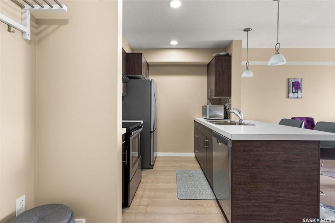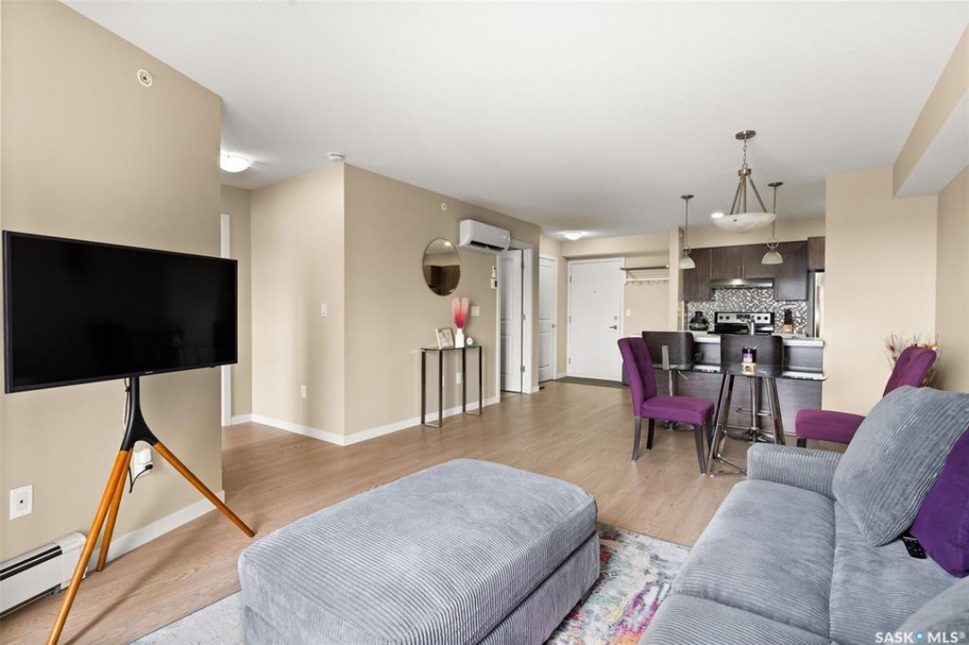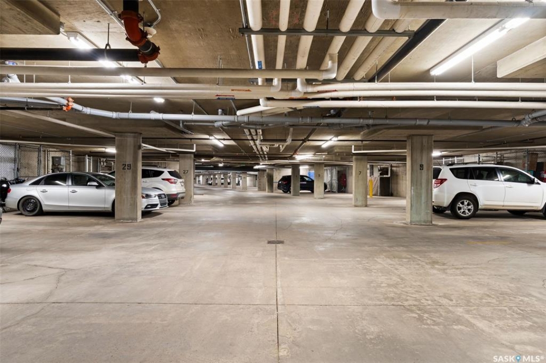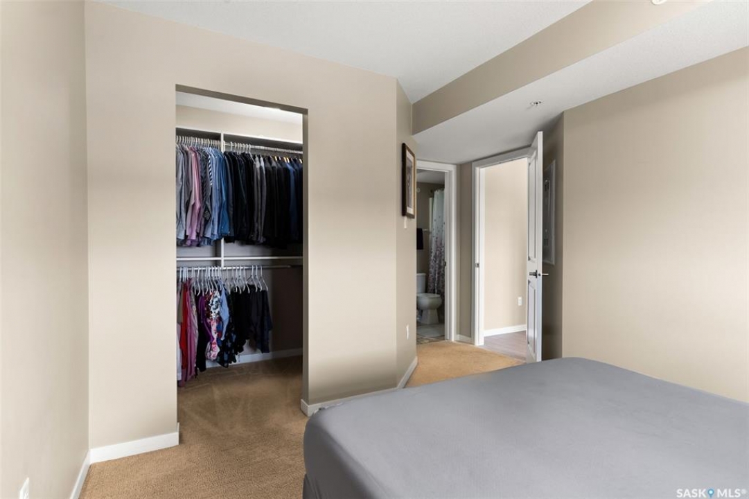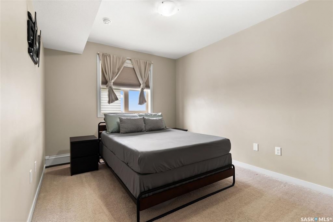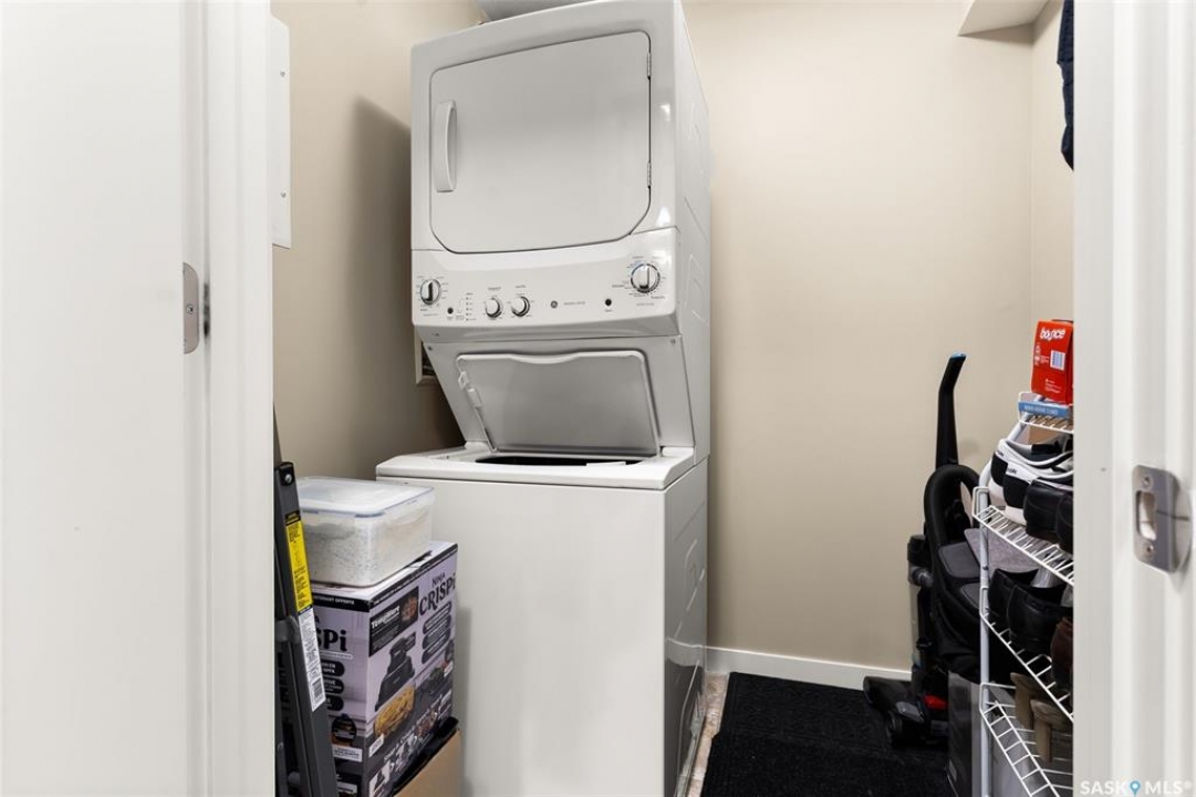 This top-floor Harbour Landing condo offers 2 bedrooms, 2 bathrooms, heated underground parking, and only one neighbouring unit. One of only a few built with this design, it also features an extra half foot of ceiling height for an even more spacious feel. South-facing exposure fills the open-concept living, dining, and kitchen area with beautiful natural light. Both bedrooms feature custom closets by Simply Stowed Custom Cabinets, and the laundry room provides extra in-suite storage. The Washer and Dryer were replaced in July of 2025, and condo fees include heat, water, and sewer for added everyday value and lower utility bills. Close to schools, daycares, parks, and all Harbour Landing amenities, this home offers comfort, convenience, and excellent value.