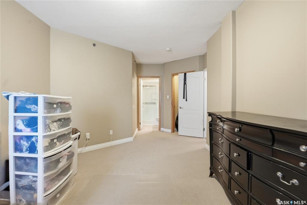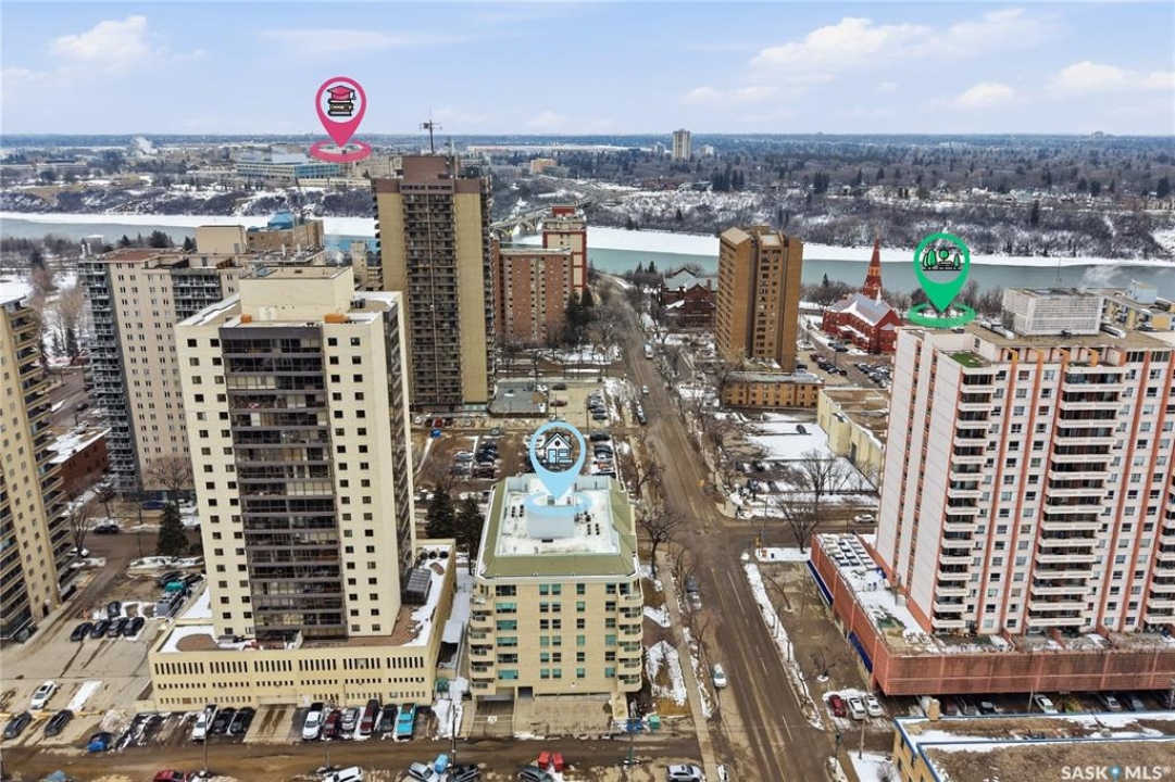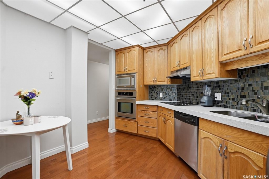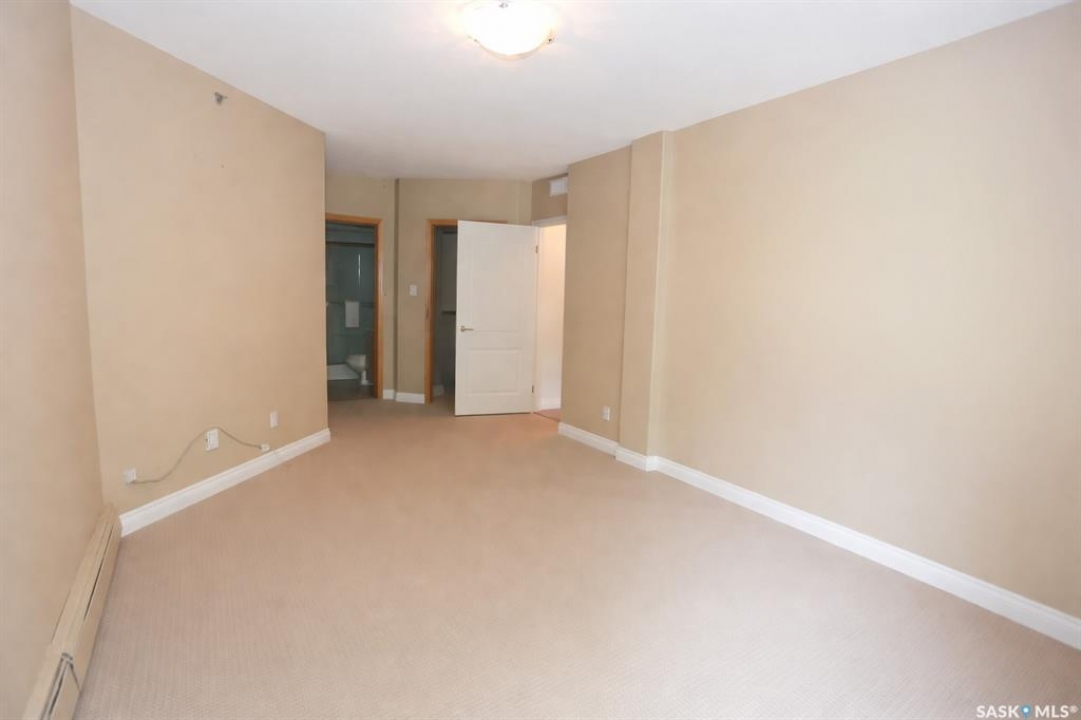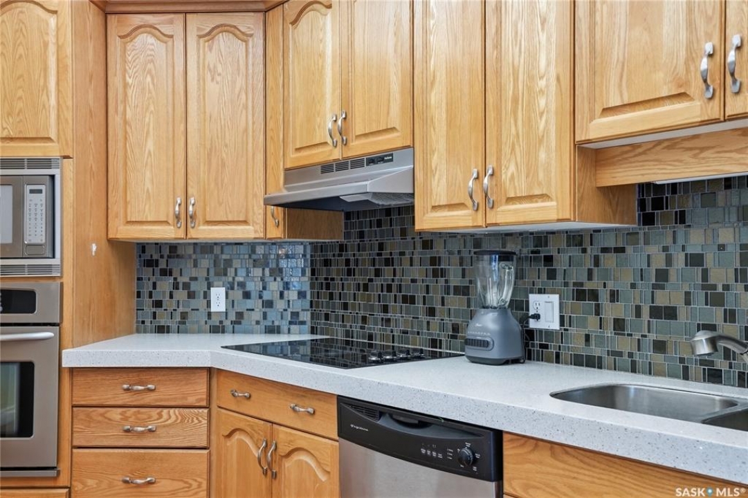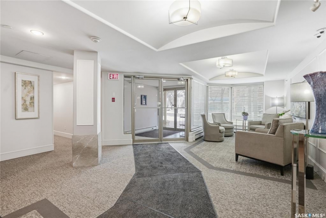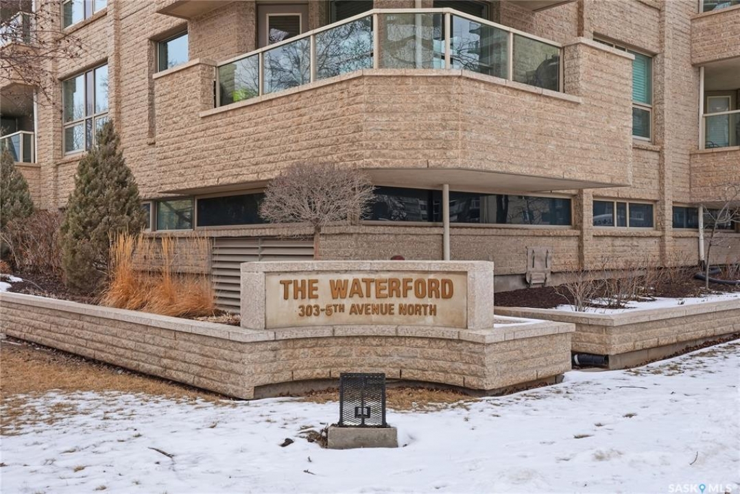 Welcome to Waterford on 5th Avenue North—one of the city's most desirable addresses. Perfectly positioned just a couple blocks from the South Saskatchewan River and Meewasin Trail, this exceptional condo offers the ideal blend of natural beauty and urban convenience. This spacious 2-bedroom, 2-bathroom bungalow-style unit features over 1,100 sq. ft. of refined living space with upscale finishes throughout. The open-concept layout is highlighted by rich hardwood flooring, granite overlay countertops, stunning backsplash, built in appliances and large windows that flood the living area with natural light while the balcony faces the front of the building towards the river. The primary bedroom is a private retreat, complete with a walk-in closet and a 3-piece ensuite. A second bedroom and full bath provide flexibility for guests, family, or a home office. Enjoy the added convenience of in-suite laundry, underground parking, storage #11 and access to a well-appointed amenities room. Step out onto your private balcony to relax and take in the serene surroundings. This condo truly checks all the boxes—style, comfort, and an unbeatable location walking distance to U of S and City Hospital. Don't miss your chance to call it yours.
