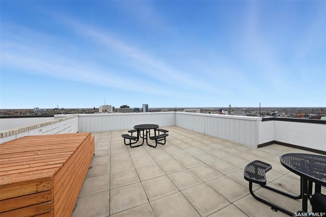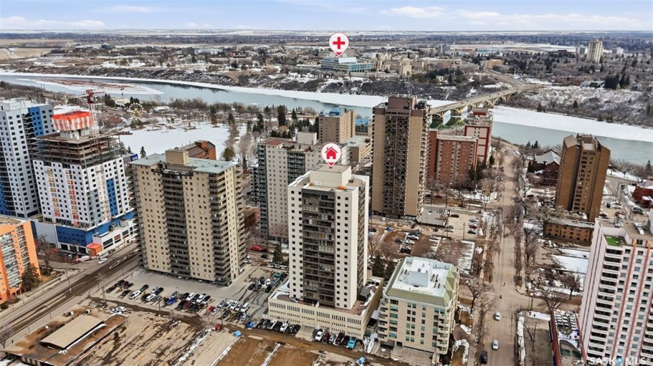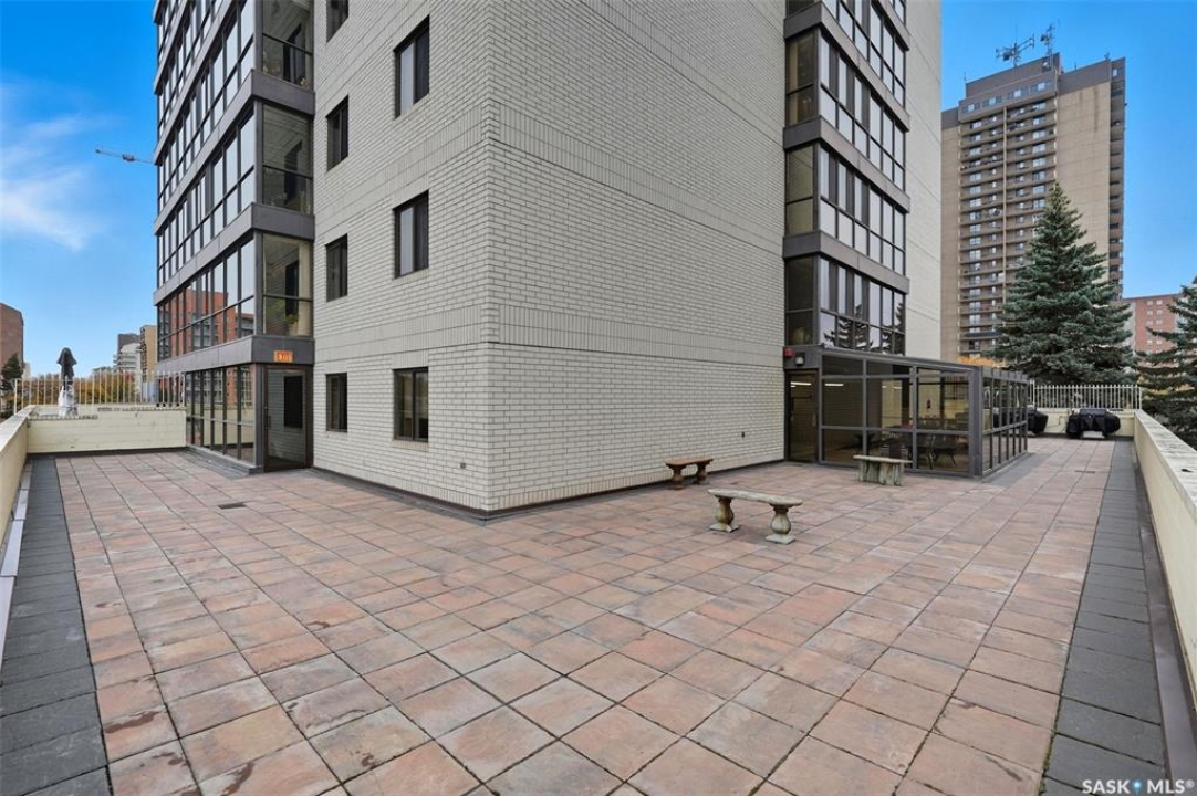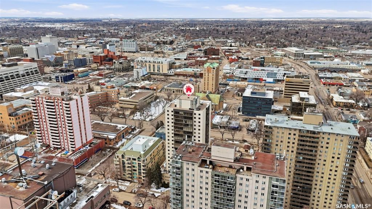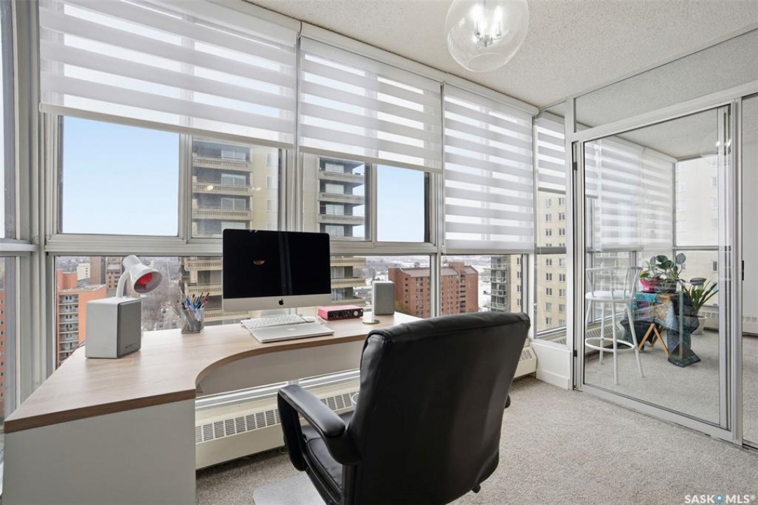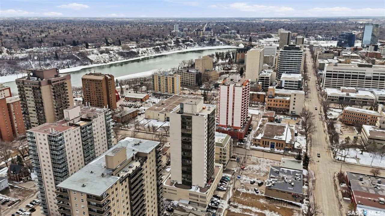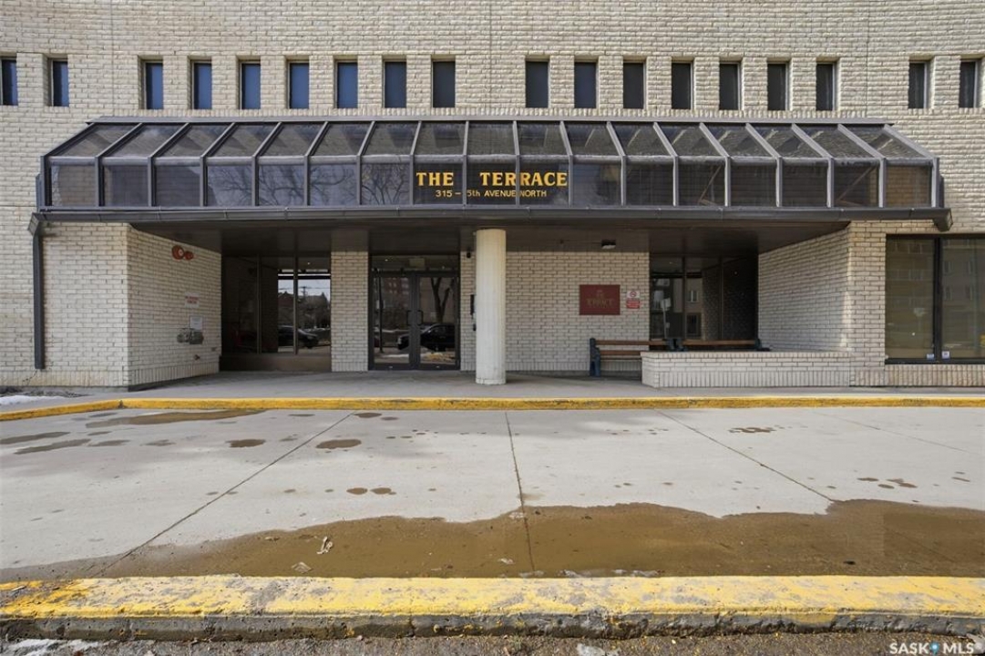 Discover downtown Saskatoon from a lofty vantage point in this beautiful one-bedroom condo on the seventeenth floor of The Terrace on 5th Avenue. Whether you're a professional, a student, or an investor, this suite delivers a lifestyle that is both effortless and secure. Inside this 850 square foot soundproof condo you'll find a modern kitchen, comfortable bathroom, generous living space with expansive windows, and a bedroom with plenty of room for a king-sized bed. A den/office and in-suite laundry along with a good size storage room and mirrored closets add convenience. Keyless entry to both the building and the suite. Then come the building perks—enjoy a swimming pool, hot tub, sauna, rooftop deck, BBQs and a welcoming lounge & terrace. A guest suite is available and a live-in building manager provides added support and security. A private parking spot is included. Condo fees cover air conditioning, heat, water, power and all building maintenance and insurance offering excellent value. Rentals allowed. Step outside and you are moments from Saskatoon's best eateries, pubs, entertainment, and walking/cycling river trails. The University of Saskatchewan as well as Children's and City Hospitals are within easy reach, making this an excellent home base for students, academics, healthcare professionals, and anyone who appreciates the city's cultural core. And only two blocks from the brand new Saskatoon Public Library and the YWCA. Opportunities like this are rare—step into a condo that offers comfort, convenience and security.