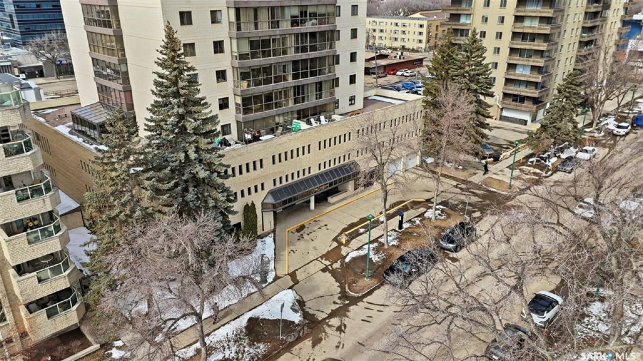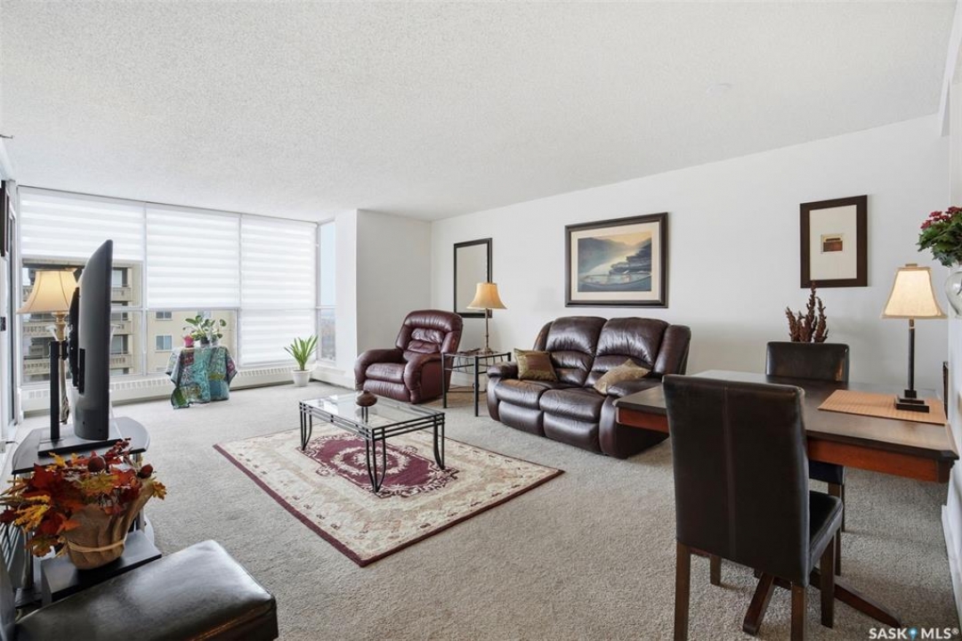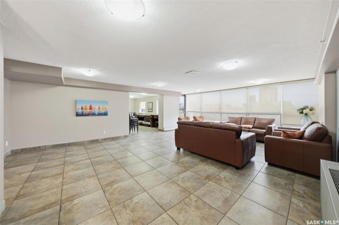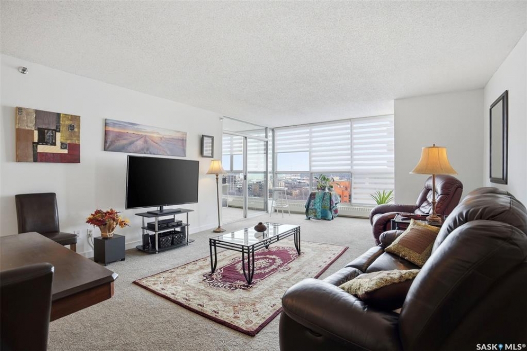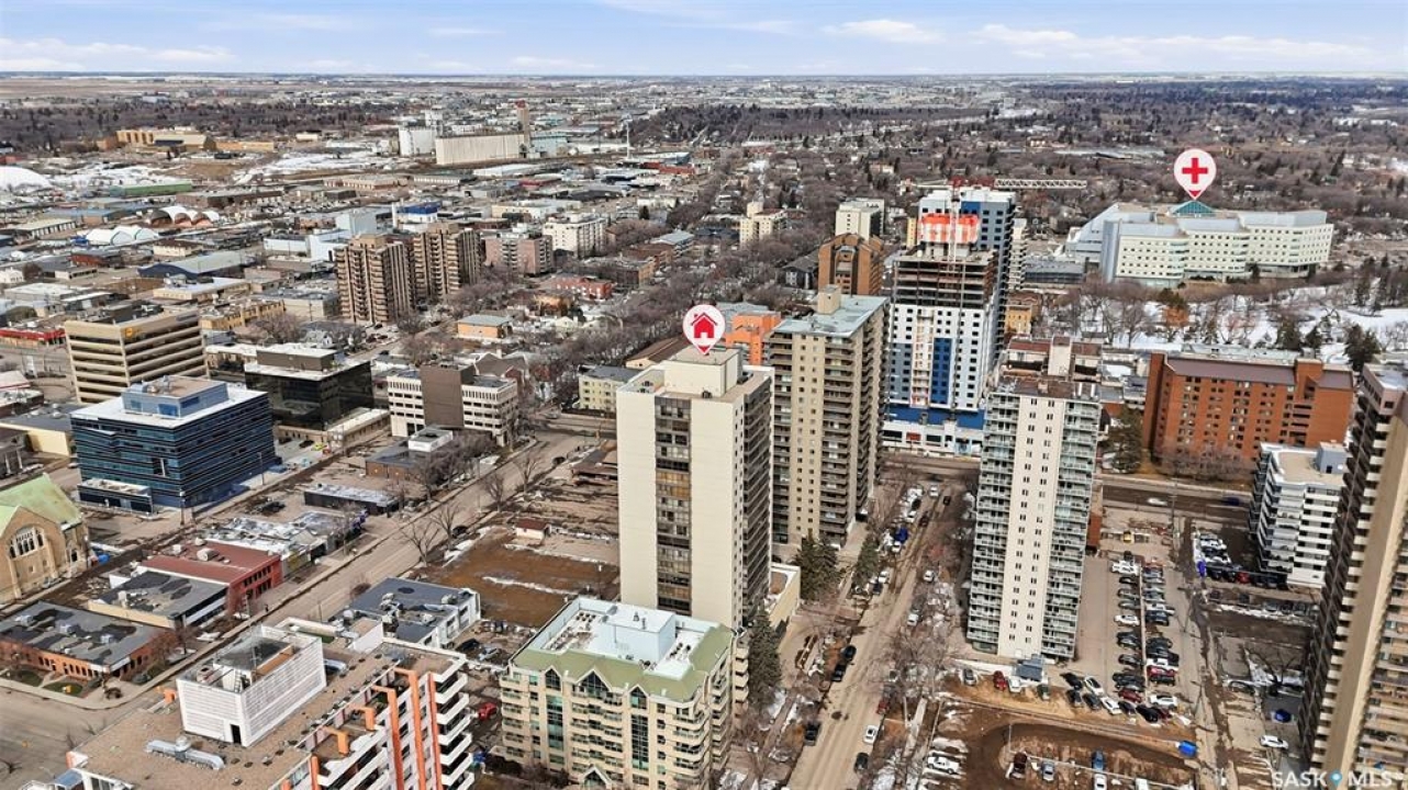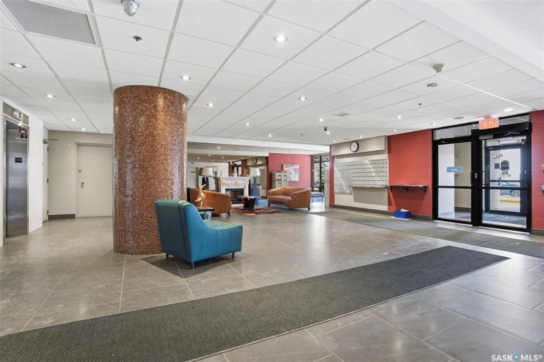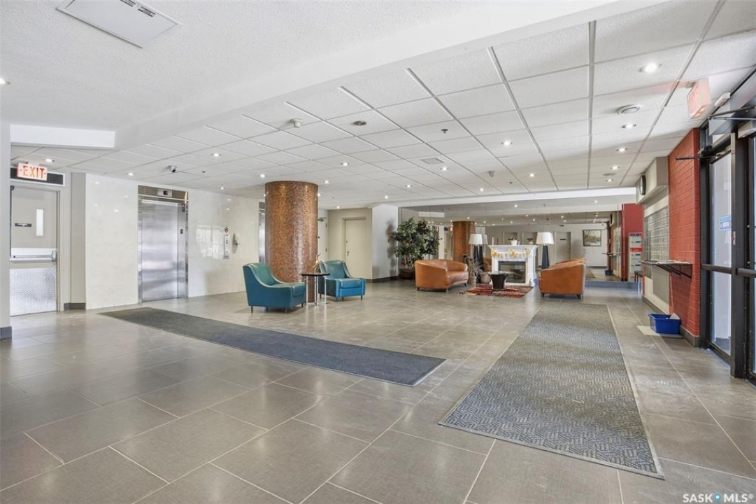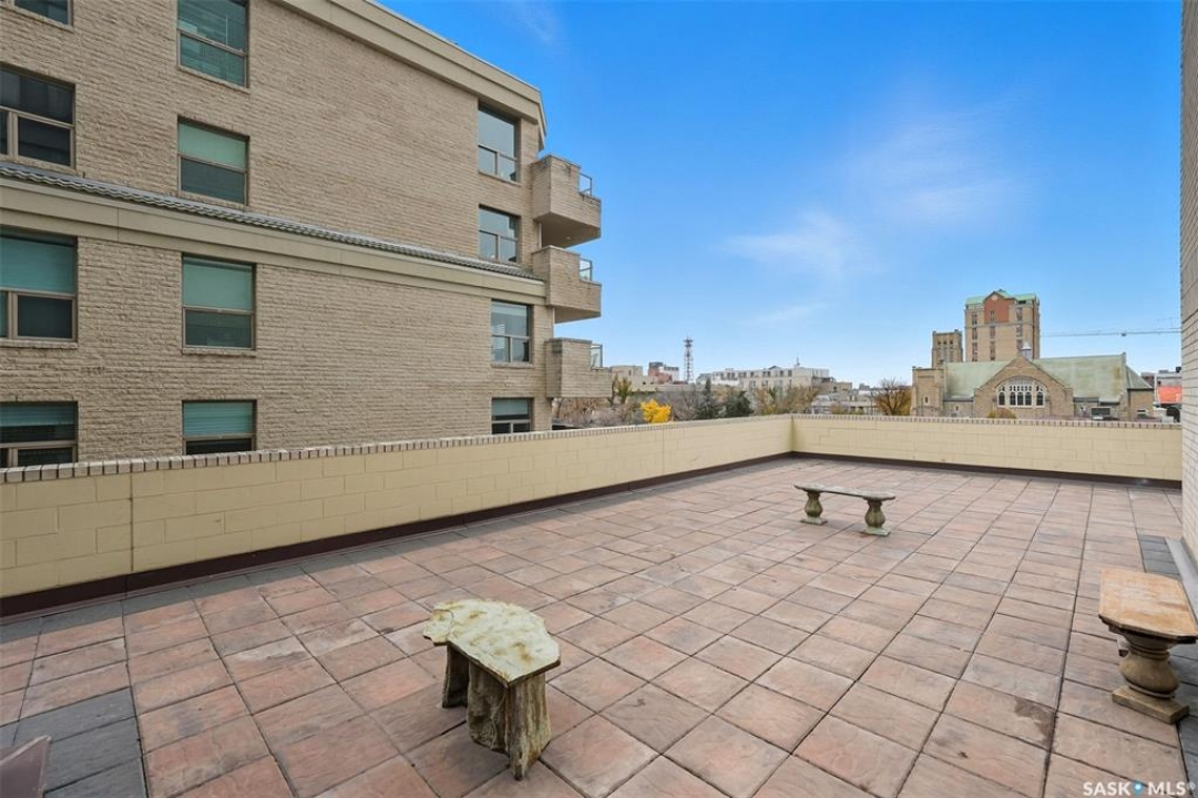 Discover downtown Saskatoon from a lofty vantage point in this beautiful one-bedroom condo on the seventeenth floor of The Terrace on 5th Avenue. Whether you're a professional, a student, or an investor, this suite delivers a lifestyle that is both effortless and secure. Inside this 850 square foot soundproof condo you'll find a modern kitchen, comfortable bathroom, generous living space with expansive windows, and a bedroom with plenty of room for a king-sized bed. A den/office and in-suite laundry along with a good size storage room and mirrored closets add convenience. Keyless entry to both the building and the suite. Then come the building perks—enjoy a swimming pool, hot tub, sauna, rooftop deck, BBQs and a welcoming lounge & terrace. A guest suite is available and a live-in building manager provides added support and security. A private parking spot is included. Condo fees cover air conditioning, heat, water, power and all building maintenance and insurance offering excellent value. Rentals allowed. Step outside and you are moments from Saskatoon's best eateries, pubs, entertainment, and walking/cycling river trails. The University of Saskatchewan as well as Children's and City Hospitals are within easy reach, making this an excellent home base for students, academics, healthcare professionals, and anyone who appreciates the city's cultural core. And only two blocks from the brand new Saskatoon Public Library and the YWCA. Opportunities like this are rare—step into a condo that offers comfort, convenience and security.