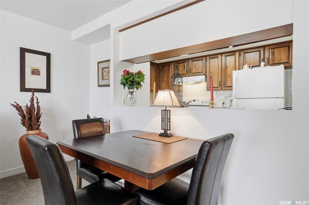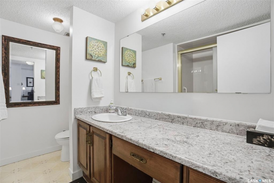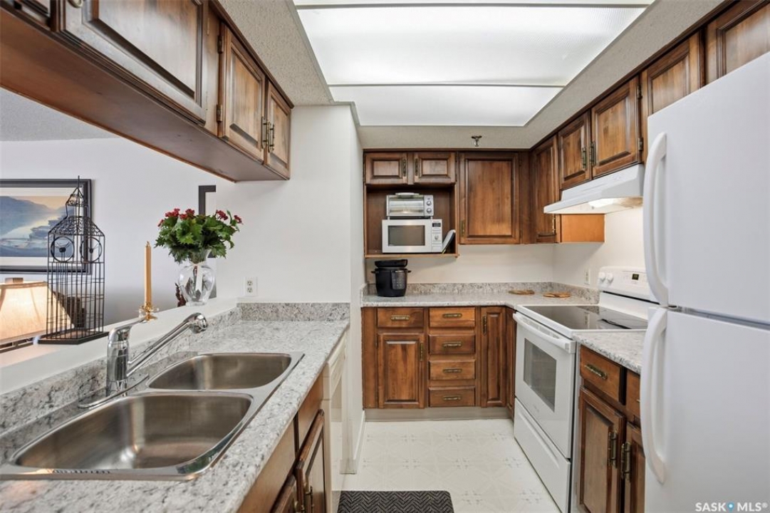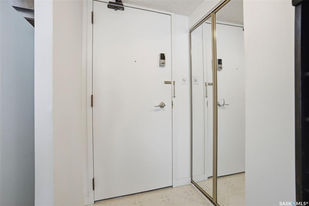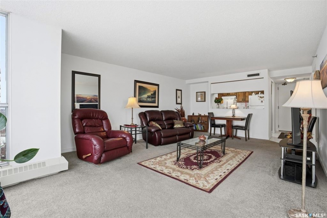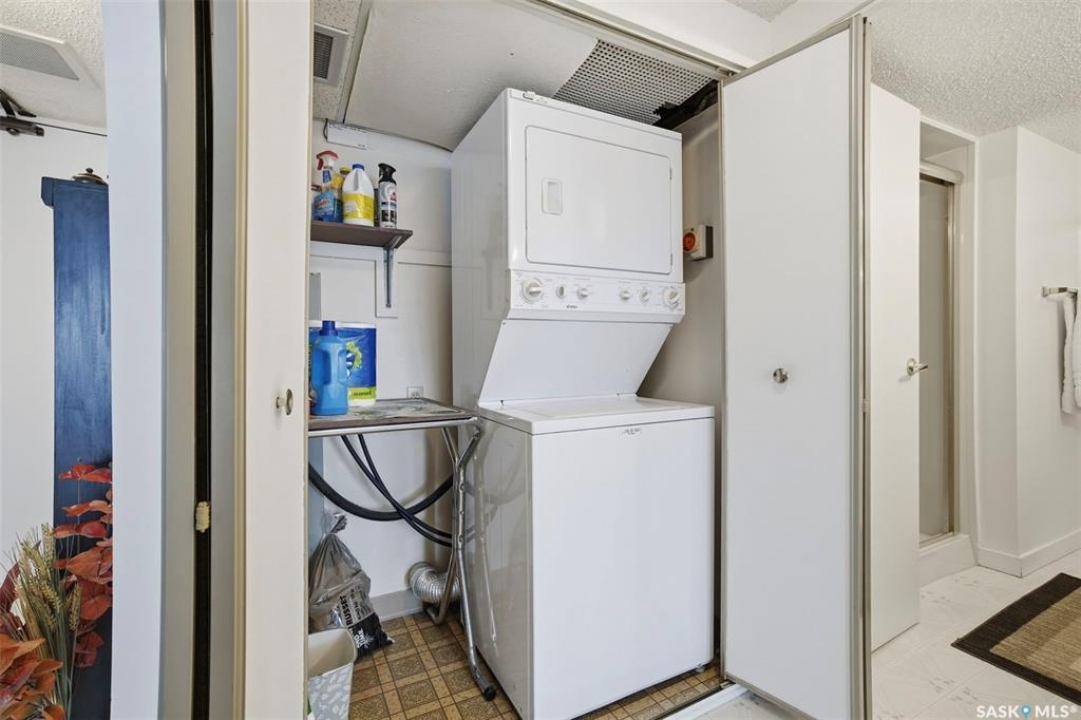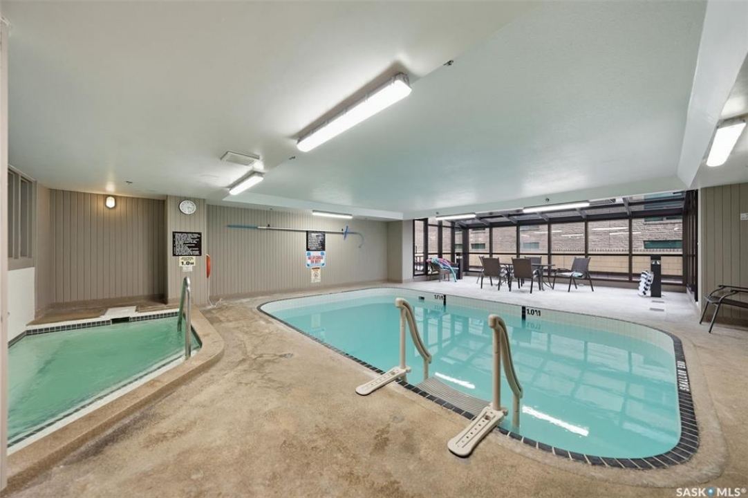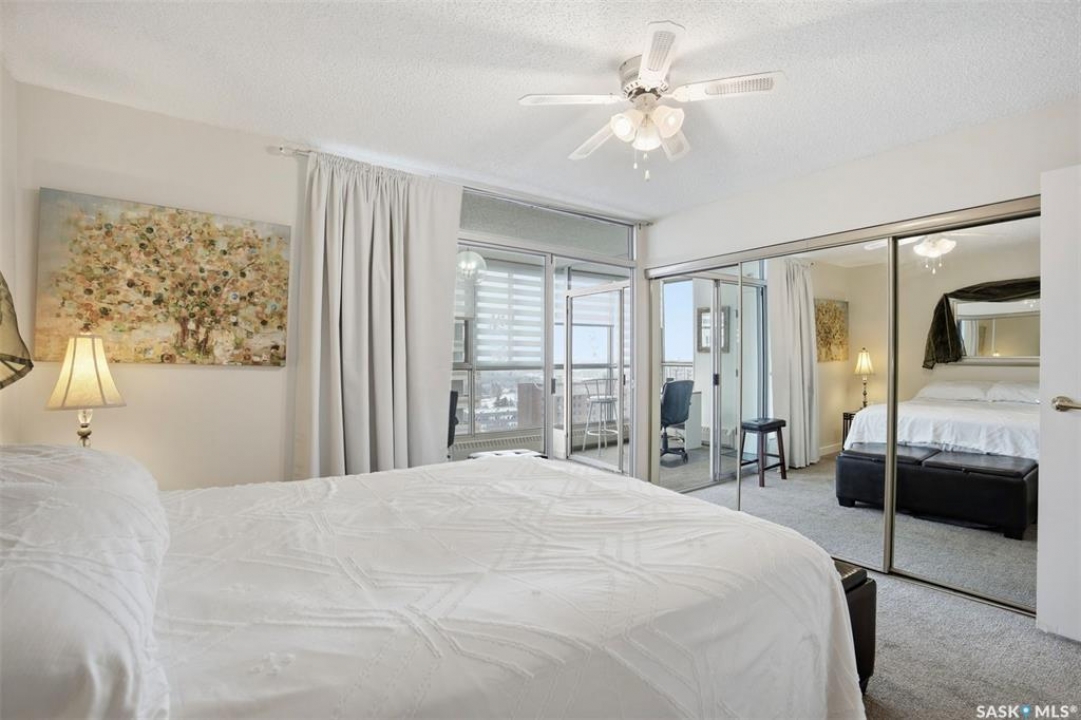 Discover downtown Saskatoon from a lofty vantage point in this beautiful one-bedroom condo on the seventeenth floor of The Terrace on 5th Avenue. Whether you're a professional, a student, or an investor, this suite delivers a lifestyle that is both effortless and secure. Inside this 850 square foot soundproof condo you'll find a modern kitchen, comfortable bathroom, generous living space with expansive windows, and a bedroom with plenty of room for a king-sized bed. A den/office and in-suite laundry along with a good size storage room and mirrored closets add convenience. Keyless entry to both the building and the suite. Then come the building perks—enjoy a swimming pool, hot tub, sauna, rooftop deck, BBQs and a welcoming lounge & terrace. A guest suite is available and a live-in building manager provides added support and security. A private parking spot is included. Condo fees cover air conditioning, heat, water, power and all building maintenance and insurance offering excellent value. Rentals allowed. Step outside and you are moments from Saskatoon's best eateries, pubs, entertainment, and walking/cycling river trails. The University of Saskatchewan as well as Children's and City Hospitals are within easy reach, making this an excellent home base for students, academics, healthcare professionals, and anyone who appreciates the city's cultural core. And only two blocks from the brand new Saskatoon Public Library and the YWCA. Opportunities like this are rare—step into a condo that offers comfort, convenience and security.