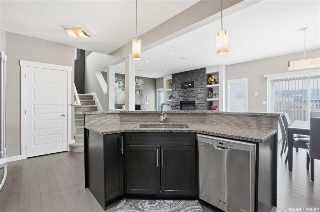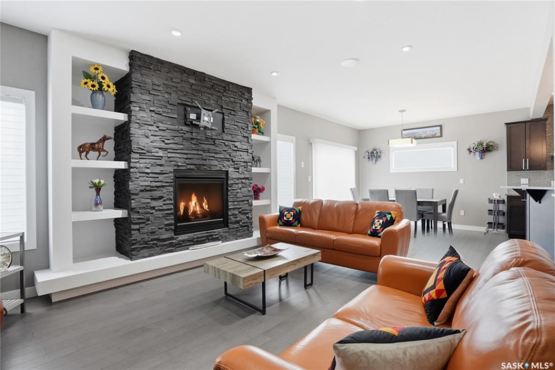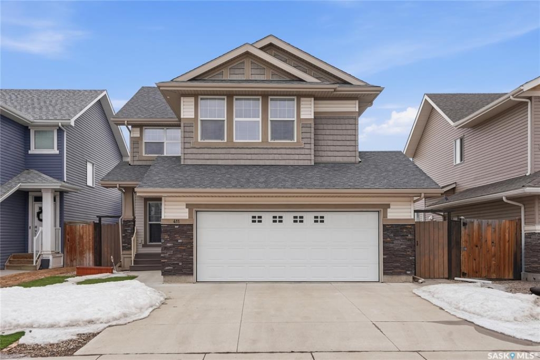 Welcome to 411 Flynn Lane, where thoughtful design and elevated finishes come together in one of Rosewood's most sought after locations, just steps from both public and Catholic schools. Offering over 2,200 sq ft, this home stands out with its curb appeal, low maintenance turf, and covered composite entry. Inside, you'll find engineered hardwood flooring, 9 foot ceilings, and a bright, functional layout with a private main floor den and a beautifully finished kitchen featuring granite countertops, soft close cabinetry, a walk-in pantry, and a large island that anchors the space. The living room is centered around a gas fireplace, creating a warm and inviting focal point, while the dining area opens seamlessly to the backyard and professionally landscaped yard backing the schools. Upstairs, the primary suite offers a vaulted ceiling, a spacious walk in closet, and a well appointed five piece ensuite. Three additional bedrooms, a full bathroom with double vanity, a bonus room, and a convenient second floor laundry room provide the ideal family layout. The professionally developed basement adds even more living space with a sound insulated theatre room wired for projector and surround sound, a bedroom, a full bathroom, gym or flex space, and generous storage. Additional features include central air conditioning, built-in speakers, central vac, triple pane windows, Hunter Douglas blinds, and custom MDF shelving throughout the home, along with a fully finished oversized garage. This is a move-in ready home that offers a rare combination of quality, function, and location.