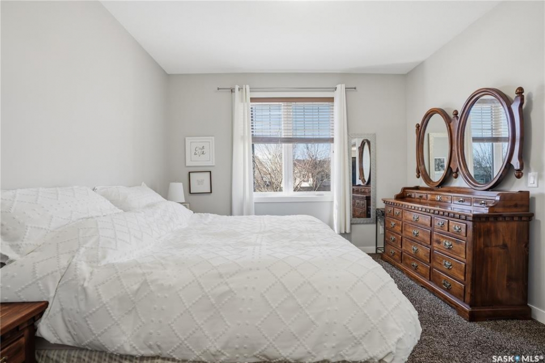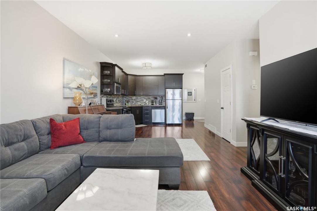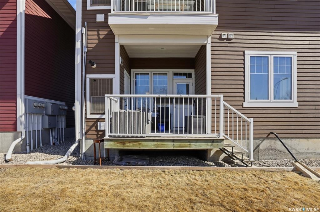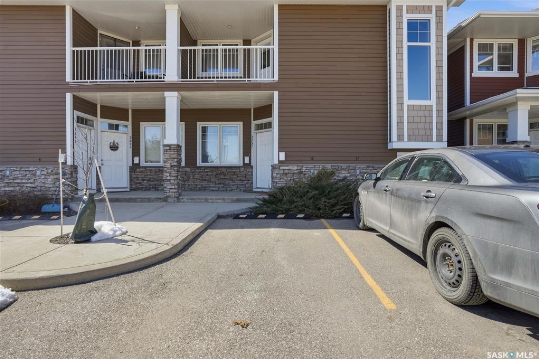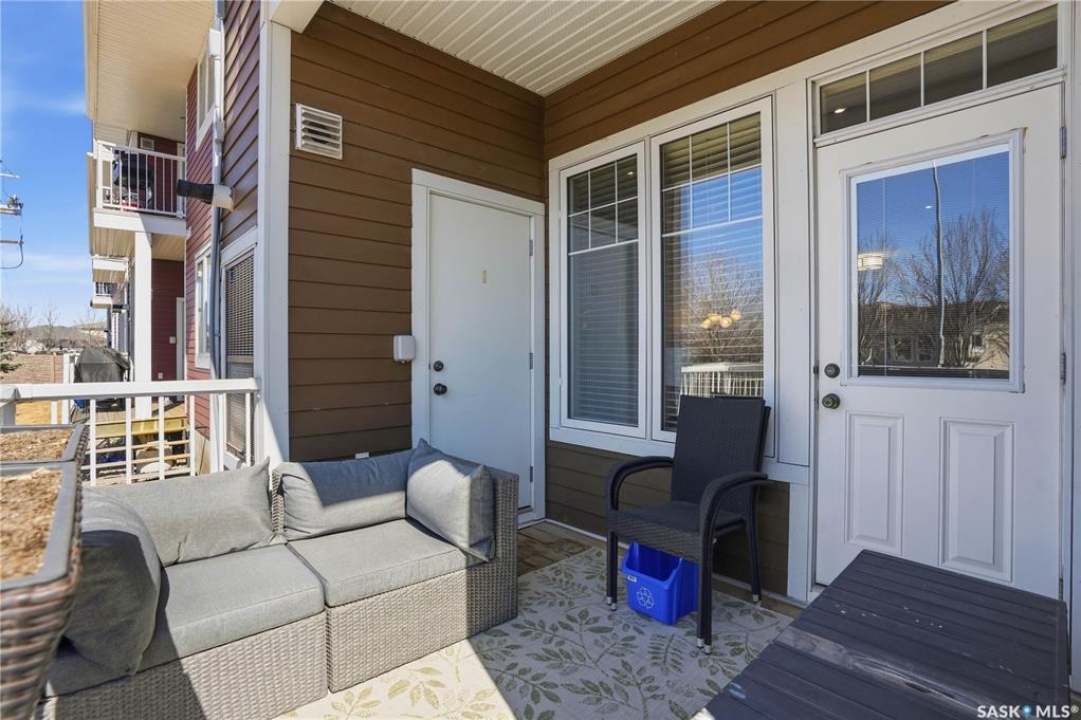 Welcome to this 2 bedroom condo located at 3237 Green Bank Road. This exceptionally clean, practical, with TWO parking spots, move-in-ready 829 sq ft condo offers low-maintenance living in one of Regina's most sought-after east end neighbourhoods, The Greens on Gardiner. Located on the main level with an west/east configuration, this unit features an open-concept layout enhanced by 9' ceilings allowing a natural flow from room to room without restricting walls or different flooring. This condo allows for a smart & seamless weaving of the living spaces. The kitchen offers espresso-stained maple cabinetry, a tile backsplash, & generous space for an island, eat up bar, & dining area (if desired). Along the wall is a closet that is perfect for a pantry. A spacious living room is bright with the afternoon sun & provides access to a cozy deck & no back neighbors. The deck has a utility room with the owned on-demand water heater, furnace, & room for storage. A bonus is the natural gas BBQ hookup. The large primary bedroom easily accommodates a king-size bed, furniture, & is positioned at the back & includes a well-designed, oversized walk-in closet. As well, you'll find the hatch to the FULL concrete crawl space that is clean, dry, & solid - this is great space beneath the entire unit & ideal for extensive storage. A second bedroom at the front is a versatile room that can function as a bedroom, office, yoga room, or studio. The full bathroom has a large vanity, new washer & dryer (Fall '25) & with access from the primary bedroom, it offers great functionality, too! 3237 Green Bank Rd has a fabulous location & is tucked away into the residential area of The Greens neighborhood, the location is super! A huge bonus: 2 titled parking (electrical) stalls, #33 & #42, & visitor parking on both sides of the common area. Walking paths, parks, shopping, restaurants, & schools are all close by. Condo fees are reasonable $215.21/month. This is truly a move in ready condo!