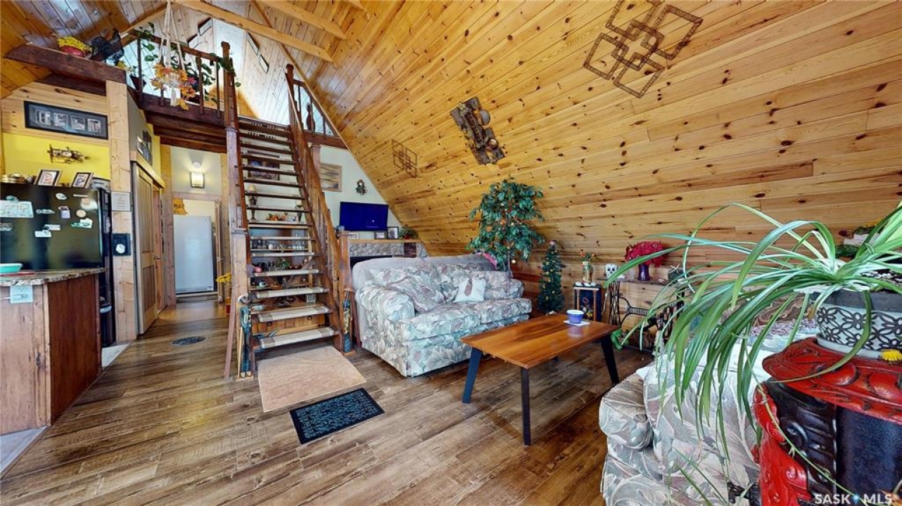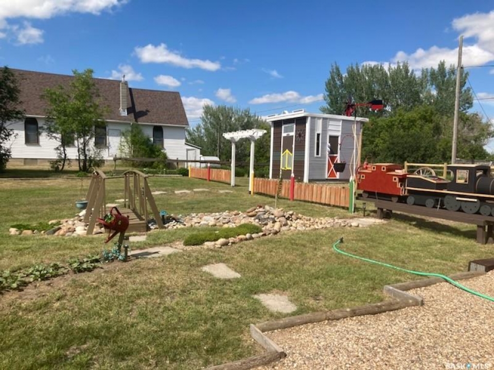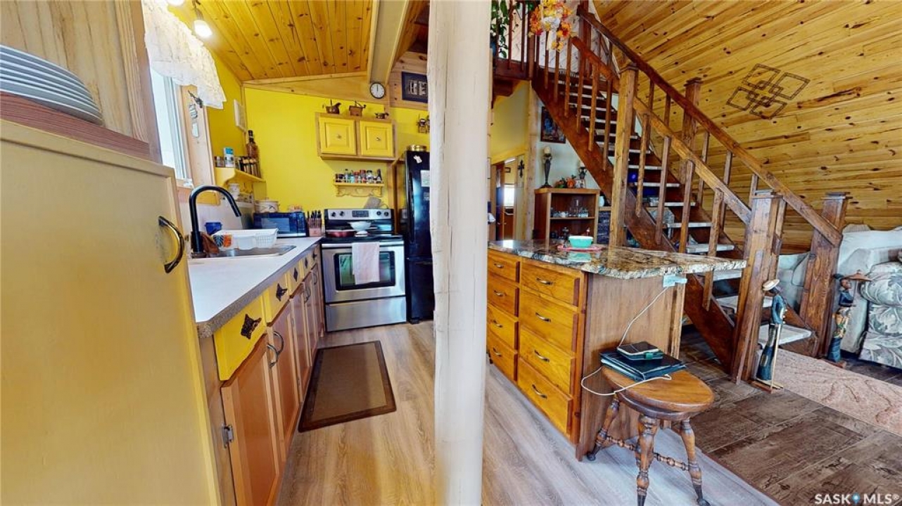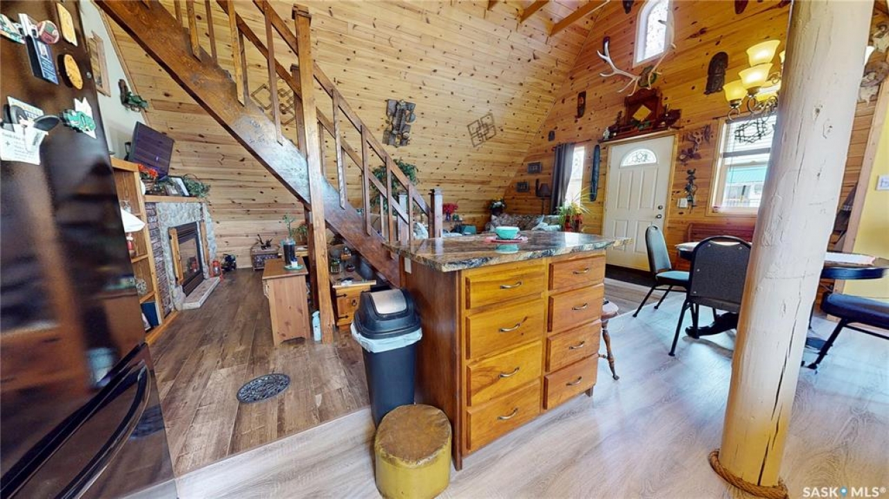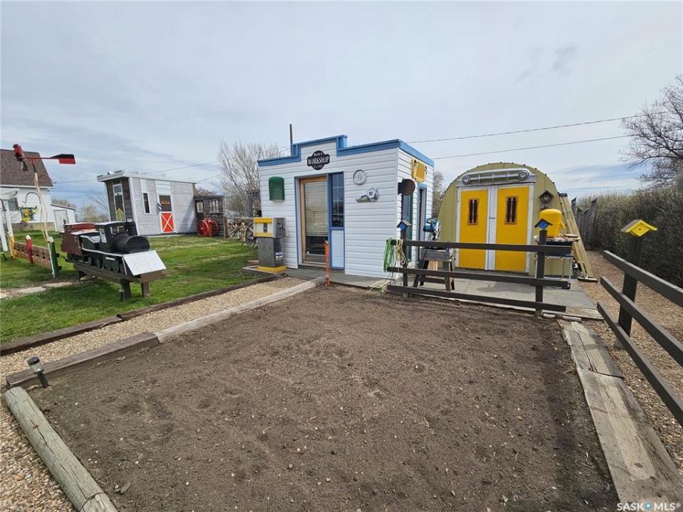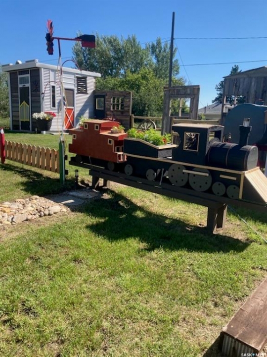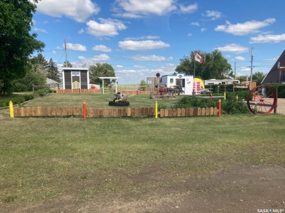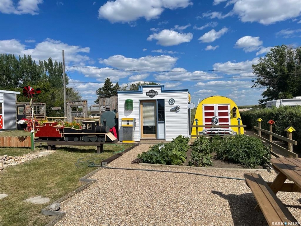 Escape to your own cottage retreat in Southwest Saskatchewan—without the cabin price tag. This charming A-frame in Tompkins offers cozy comfort and open-concept living, featuring a bright kitchen with island, inviting living space with a stone-accented gas fireplace, and a peaceful loft ideal for guests or creative space. The main floor bedroom has plenty of room and offers a spacious closet with storage space above. The bathroom is a picture of relaxation, featuring a generous tub for soaking, complimented by natural wood accents. The laundry/utility room has high ceilings and ample space for shelving. Set on a generous 150 X 122 corner lot, the property includes a covered deck, and unique outbuildings that have endless possibilities as storage, man caves, or studio space. The garden area is well established with plenty of room to expand. Every corner of this property, both inside and out, has been meticulously designed to maximize space and comfort. This property also offers an opportunity to get into the Air-BnB business. Located central to the Cypress Hills Destination Area, just off the No. 1 highway, everything is ready, and sellers would consider leaving some furniture to get you started. Whether you're looking for a weekend getaway, business opportunity or year-round retreat, this one delivers the cabin lifestyle—at an affordable price.