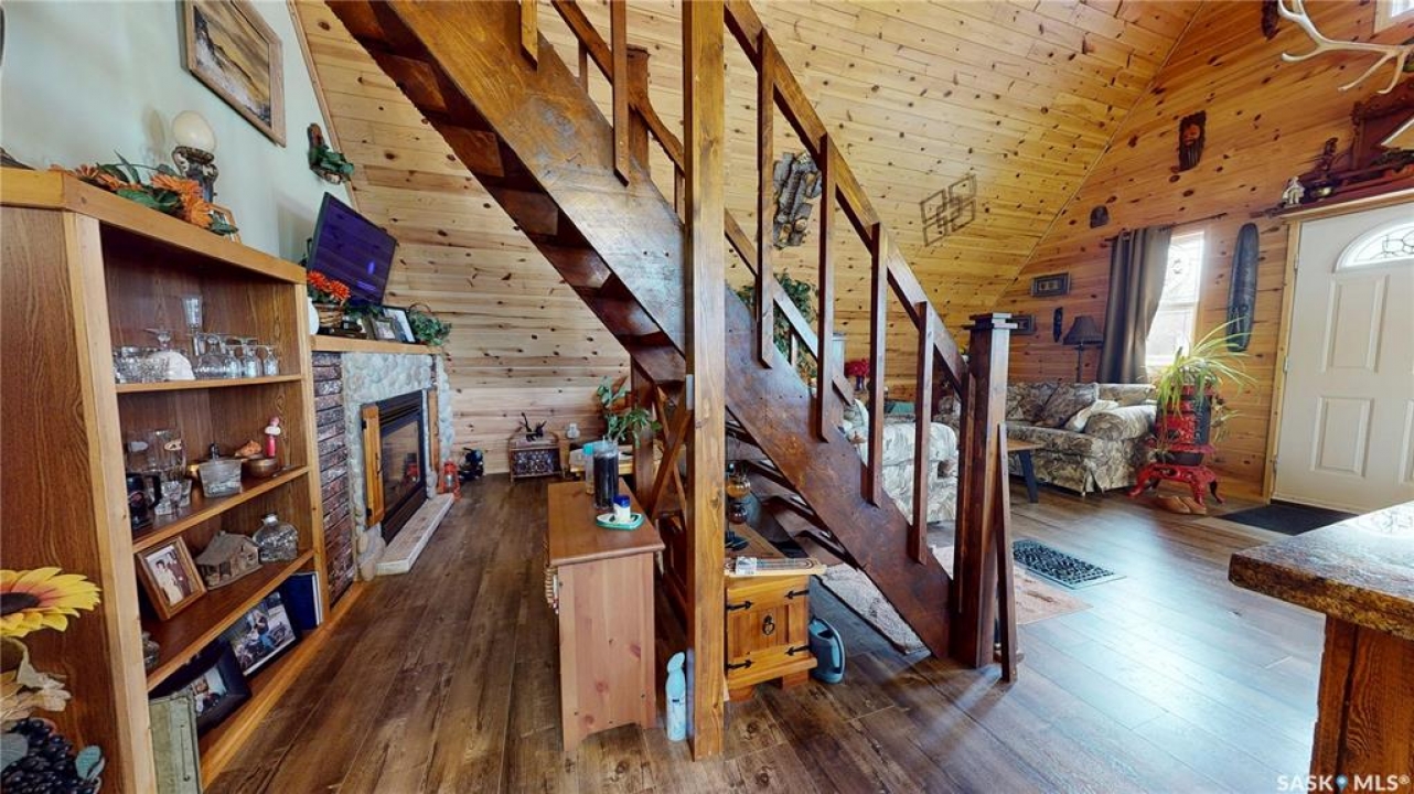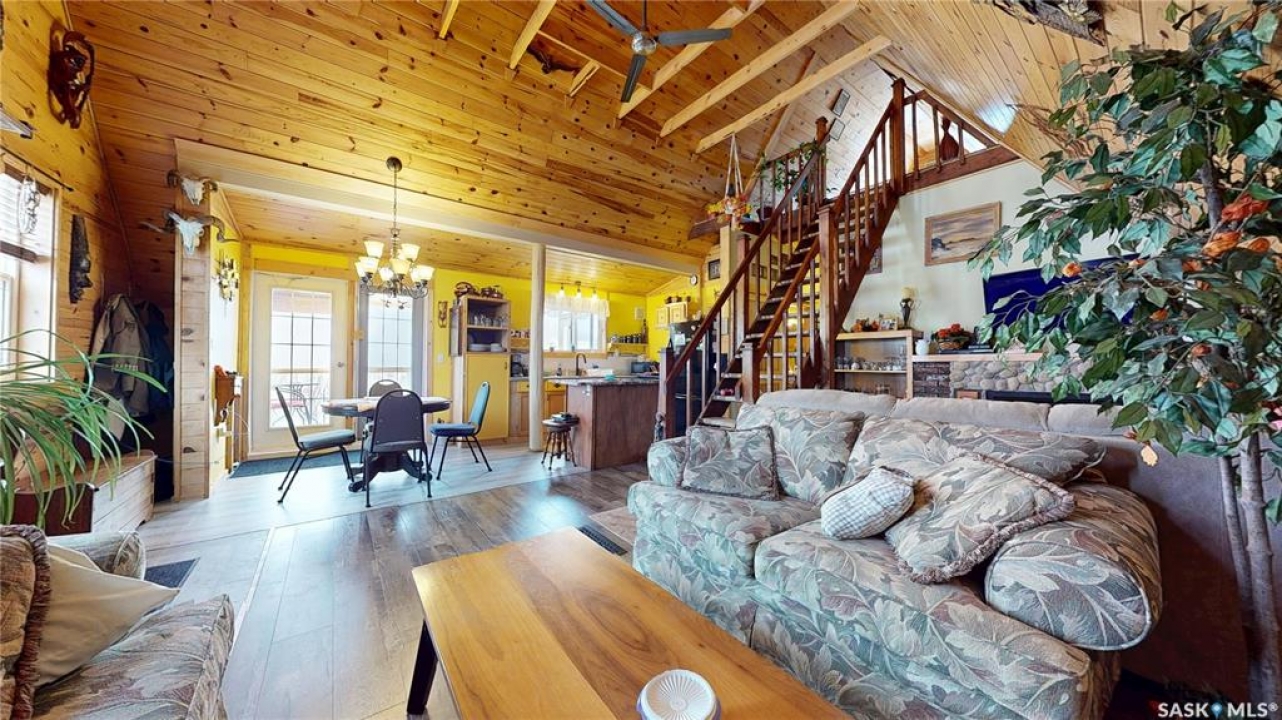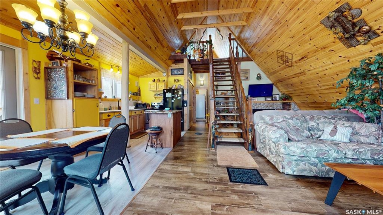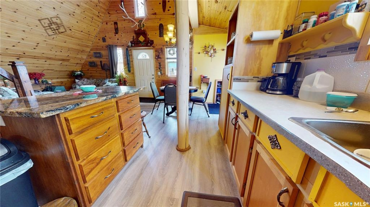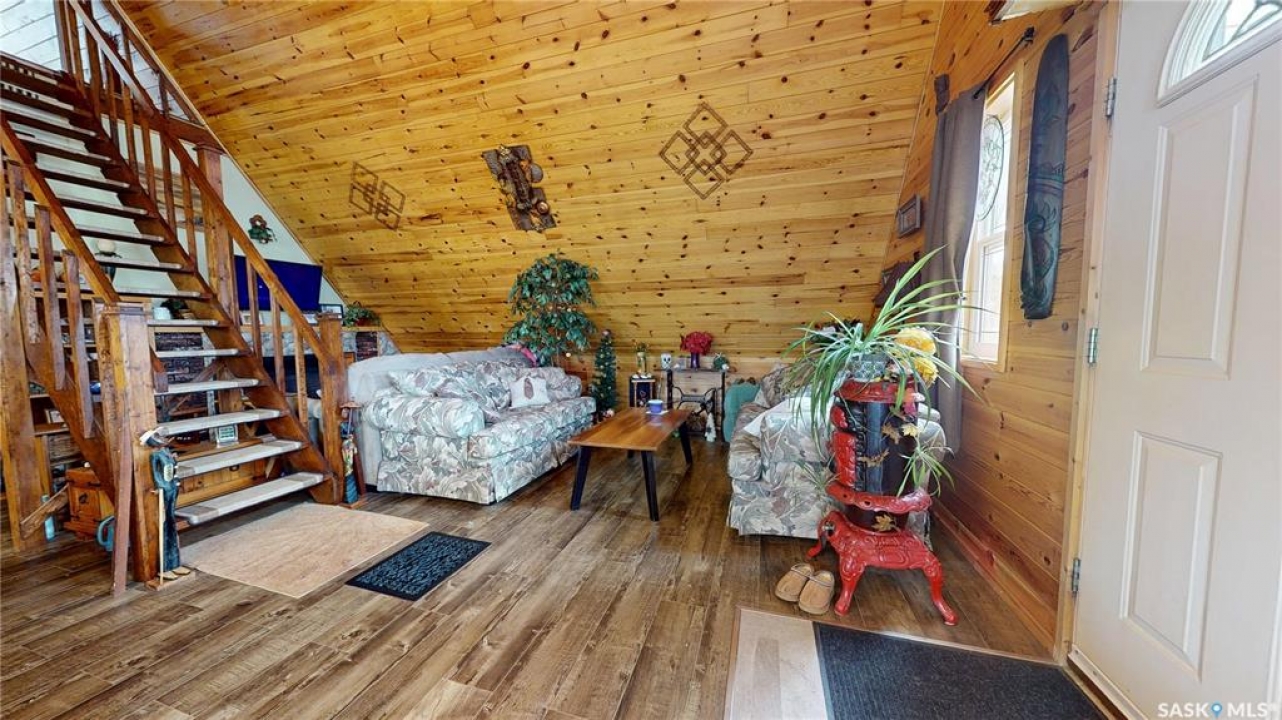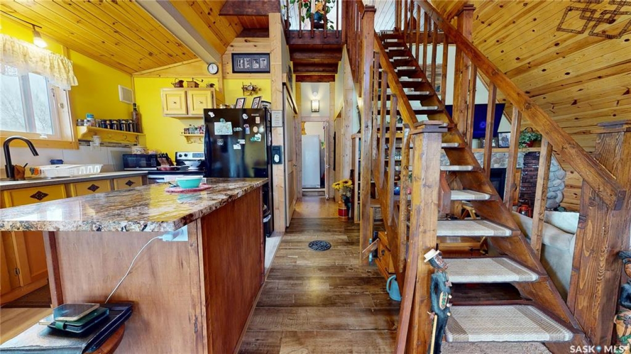 Escape to your own cottage retreat in Southwest Saskatchewan—without the cabin price tag. This charming A-frame in Tompkins offers cozy comfort and open-concept living, featuring a bright kitchen with island, inviting living space with a stone-accented gas fireplace, and a peaceful loft ideal for guests or creative space. The main floor bedroom has plenty of room and offers a spacious closet with storage space above. The bathroom is a picture of relaxation, featuring a generous tub for soaking, complimented by natural wood accents. The laundry/utility room has high ceilings and ample space for shelving. Set on a generous 150 X 122 corner lot, the property includes a covered deck, and unique outbuildings that have endless possibilities as storage, man caves, or studio space. The garden area is well established with plenty of room to expand. Every corner of this property, both inside and out, has been meticulously designed to maximize space and comfort. This property also offers an opportunity to get into the Air-BnB business. Located central to the Cypress Hills Destination Area, just off the No. 1 highway, everything is ready, and sellers would consider leaving some furniture to get you started. Whether you're looking for a weekend getaway, business opportunity or year-round retreat, this one delivers the cabin lifestyle—at an affordable price.