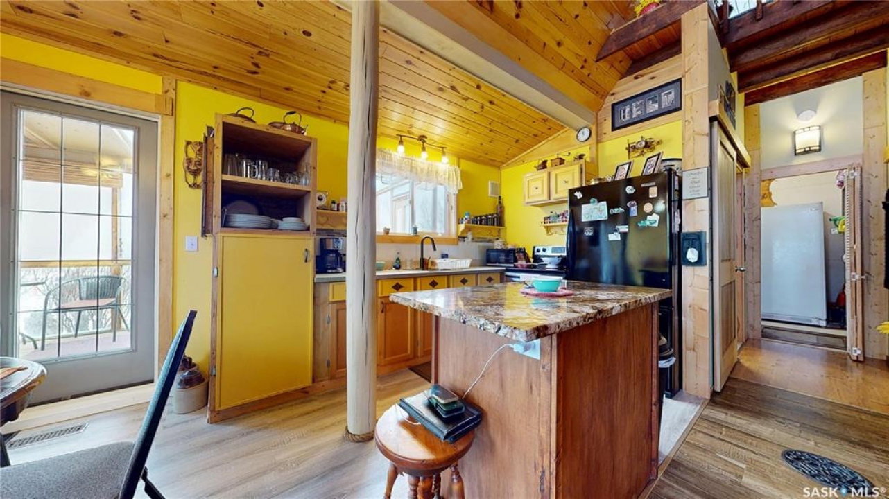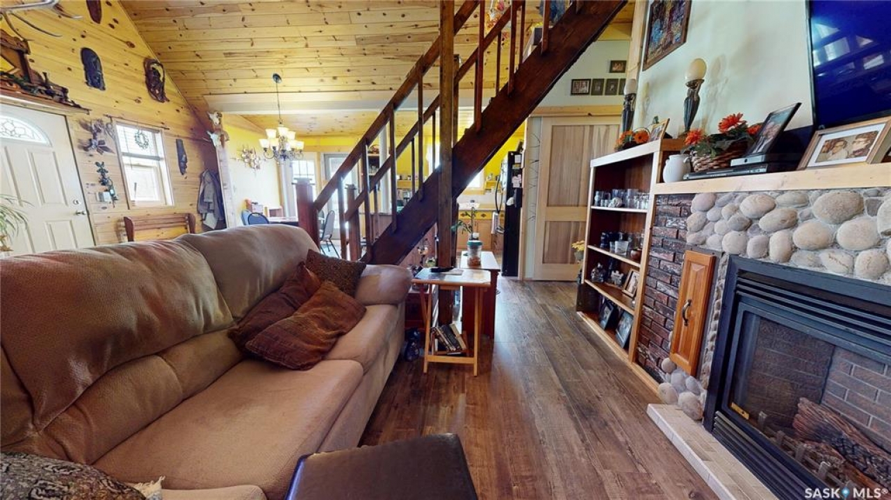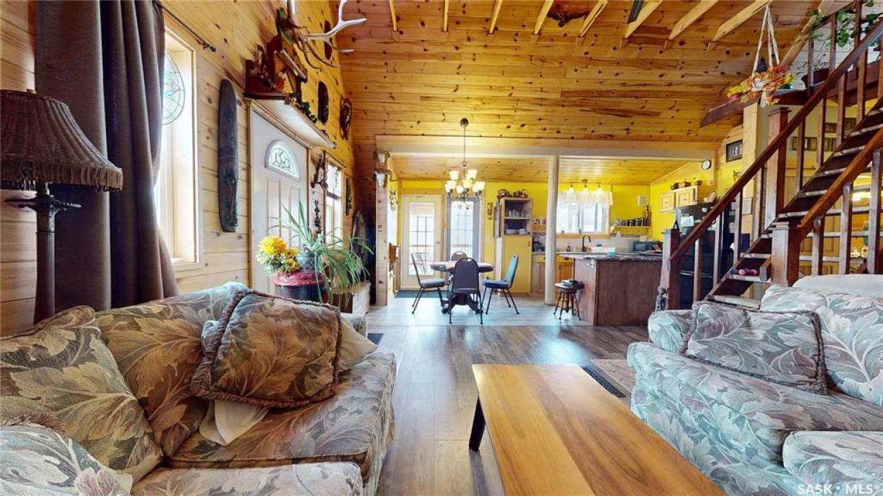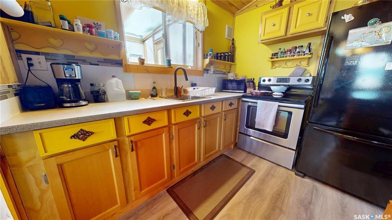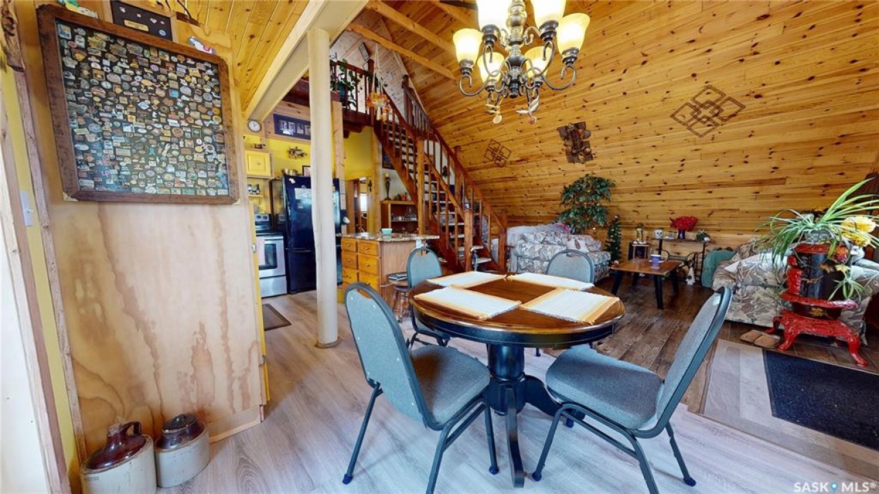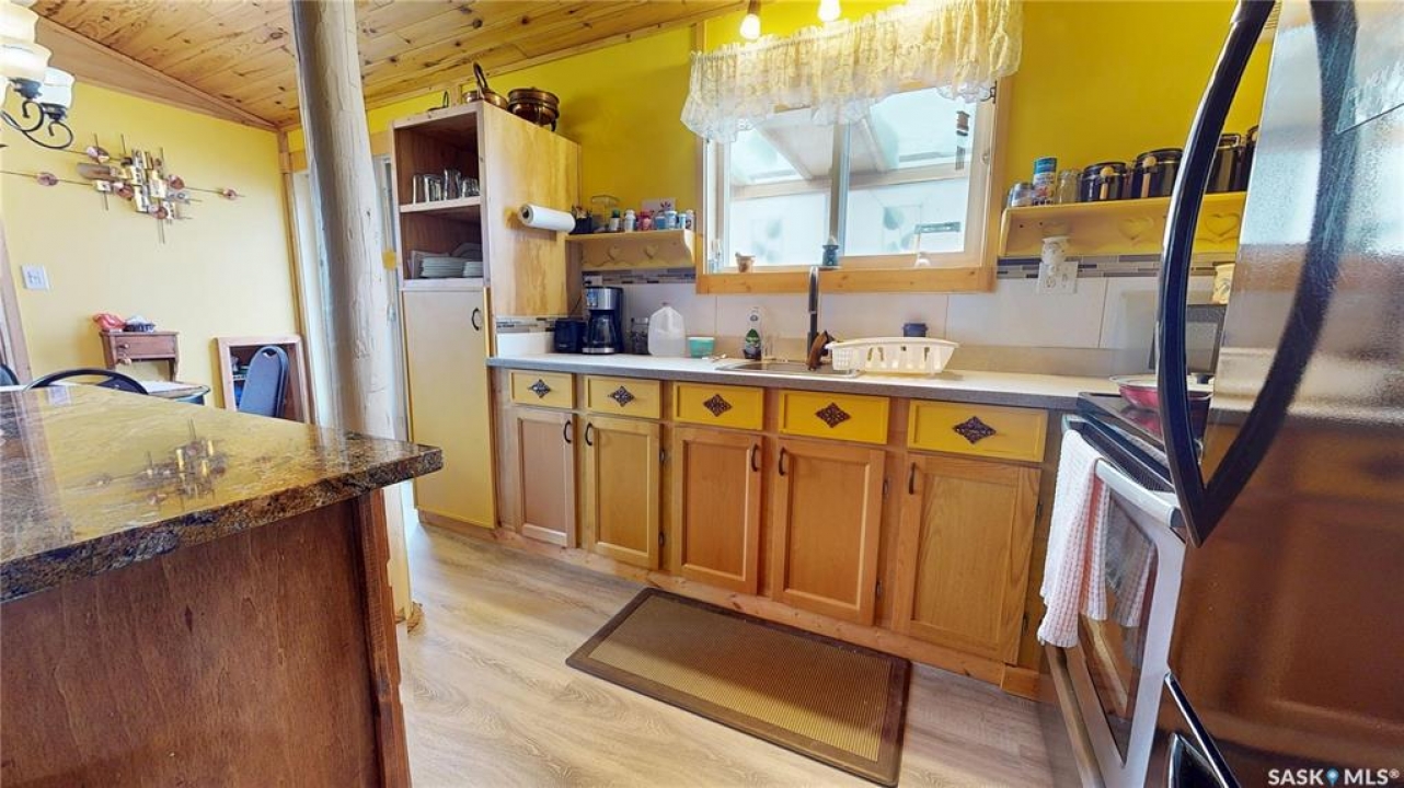 Escape to your own cottage retreat in Southwest Saskatchewan—without the cabin price tag. This charming A-frame in Tompkins offers cozy comfort and open-concept living, featuring a bright kitchen with island, inviting living space with a stone-accented gas fireplace, and a peaceful loft ideal for guests or creative space. The main floor bedroom has plenty of room and offers a spacious closet with storage space above. The bathroom is a picture of relaxation, featuring a generous tub for soaking, complimented by natural wood accents. The laundry/utility room has high ceilings and ample space for shelving. Set on a generous 150 X 122 corner lot, the property includes a covered deck, and unique outbuildings that have endless possibilities as storage, man caves, or studio space. The garden area is well established with plenty of room to expand. Every corner of this property, both inside and out, has been meticulously designed to maximize space and comfort. This property also offers an opportunity to get into the Air-BnB business. Located central to the Cypress Hills Destination Area, just off the No. 1 highway, everything is ready, and sellers would consider leaving some furniture to get you started. Whether you're looking for a weekend getaway, business opportunity or year-round retreat, this one delivers the cabin lifestyle—at an affordable price.