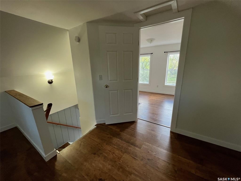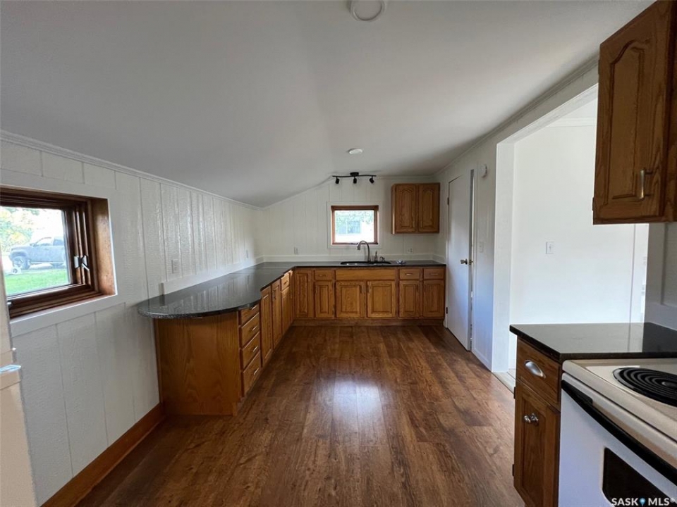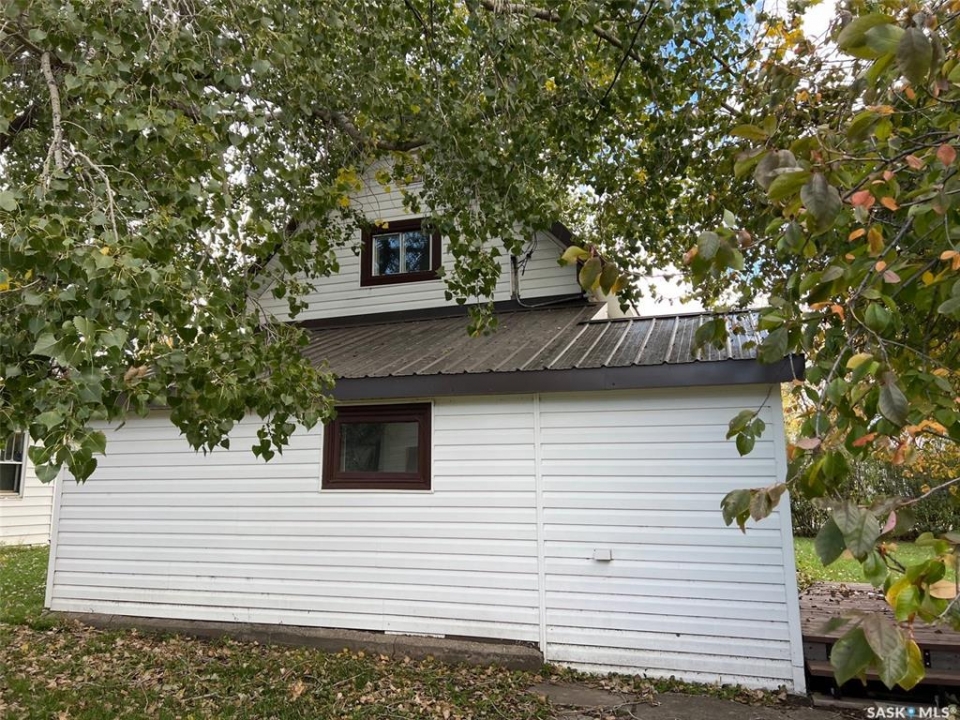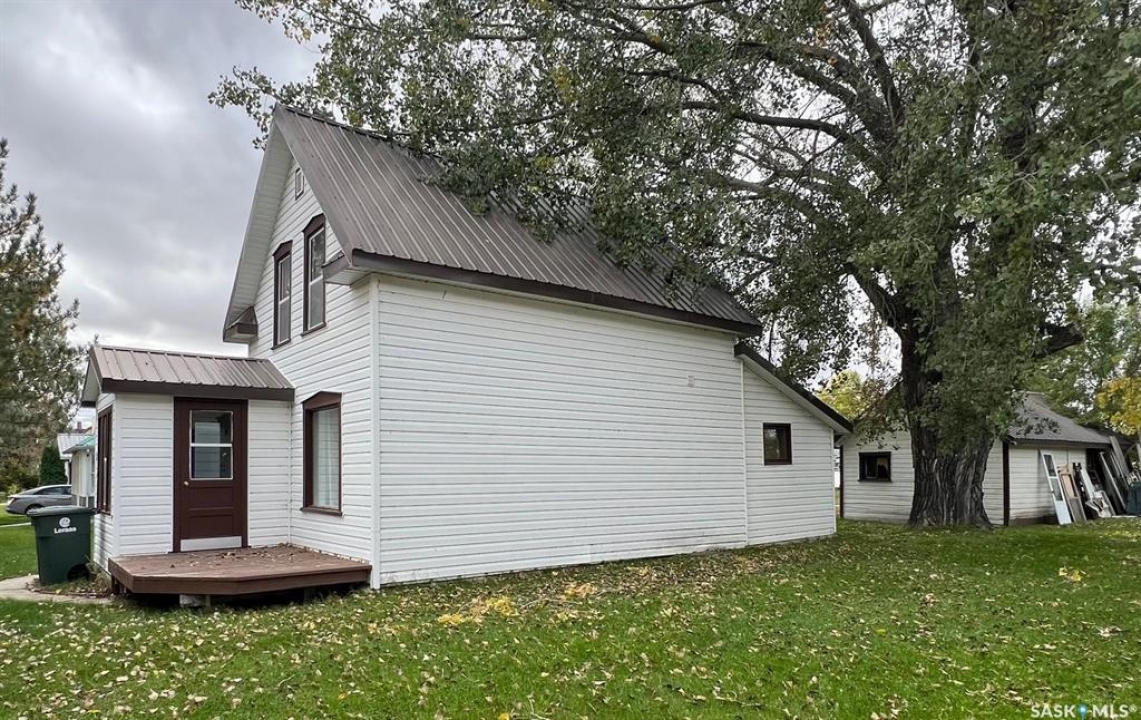 Located in Wilkie is the 1 1/2 storey home. Renovated 2 bedroom home with good workmanship. Main level has large kitchen with quartz countertop, oak cabinets, fridge & stove, cozy living room with gas stove, bright dining area, and laundry. Front and back porch. Second level has 2 bedrooms. Metal roof, vinyl siding, metal soffits. 11x25 shed in treed backyard.