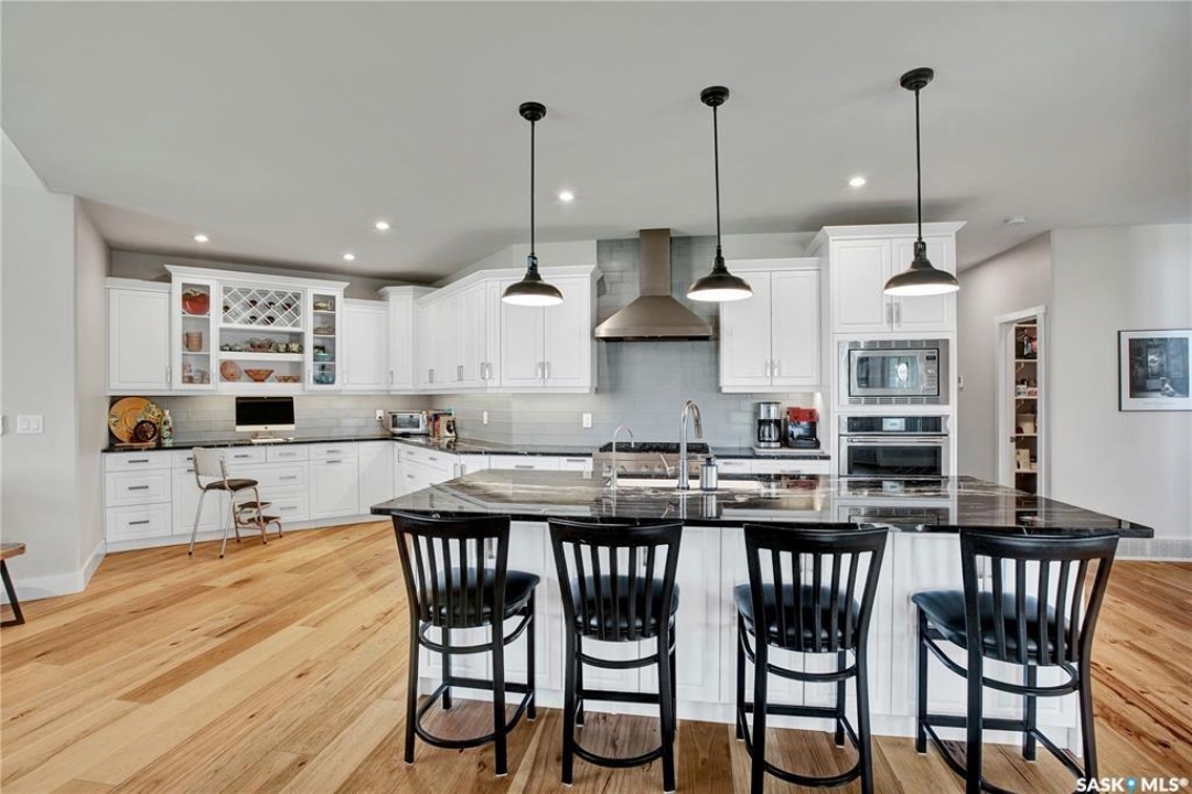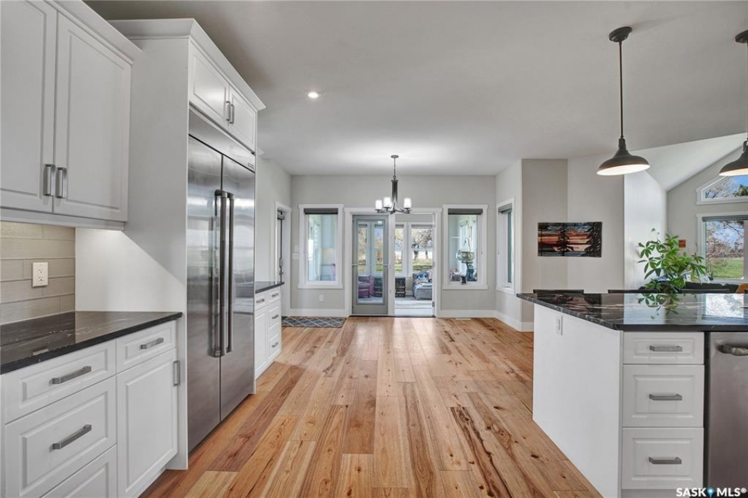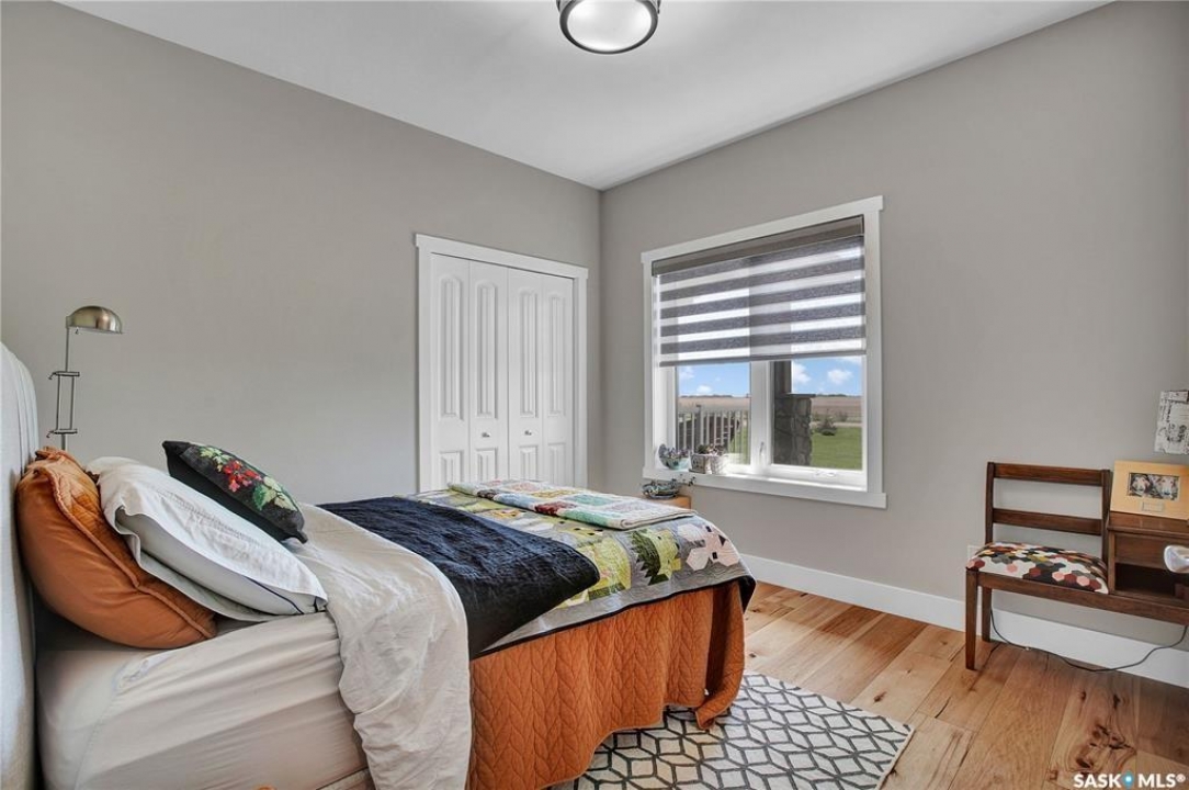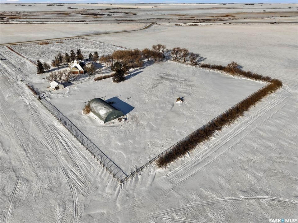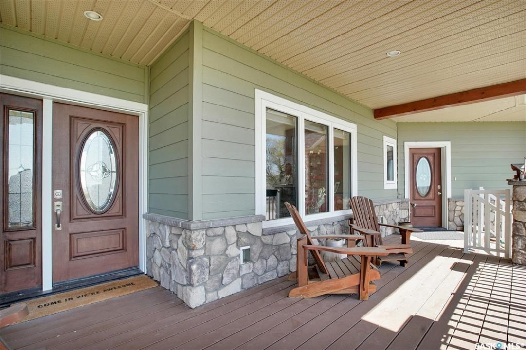 This beautiful, private acreage features 5 bedrooms, 4 bathrooms, a triple-car attached garage, and multiple outbuildings. Located just 22 minutes from Saskatoon, this acreage sits just outside the town of Delisle which features all amenities such as schools, grocery, gas, recreational activities and more. This 2020 built bungalow was customized with high building standards. The veranda at the front of the home provides entry into both the dining room and front hall. The spacious front entry gives access to the triple attached heated and insulated garage, half bathroom and main floor laundry room. The kitchen offers a large island, custom soft closet cabinets and drawers, glass tiled backsplash, quartzite countertops, large pantry and Jenn Air appliances. The kitchen is open to the family room with vaulted ceilings, a propane fireplace and large windows providing both a scenic view and an abundance of natural light. The sun room is fully insulated and can be used year round with a space heater or by leaving the doors open to the main living space. The great room boats 18ft ceilings and a second propane fireplace. Down the hall are three bedrooms including the master suite and the main bathroom. The master offers a walk in closet, five-piece ensuite with a water-air tub, separate stream shower, double sinks and access to the back deck. The outbuildings include the following: Quonset (42 X 70), Shop (20.5 X 33), Horse Stable, 24.5 X 14.5). The workshop is heated and insulated. The large Quonset is finished with a concrete floor and large double doors. The horse stable features two sliding doors and is perfect for horses. The home is finished with 50 year fiberglass shingles, commercial grade ROXUL insulation, triple pane windows, fiberglass doors, high efficient furnace and 100 gallon hot water tank with circulation system. There is a two stage system septic field with pump out and 1500 gallon – fiberglass tank.