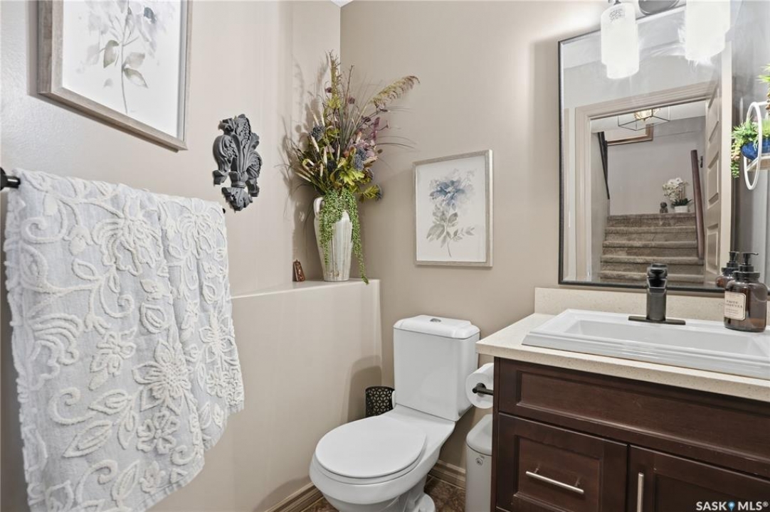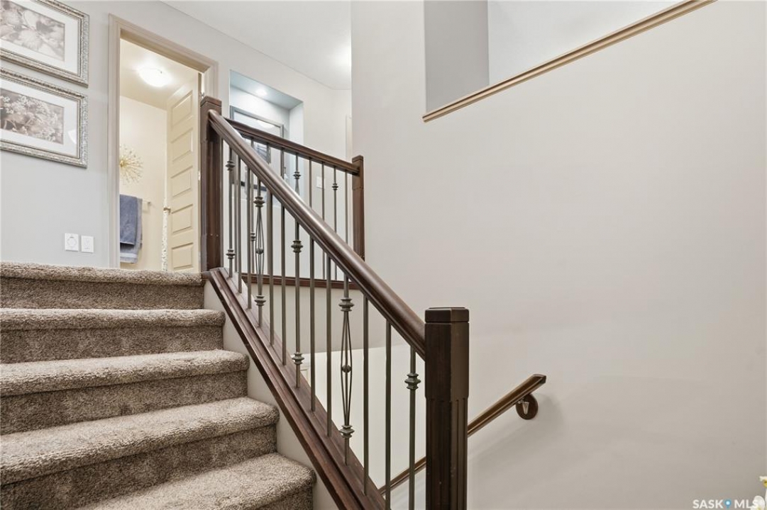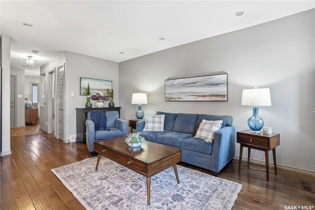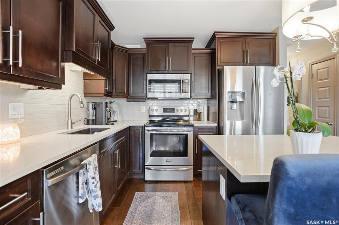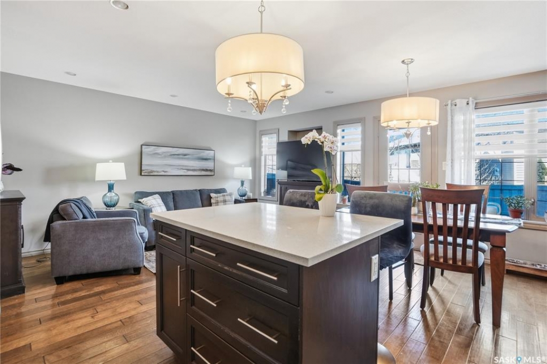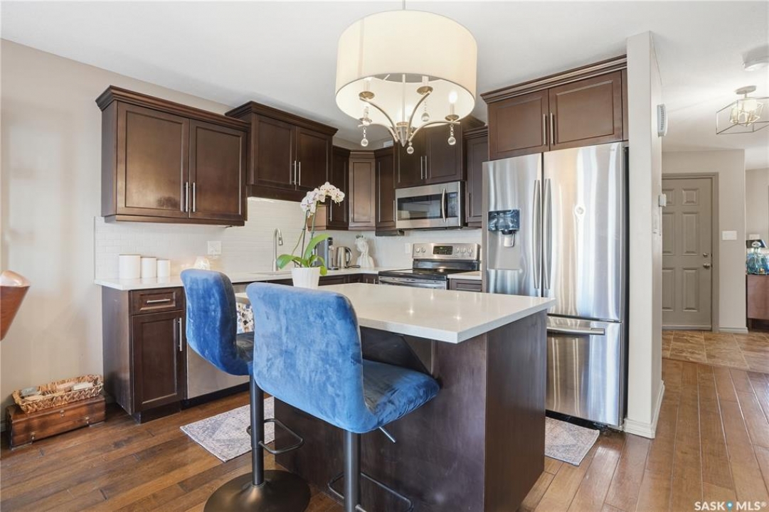 • STYLISH TOWNHOUSE • SPACIOUS PRIVATE YARD • GARAGE • 1414 SQ FT • LOW CONDO FEES • A/C • Skip the yard work, keep the lifestyle—This well-designed Northridge-built condo offers a functional layout with modern finishes throughout. A welcoming foyer with direct garage access is nicely separated from the open-concept main floor, and a convenient 2-piece guest bath is tucked down the hall. The kitchen features quartz countertops, maple cabinetry, newer stainless steel appliances, and a large island— perfect for prep and entertaining—overlooking the dining and living area with a cozy gas fireplace. Double patio doors lead to your private, maintenance-free yard with a patio—an ideal extension of your living space. Upstairs, a versatile bonus room works perfectly as a home office or flex space. The primary suite offers a walk-in closet and 3-piece ensuite, while the second bedroom is privately located near the 4-piece bath. The fully developed lower level adds a bright family room with a flexible nook (bar, workspace, or media area), plus a 3-piece bath, laundry, and storage. Includes a second parking stall with visitor parking right out front. Pet-friendly with approval (including dogs). Close to shopping, parks, walking paths, schools, and the Sandra Schmirler Leisure Centre.