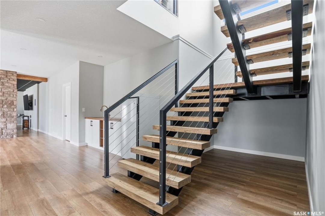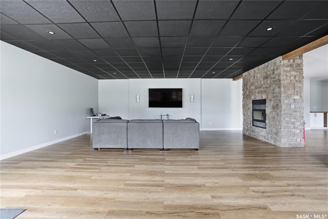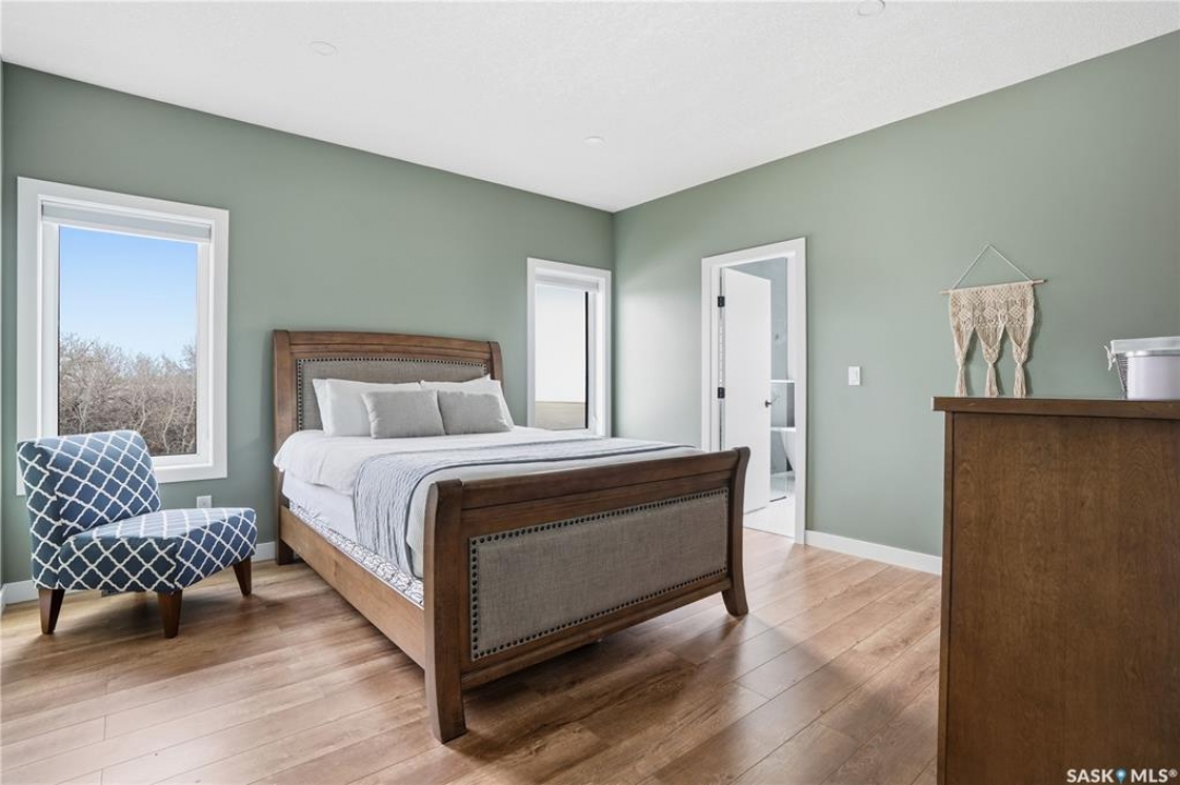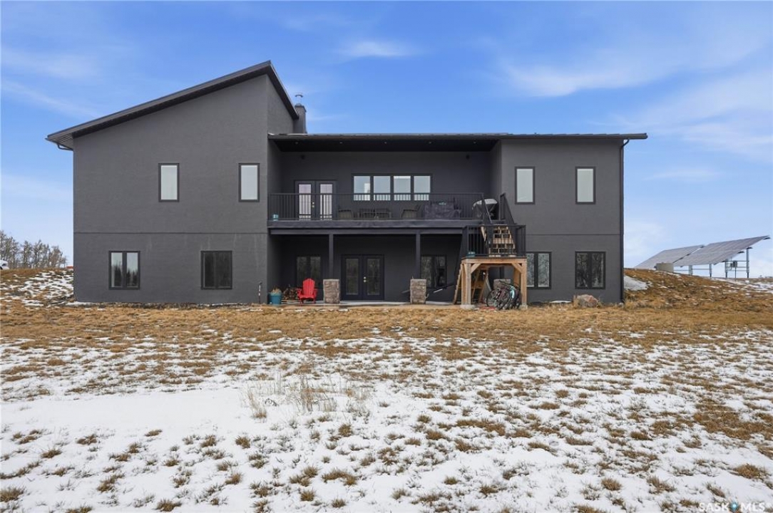 Welcome to acreage life on just over 10 acres with direct highway access, only 30 minutes to the city. This 2022 custom home was built with extraordinary craftsmanship and features throughout. Upon entering the front entrance, you are welcomed into an expansive great room with tons of natural light and towering vaulted ceilings. The custom kitchen is east facing with plenty of windows allowing you to enjoy the morning sun either sitting at the huge quartz topped island or through the access and on your large deck. The island houses a 36" bosch gas range for the fussiest of chefs. Plenty of storage is everywhere with plenty of cabinetry as well as the walk-in pantry. The dining area supports a large table for large family gatherings. The living room is focused on a gas fireplace with room for a flat-screen above. The back entrance comes in off of your huge 36x32 heated and insulated garage with a 2-pce bath and a convenient locker closet room. The Primary bedroom is well appointed with a 5 pce ensuite, featuring his/her sinks, a doorless shower and soaker tub. A walk-in closet, with direct access to the main floor laundry is a well planned touch. The other side of main floor features 2 large bedrooms and 4 piece bath. Downstairs you will find plenty of natural light from the walk-out deesign. A huge rec-room is centered around wood burning fireplace. A well lit office, 4th bedroom, 3 piece bath with custom shower and wet bar round out the basement. The property runs off of town water, is primarily supplimented with solar electricity and has in-floor heat throughout basement, garage as well as ensuite and main bath upstairs. Too many features to list them all, book your personal showing today.