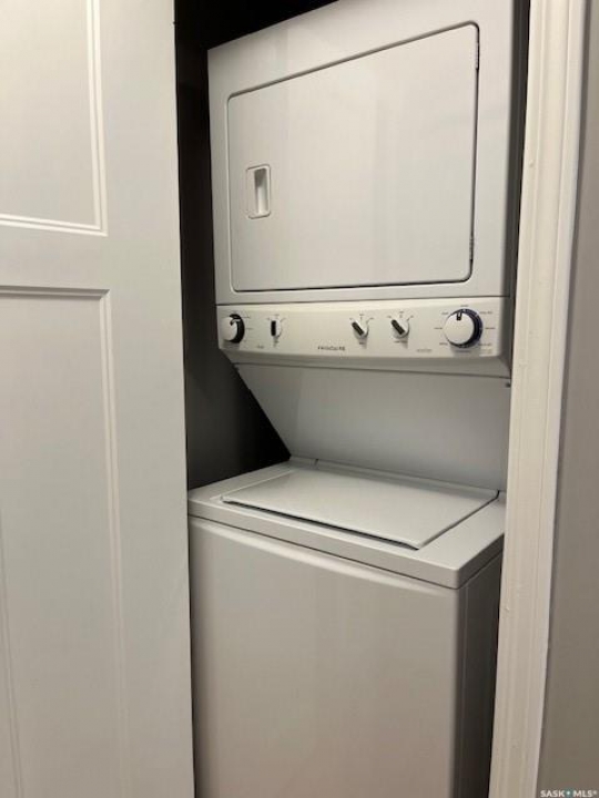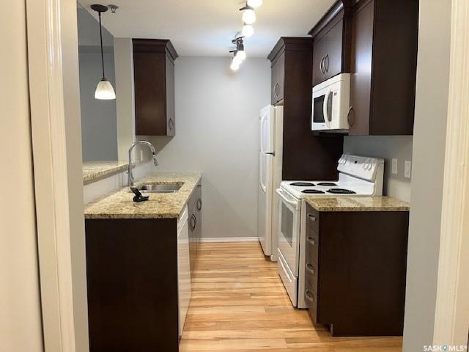 Easy Lifestyle Condo living in the prestigious Bellagio located in Hillsdale across from Wascana Lake with great access to the U of R, Downtown and all of Regina's South amenities. Well kept one bedroom condo unit boasts modern kitchen cabinets with eating bar, granite counter tops including bathroom, all appliances, fridge stove built in dishwasher, microwave hood fan, garburator in suite laundry with stackable washer dryer, spacious bedroom with walk thru closet to 4 piece bath and direct entry off living room to covered deck. This unit has been professionally painted in the last month. Underground parking. amenities and exercise room