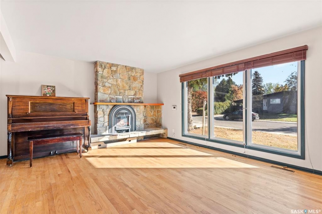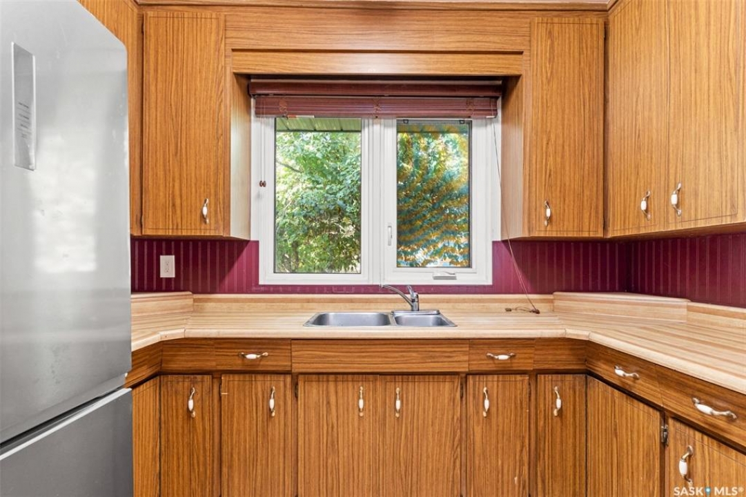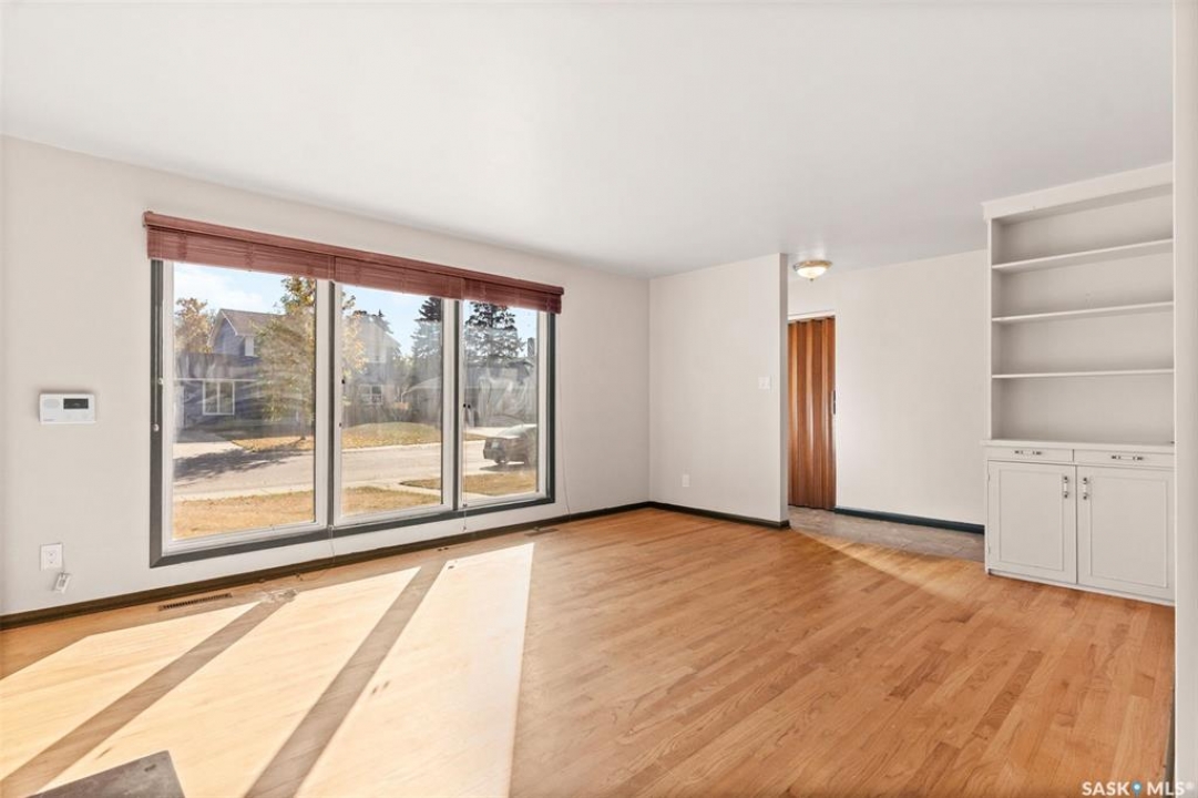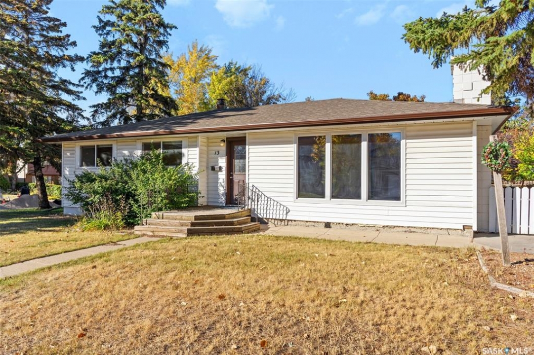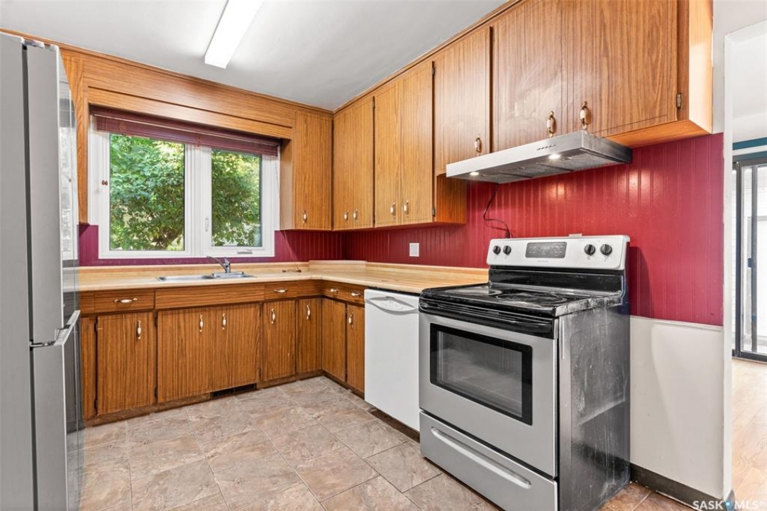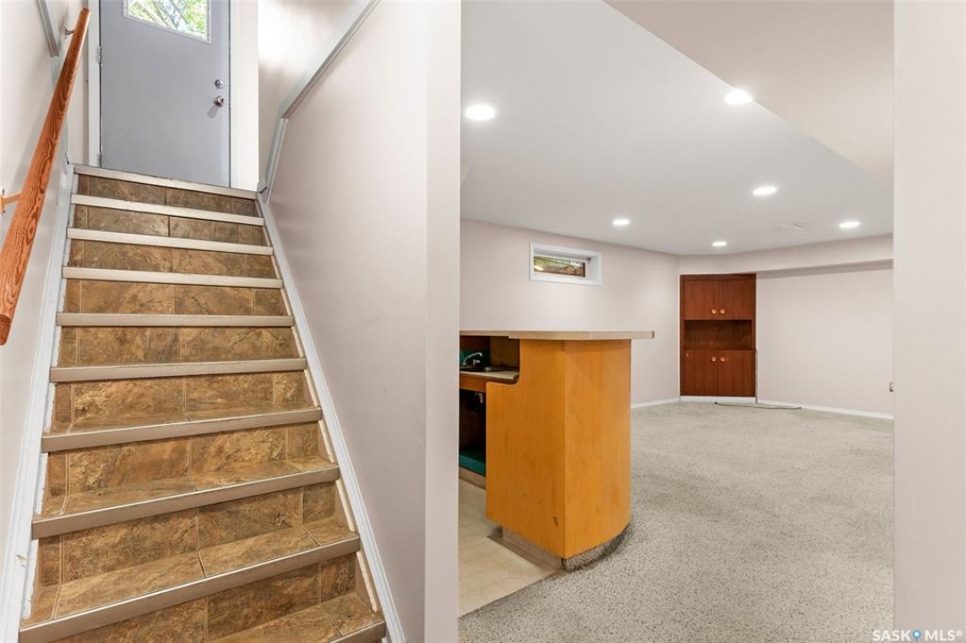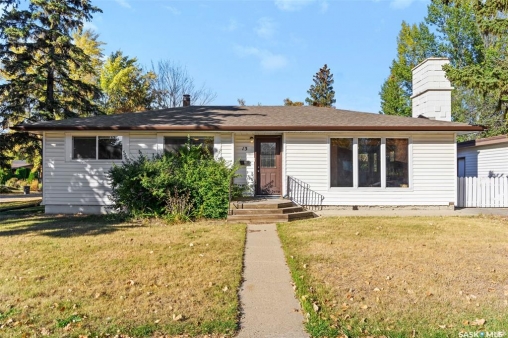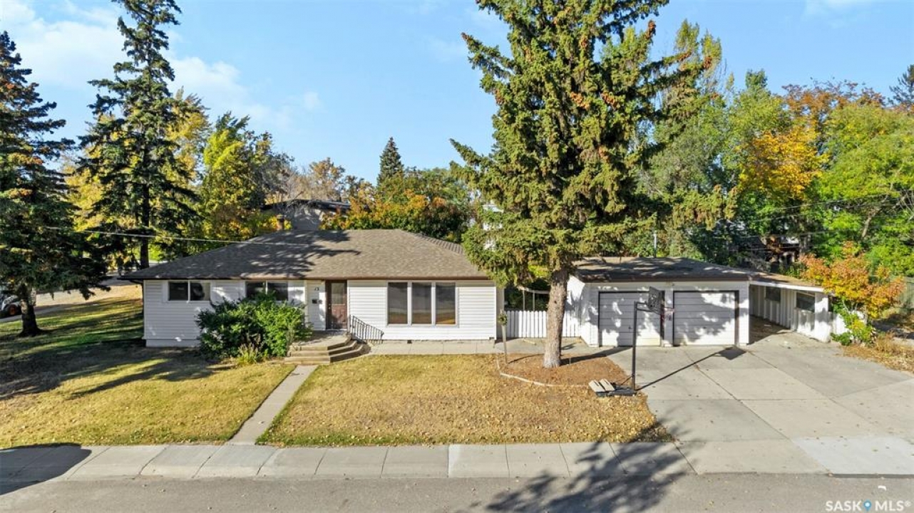 Excellent Greystone Heights location! Close to schools, park, 8th st shopping and university. Spacious 4 bedroom 4 bath bungalow on a huge lot! The L-shape living room, dining room and bedrooms on the main feature Oak hardwood. The kitchen, hallways and main bath are ceramic tile. There is a two piece bath off the master bdrm. The fireplace has been converted to gas. The lower level is fully developed with an L-shape family/games room with wet bar, three piece bath, den, spacious bedroom with over-size window, and the laundry/utility room with an additional two piece bath. The side entry goes directly downstairs and the laundry area is positioned to allow shared laundry if you need a suite. The side yard is accessed via patio doors from the dining room. There's a double detached garage, a carport and shed are attached to the garage. A triple concrete drive provides access and parking. Some recent upgrades: shingle (2020), fridge (2021), water heater (2025), most newer PVC windows. The house needs some interior renovation; it's a handyman special offering great potential. Call to view today!