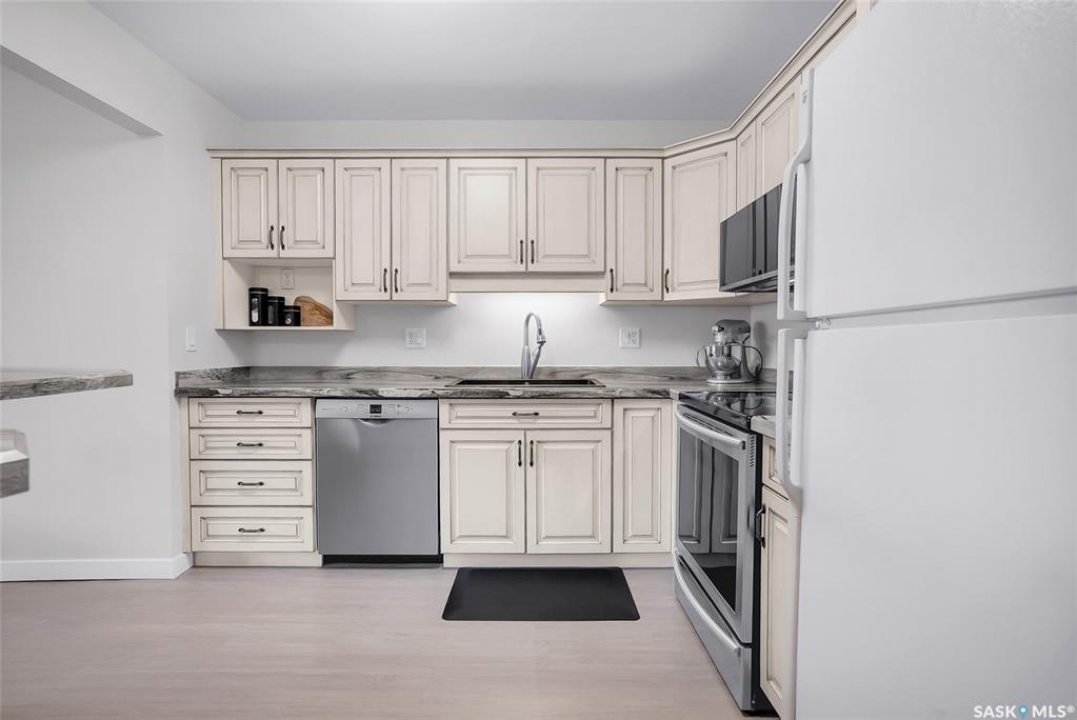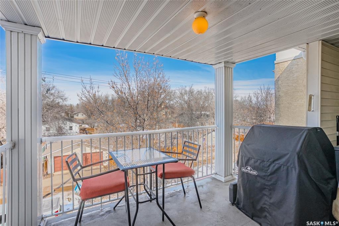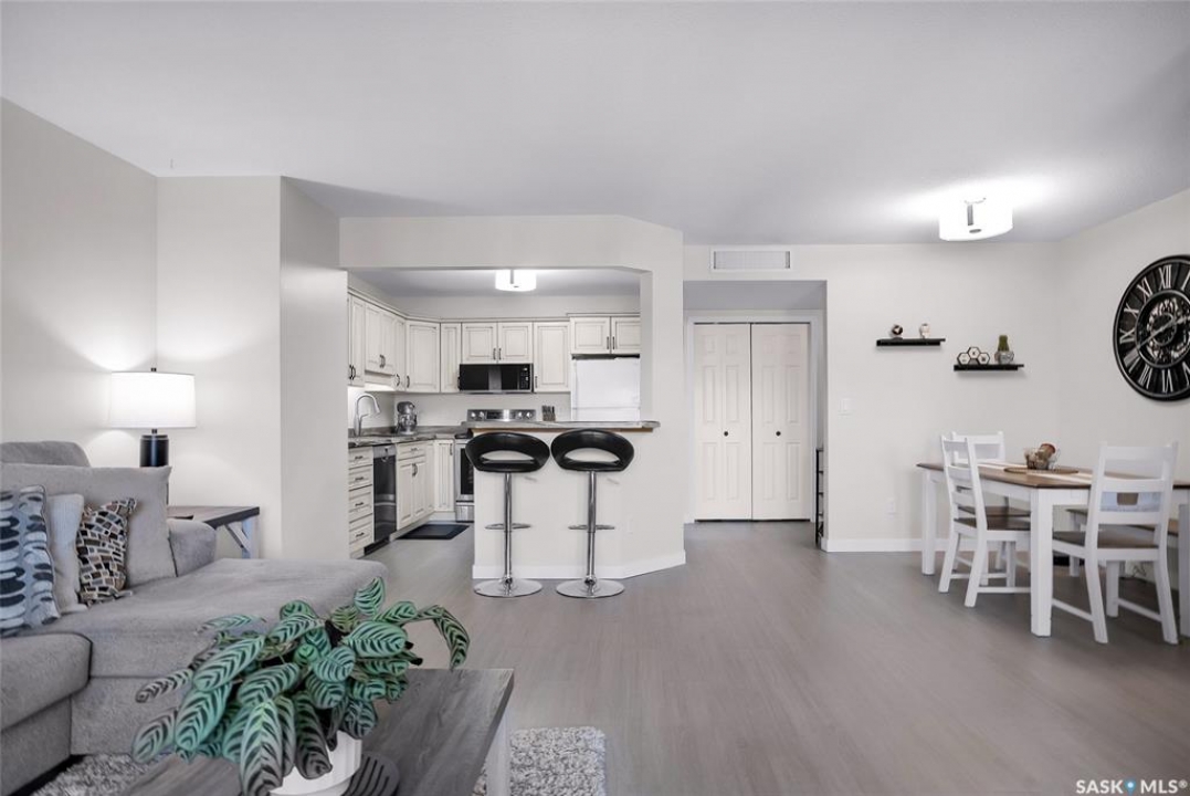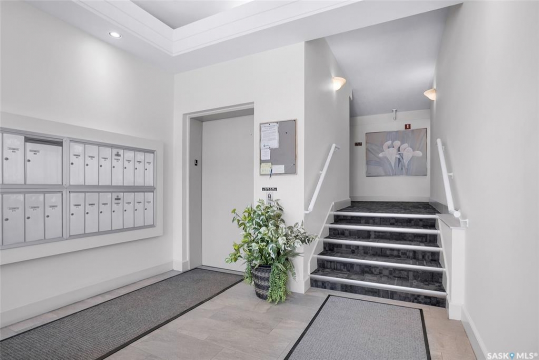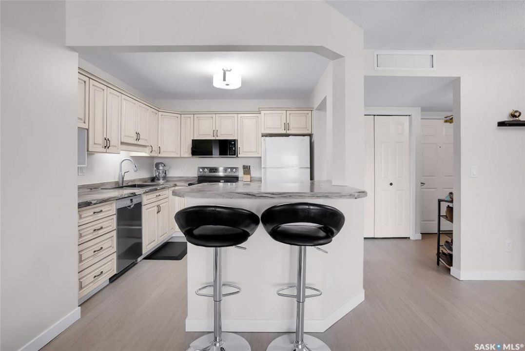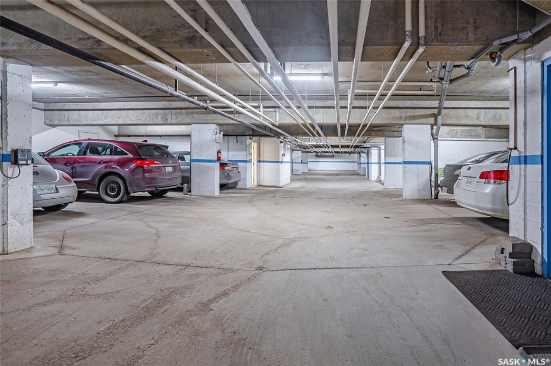 Welcome to this beautifully updated 2-bedroom, 2-bathroom top-floor condo offering comfort, privacy, and exceptional value. Situated on the quiet, north side of the building, this unit provides a peaceful setting with added privacy and minimal noise—enhanced further by solid construction between floors. Step inside to discover brand new vinyl plank flooring with in-floor heat, complemented by fresh paint throughout for a modern, move-in-ready feel. The kitchen features updated appliances, including a new s/s stove, s/s microwave and s/s dishwasher along with new taps and a stylish new shower system in the bathrooms. With over $10,000 in recent upgrades, this home is true Jem. Enjoy year-round comfort with central air conditioning and the convenience of central vacuum. Condo fees include both heat and water, offering excellent value and predictable monthly costs. Additional highlights include: 1 exclusive underground parking stall #18, Plus Sellers Rent a 2nd underground parking stall for $50/mo . 1 Spacious private storage directly in front of your parking space #18. Covered balcony for extended outdoor enjoyment. Ideally located near the University of Saskatchewan and the future Saskatchewan Polytechnic campus, this home offers excellent access to education, transit (bus stop right outside), Preston Crossing shopping, parks, and schools including Sutherland School. A fantastic opportunity for students, professionals, or investors seeking a quiet, upgraded unit in a highly accessible location.