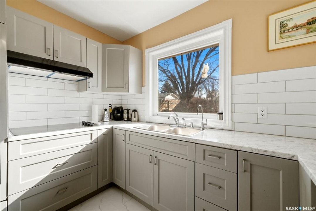 Bright, move-in ready bungalow with a warm, welcoming feel throughout. The main floor offers a spacious living room with a striking stone fireplace feature wall, large front windows, and built-in shelving, plus a fully updated kitchen completed in 2023 with modern cabinetry, counters, appliances, tile backsplash, built-in oven, cooktop, and an oversized island with seating. The main bathroom was also completely redone in 2023 with updated fixtures, plumbing, surround, and finishes. Good-sized bedrooms and new vinyl flooring throughout add to the home's clean, contemporary appeal. Extensive upgrades include central air (2021), new roof decking and shingles (2022), spray foam attic insulation (2022), all new vinyl triple-pane argon-filled windows (2023), upgraded utilities and aluminum mast (2023), new studding and shiplap insulation (2023), plus updated drywall, paint, ceilings, walls, and baseboards throughout (2024). Additional improvements include a high-efficiency furnace (2024), smart programmable thermostat (2024), smart high-efficiency water softener (2024), and rented high-efficiency water heater (2024). Outside, you'll find a large fenced yard, an enclosed patio/sunroom area (in need of repair), and a detached single garage with extra parking out front. A great opportunity for buyers looking for comfortable one-level living with stylish updates and functional space.