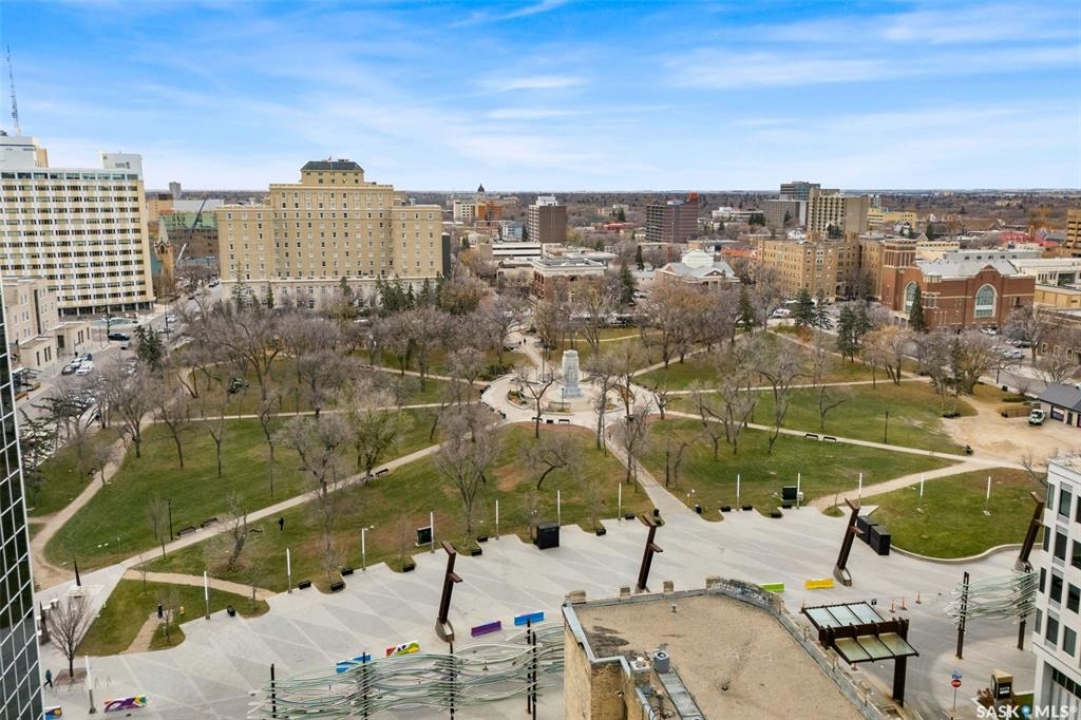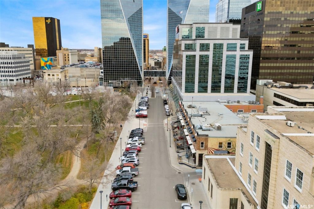 Welcome home to 1002 1914 Hamilton Street in the swanky Manor on Hamilton giving glorious 10th floor views of the Regina city skyline. This prestigious building has received an unparalleled modernization: Chiller for the central air conditioning; curtain wall & glazing; all new roofing on each section of the building; residential rooftop terrace is new with composite materials; and a glorious & inviting lobby + elevator modernization. Living here means you enjoy desirable concierge/security services, all utilities included in the condo fees (+central air, air filtration, softened hot water), wheelchair accessibility in the building, exercise room with quality working equipment, heated underground parkade & an amenities room with renovated outdoor terrace that can be booked to host friends & family when our SK Roughriders are playing. Coming home each day will restore your energy as you're greeted by wall-to-wall windows flood the main living spaces with natural light. Stainless steel appliances, ample counter space, & eat up island seating 4 comfortably - the ideal spot to throw a soirée! With the numerous functional choices for furniture placement within this space you can accommodate a dining area as well. The spacious master bedroom boasts a custom walk-in closet that will easily meet your needs. A nicely appointed den can be used as an entrepreneurial office, or creative space. Finally, the elegantly sized in-suite laundry room and full bathroom work to complete the space. Condo fees include: Heat; Power; Water; Sewer; Garbage; Reserve Fund/Common & External Building Maintenance/Insurance and there is an option to rent a parking stall for a monthly fee. Walkable to Regina's financial district, local eateries + shops, parks, historical sites, and connected to the beloved & desirable neighbourhoods of Cathedral, Crescents, Centre Square and the Warehouse District. Start living the big city energy lifestyle right here in the heart of Regina SK!