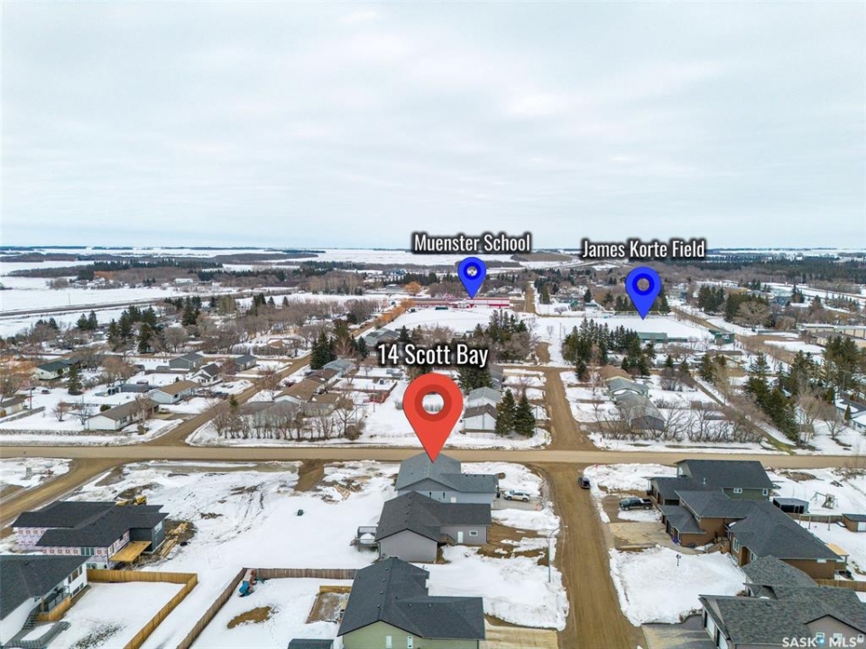 Welcome to 14 Scott Bay, a stunning newly built home situated on a desirable 65x148 corner lot just two blocks from the school in the bustling Village of Muenster, SK. Located only five minutes from Humboldt, Muenster offers the perfect blend of quiet living and a thriving community atmosphere, complete with a K–12 school, St. Peter's College, a hockey arena, and ball diamonds. The area also provides convenient access to major employment opportunities, including the Lanigan and Jansen potash mines, as well as Schulte and Doepker Industries. Built in 2023, this 1,503 sq ft home sits on an ICF basement and features a welcoming front deck along with a double attached garage that offers direct entry into the home. Inside, you are greeted by a spacious mudroom with main floor laundry just off the garage, a generous front entry, and an open-concept design filled with natural light that creates a bright and airy feel throughout the main level. The kitchen is both stylish and functional, showcasing quartz countertops, a walk-in pantry, and a large island that is perfect for entertaining or preparing meals for the family. The main floor also includes a spacious four-piece bathroom and three generously sized bedrooms, including a primary suite complete with a walk-in closet and a well-appointed three-piece ensuite. The basement is a blank slate ready for your personal touch, offering the potential for one or two additional bedrooms, a bathroom that is already roughed in, and a family room. With impressive 10-foot ceilings, the space feels open and inviting rather than like a typical basement. Additional highlights of this home include central air conditioning, an air exchanger, a tankless natural gas water heater, a high-efficiency furnace, and triple-pane windows. Don't miss this incredible opportunity schedule your showing today.