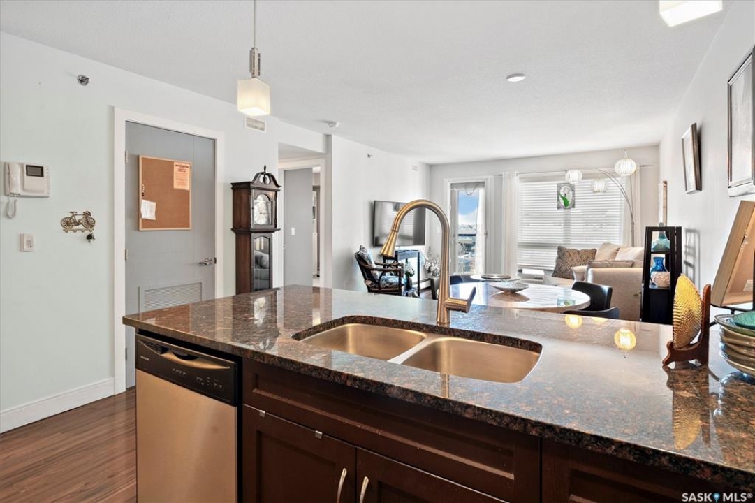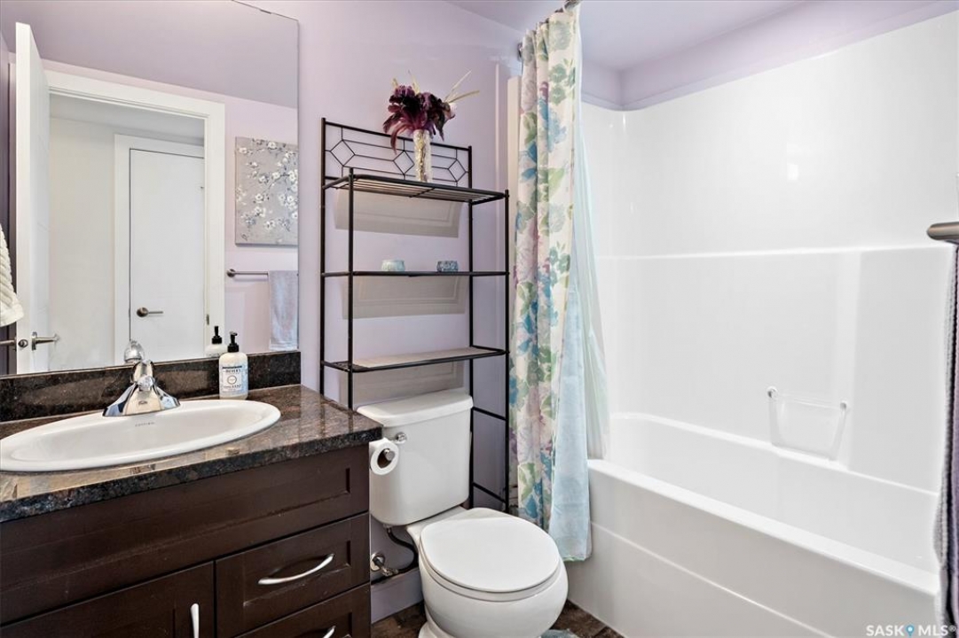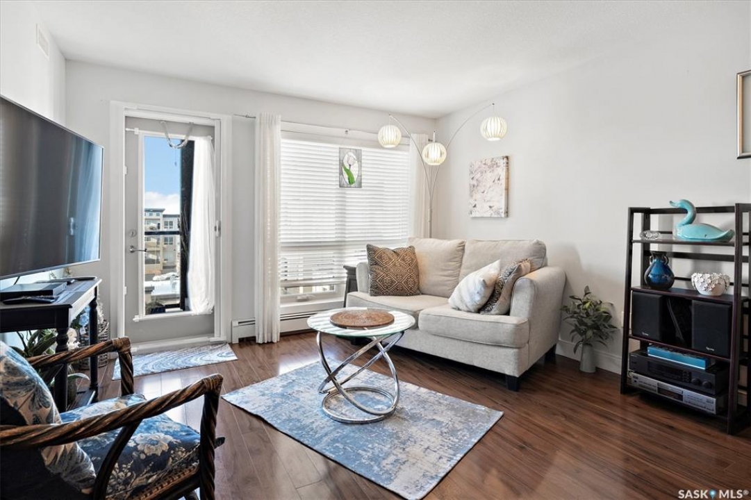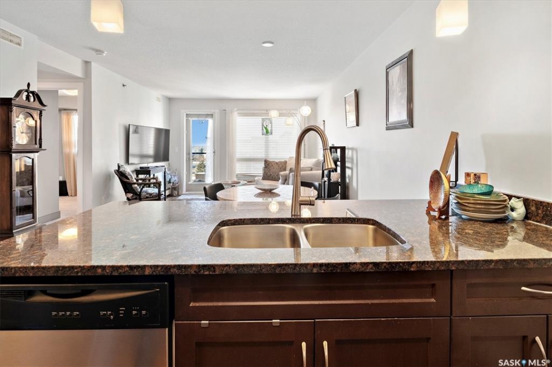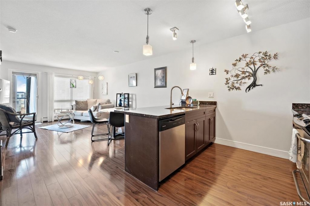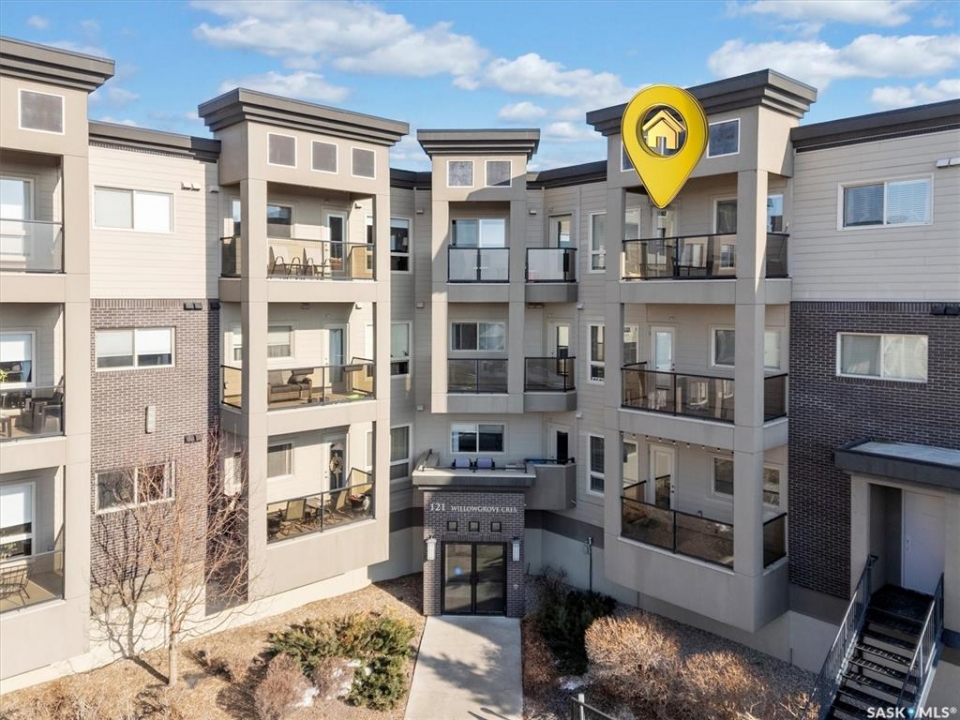Welcome to Willowgrove Suites, built by Riverbend Developments. This 776 sq. ft. top-floor unit features two bedrooms, a spacious main bathroom, a large laundry/storage room, and an open-concept living area. The living space is highlighted by granite countertops, maple cabinetry, laminate flooring, stainless steel kitchen appliances, and in-suite washer and dryer. Enjoy the covered balcony with south and west exposure, complete with a natural gas BBQ hookup—perfect for relaxing or entertaining. This unit also includes underground parking and a storage locker. The building is well-maintained and offers access to a large multipurpose facility shared with the neighboring building. Flexible possession is available, and the unit shows beautifully.
