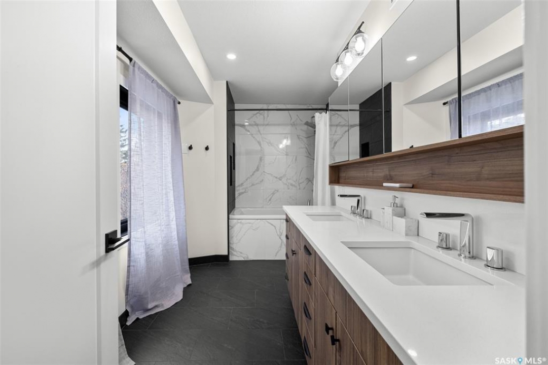 This residence has been meticulously reborn. Taken down to the studs on all three levels, this 2,306 sqft home blends the structural integrity of a total remodel with charm of a quiet street in Albert Park. Exterior commands attention: contemporary finish of smooth acrylic stucco & brick, complemented by windows, doors & shingles that have all been recently updated to ensure long-term durability & elite curb appeal. Rare "new-build" feel in one of Regina's most desirable neighbourhoods. Inside, the transformation is breathtaking. Main floor: centered around a stunning spiral staircase serving as the home's focal point. Designer finishes are showcased throughout, from premium wide-plank flooring to the designer lighting that illuminates every corner. Chef's kitchen is a true masterpiece, featuring an oversized quartz island, custom cabinetry & sophisticated wood-slat ceiling details that add incredible texture/warmth to the modern aesthetic. Mechanical heart of home is just as impressive as the finishes. Updates: HE furnaces, central AC, entirely replaced electrical & plumbing systems… this home offers true turn-key peace of mind for decades to come. Featuring 6 expansive bedrooms & 4 custom-designed bathrooms, the floor plan is as functional as it is beautiful. Fully finished basement provides the perfect escape for a home gym, media room or guest suite (with no detail left untouched). Outdoor living space is a private, south-facing paradise designed for ultimate Saskatchewan summers. A massive 13x30 maintenance-free deck overlooks a tiered 11x21 above-ground pool & a secluded hot tub, all nestled within a lush mature yard. Completing this package is an expansive, three-car attached heated garage—the ultimate year-round sanctuary for your vehicles & hobbies. Steps from parks & elite south-end amenities, this is a rare opportunity to own a home where every detail has been thoughtfully curated. Why settle for a project when you can own a masterpiece?