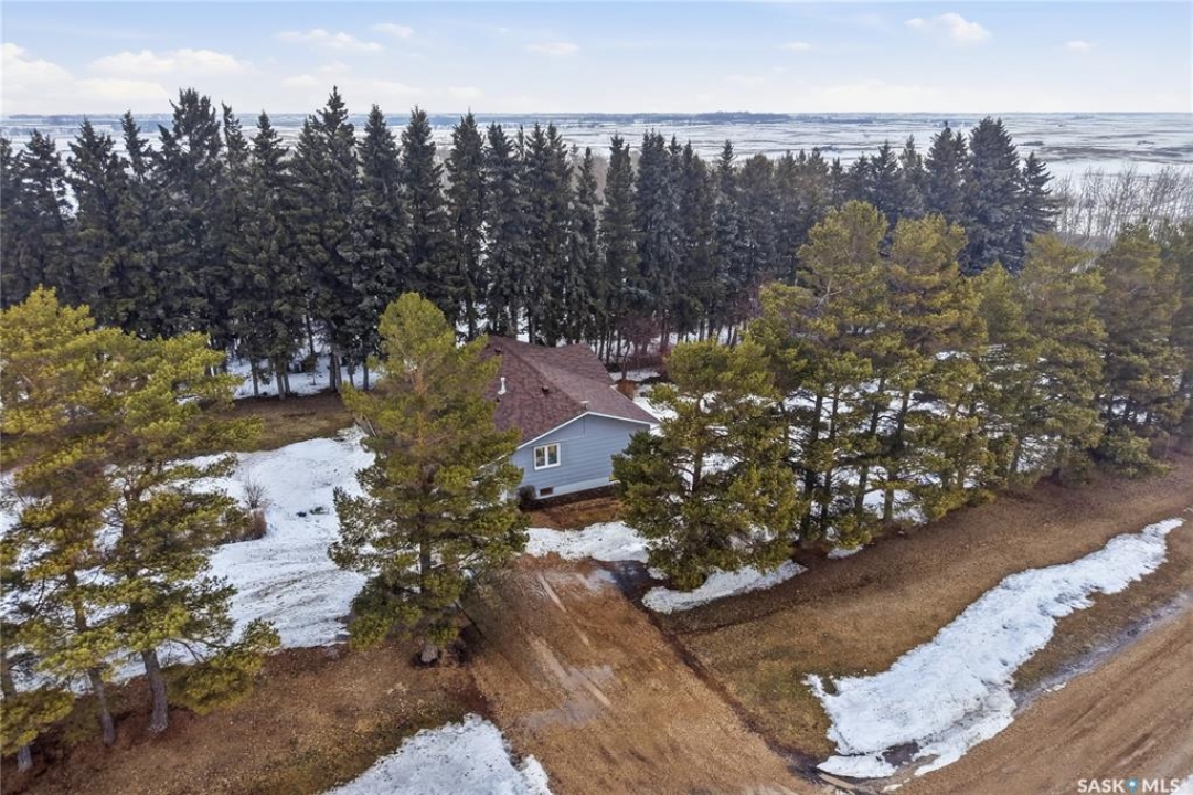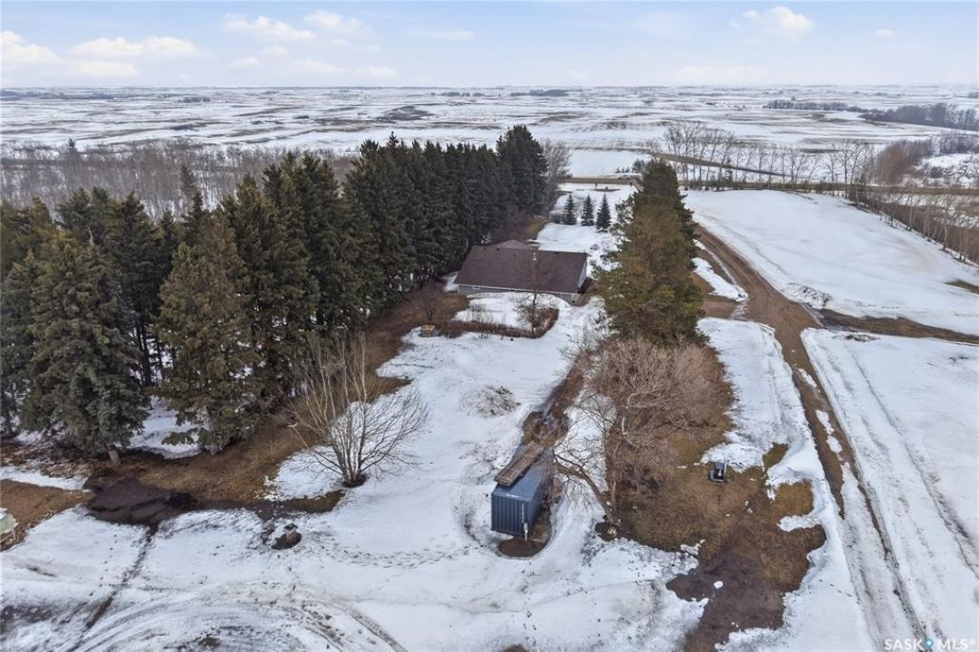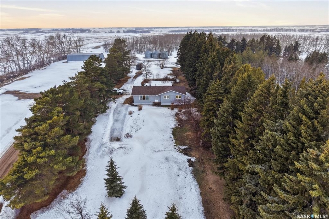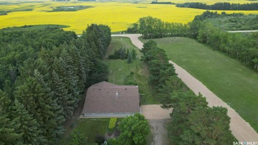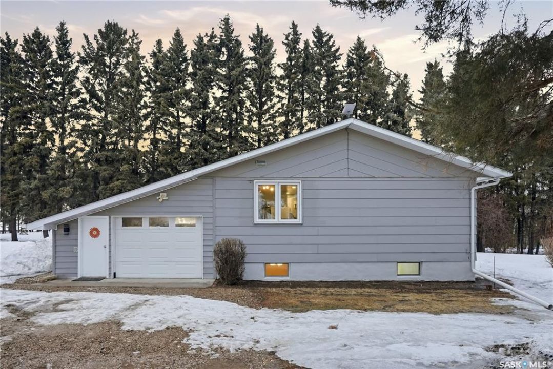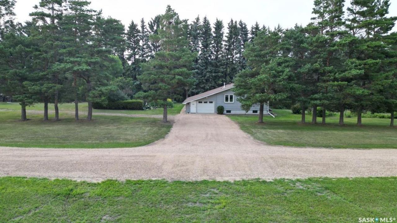 Welcome to this beautifully treed 23.16-acre acreage located just 10 minutes south of Foam Lake, offering privacy, functionality, and peaceful rural living. Surrounded by mature shelterbelt trees, the yard site is incredibly private with open prairie views beyond. The 1,346 sq ft bungalow is move-in ready with numerous updates. Entering through the massive attached garage, you're welcomed into a practical laundry and mudroom area with a newer washer. The main floor features an updated kitchen (2021) with modern finishes and appliances, flowing into the dining area and a bright, spacious living room filled with natural light. Down the hall are two guest bedrooms, a 4-piece bathroom, and a primary bedroom with a 2-piece ensuite. Flooring throughout the main level was updated between 2020 and 2022. The partially finished basement offers a large recreation room, fourth bedroom, 3-piece bathroom, and a versatile den, along with a large utility room, additional storage, and cold storage. Major updates include triple-pane windows (2021), attic insulation (2022), and shingles (2018–2019). Outside, the mature yard is beautifully maintained with expansive lawn space and established trees. The property includes a large quonset at 75ft x 48ft x 14ft tall (concrete foundation with gravel floor, 100amp power with 220v outlet) and two dugouts, ideal for animals or hobby farm use. With natural gas heating, power, a large bore well, and school bus pickup, this acreage offers rural living with everyday convenience.
