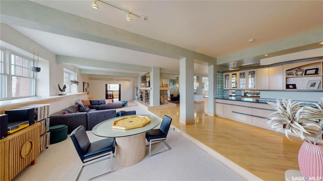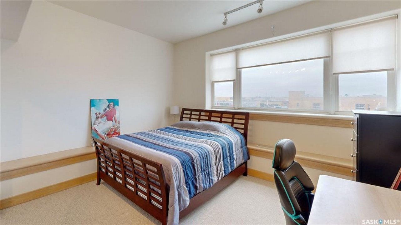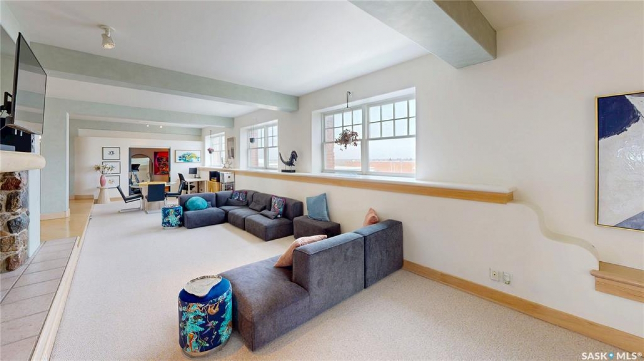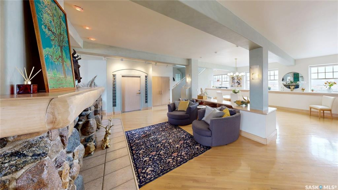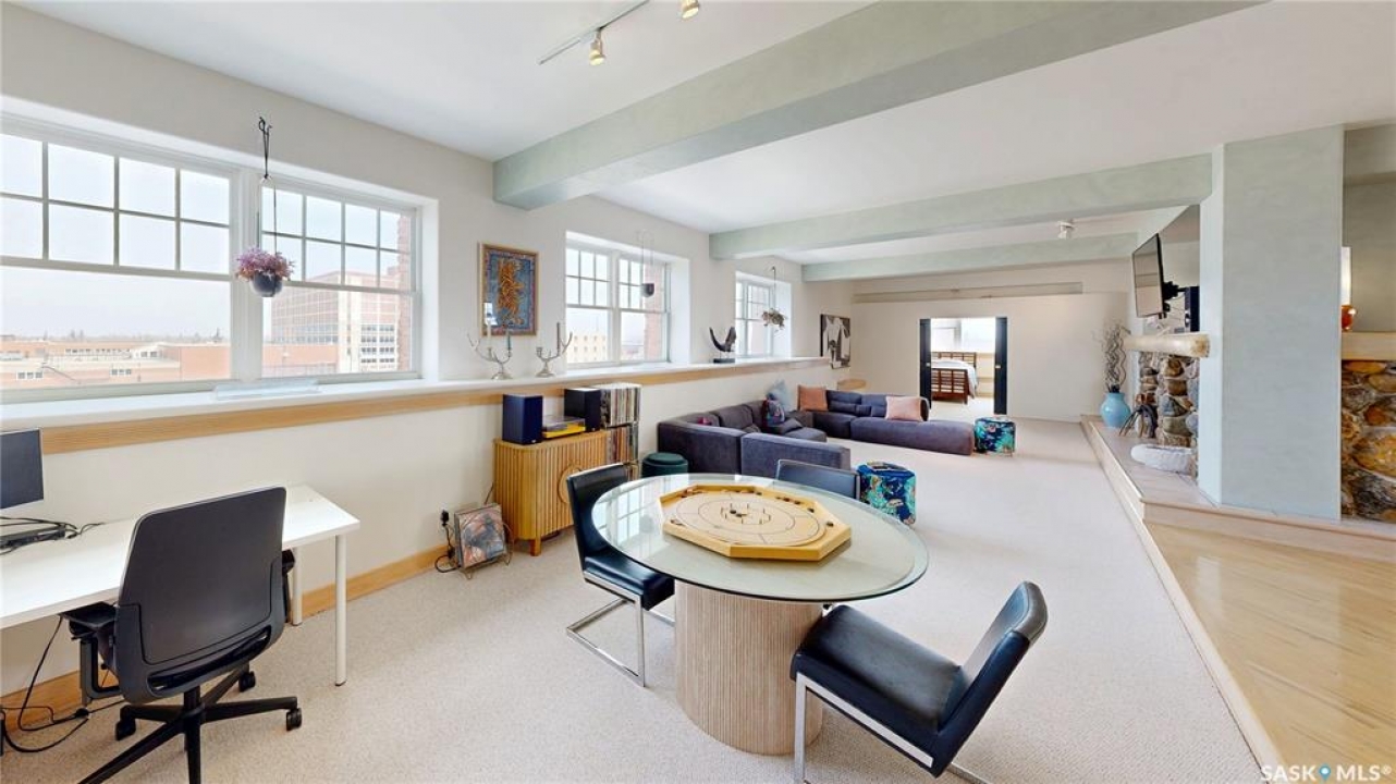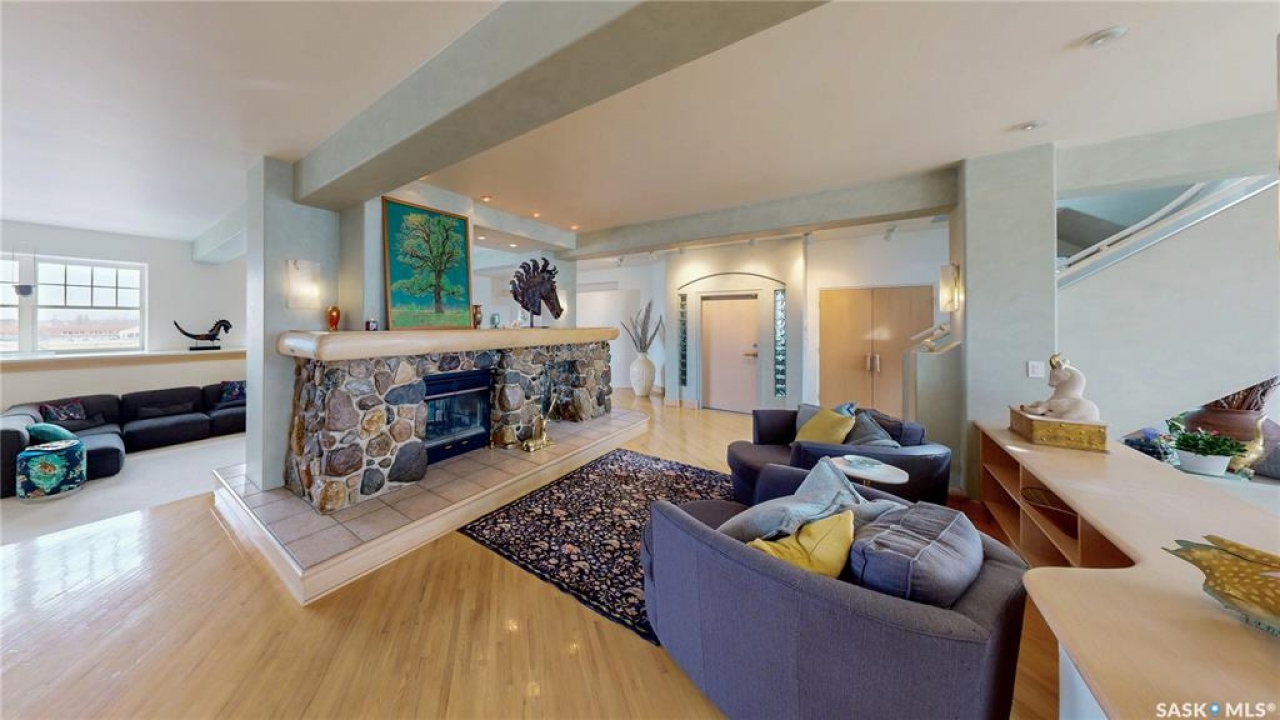 Welcome to Unit 400, the penthouse suite at 1150 Rose Street located in the vibrant Warehouse district. This 1913 built, 4917 square foot, apartment style warehouse condo has 5 bedrooms, 2 bathrooms and the grounds are completely gated. One of the most exceptional and rare highlights of this unit is the abundance of private parking spaces! There are 4 parking spots in the 56'x30' quadruple, detached, heated garage, 6 on the parking pad in front of the garage and 2 more on the side of the building! Upon entering this suite, you are welcomed into the foyer that opens into the family room with bright windows, a stone-surround wood burning fireplace and hardwood floors. The kitchen has a massive island with bar seating and the stainless steel fridge, stove, dishwasher, and garburator are all included. The open concept flows into the adjacent dining area. To the side is a versatile bedroom that also makes a wonderful office. On the opposite side of the stone fireplace, you'll find an expansive living room, offering a perfect balance of comfort and style. This area is complimented by a bedroom on one end and a cozy den on the other. The luxurious primary bedroom is spacious with a 5 piece en-suite bathroom featuring a huge bathtub, double vanity, glass shower and walk-in closet! Following that are two more bedrooms and the main 4 piece bathroom. Finishing off this level is the laundry room with tile flooring, plenty of extra storage space, a convenient wash sink, and a folding table. There is also access to the freight elevator. On the second level is a fabulous bonus room with wrap around windows, a wet bar with tile backsplash and access to your very own private rooftop deck! The ultimate spot to soak up the sun during the day and gather around the fire table with family and friends in the evening. Additional features include central air, the owned forced air boiler, gas water heater, water softener, RO system and both elevator and stair access.