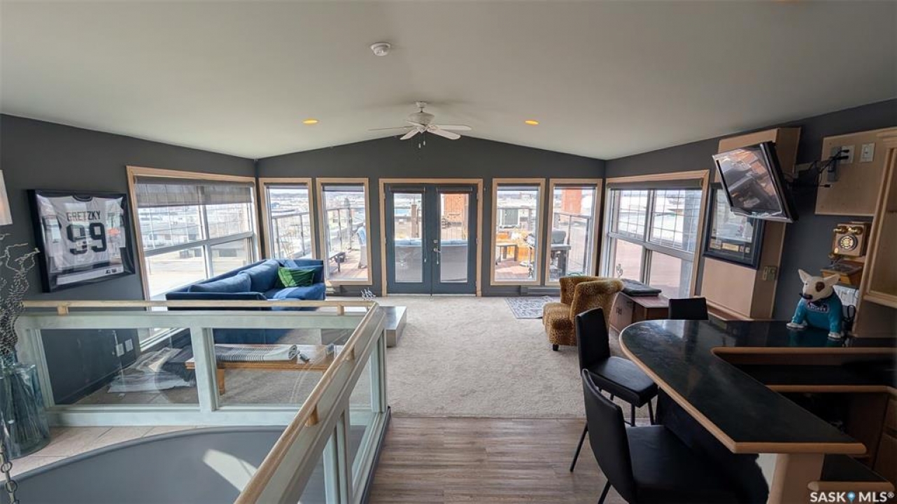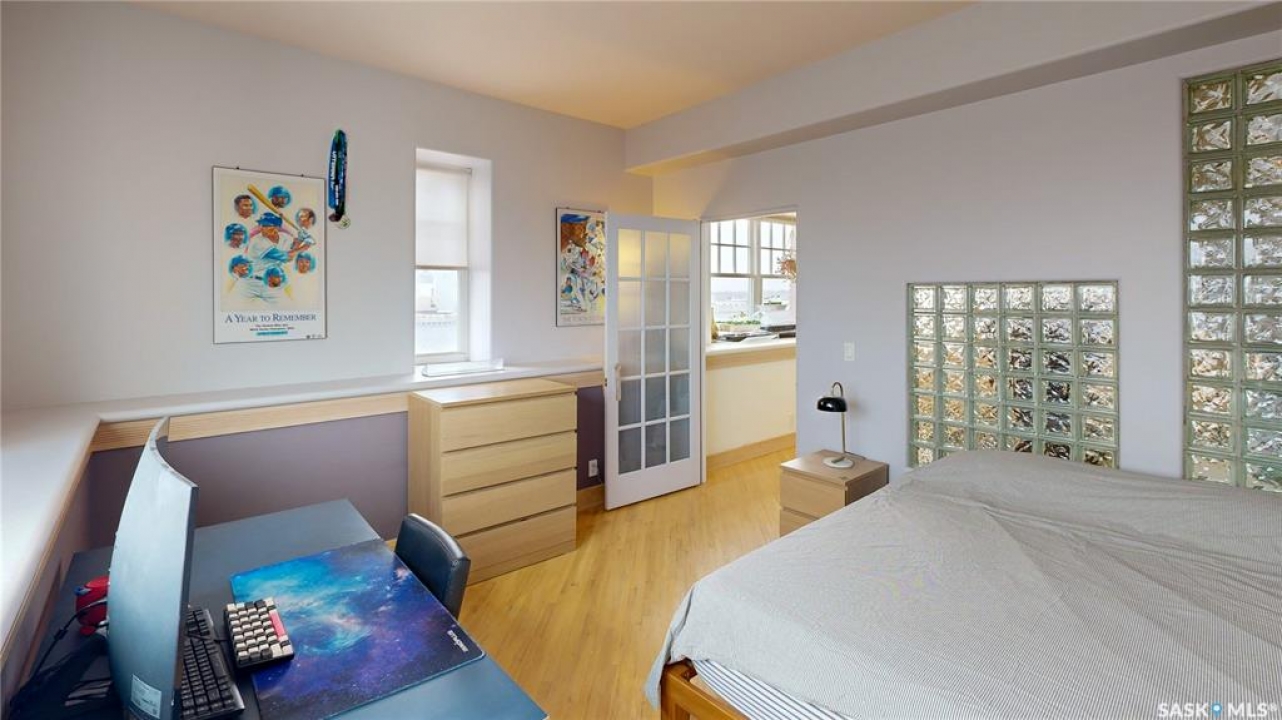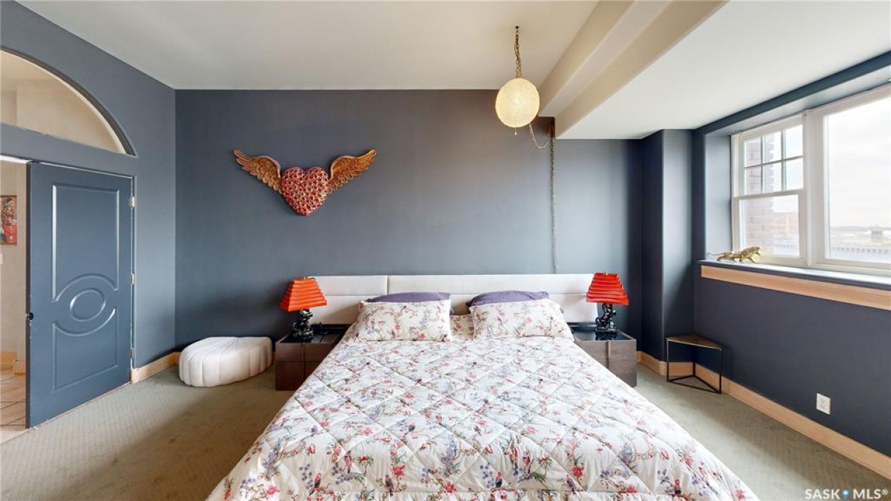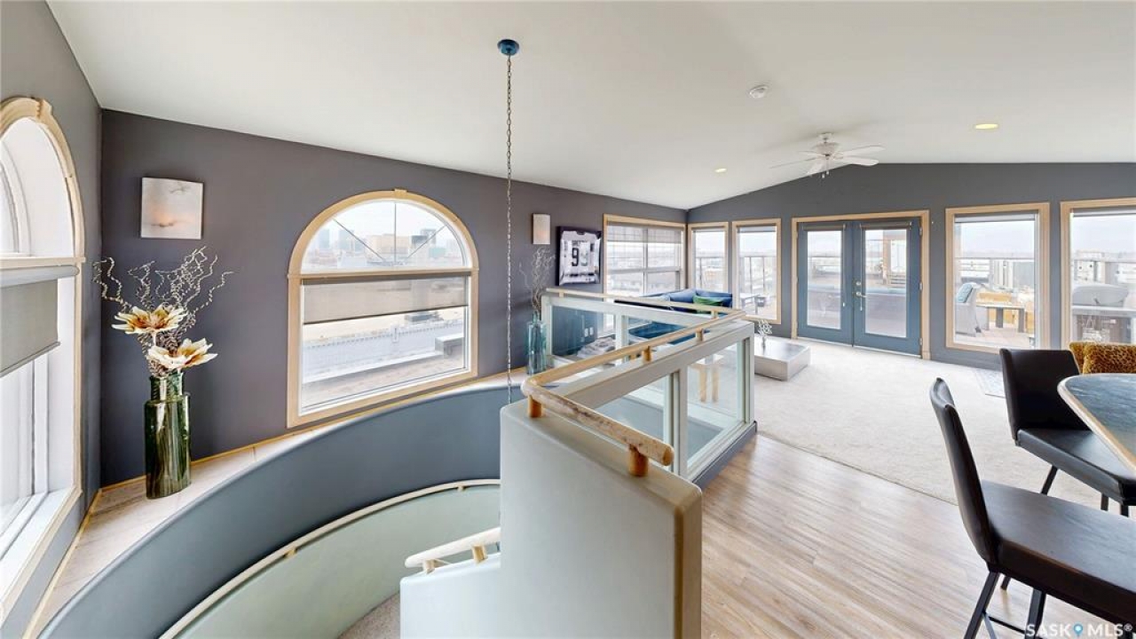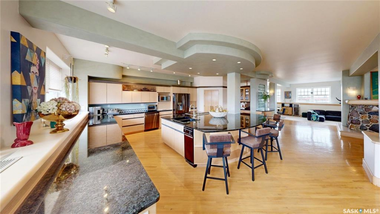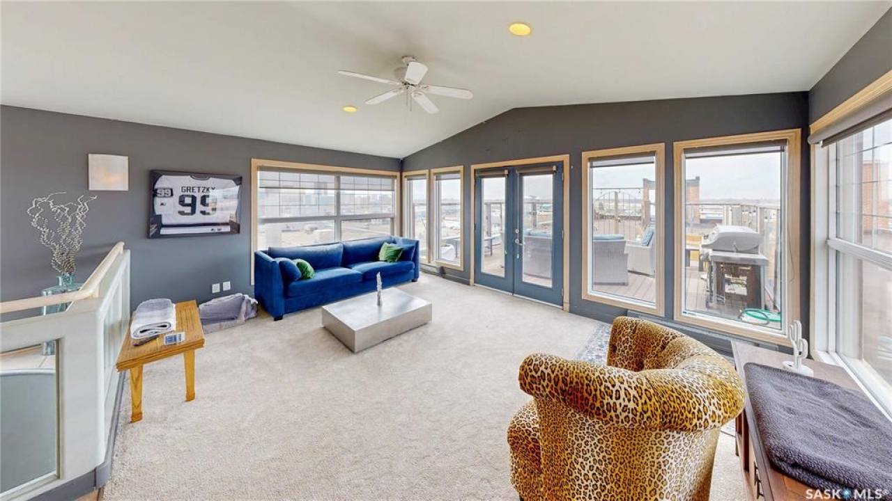 Welcome to Unit 400, the penthouse suite at 1150 Rose Street located in the vibrant Warehouse district. This 1913 built, 4917 square foot, apartment style warehouse condo has 5 bedrooms, 2 bathrooms and the grounds are completely gated. One of the most exceptional and rare highlights of this unit is the abundance of private parking spaces! There are 4 parking spots in the 56'x30' quadruple, detached, heated garage, 6 on the parking pad in front of the garage and 2 more on the side of the building! Upon entering this suite, you are welcomed into the foyer that opens into the family room with bright windows, a stone-surround wood burning fireplace and hardwood floors. The kitchen has a massive island with bar seating and the stainless steel fridge, stove, dishwasher, and garburator are all included. The open concept flows into the adjacent dining area. To the side is a versatile bedroom that also makes a wonderful office. On the opposite side of the stone fireplace, you'll find an expansive living room, offering a perfect balance of comfort and style. This area is complimented by a bedroom on one end and a cozy den on the other. The luxurious primary bedroom is spacious with a 5 piece en-suite bathroom featuring a huge bathtub, double vanity, glass shower and walk-in closet! Following that are two more bedrooms and the main 4 piece bathroom. Finishing off this level is the laundry room with tile flooring, plenty of extra storage space, a convenient wash sink, and a folding table. There is also access to the freight elevator. On the second level is a fabulous bonus room with wrap around windows, a wet bar with tile backsplash and access to your very own private rooftop deck! The ultimate spot to soak up the sun during the day and gather around the fire table with family and friends in the evening. Additional features include central air, the owned forced air boiler, gas water heater, water softener, RO system and both elevator and stair access.