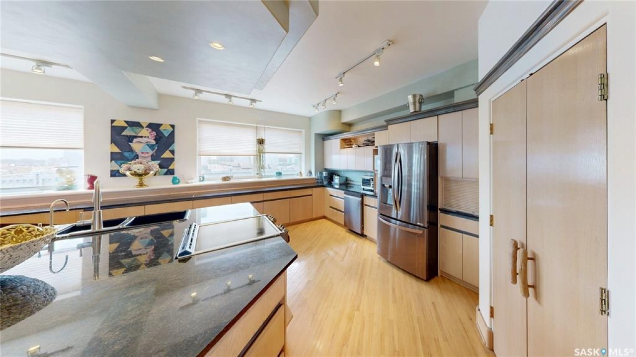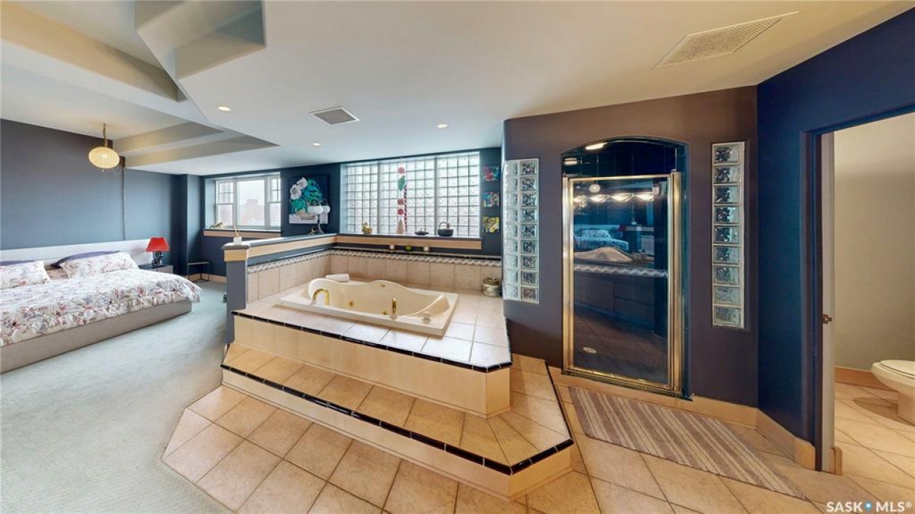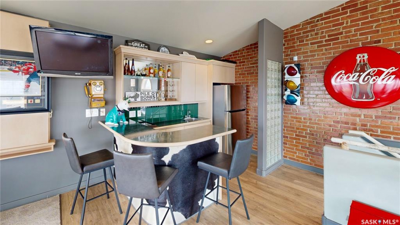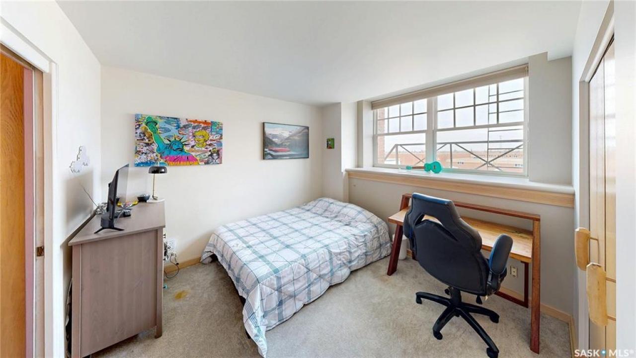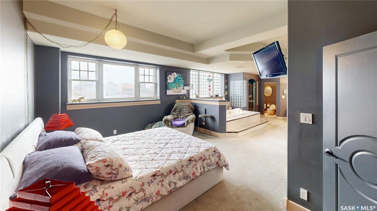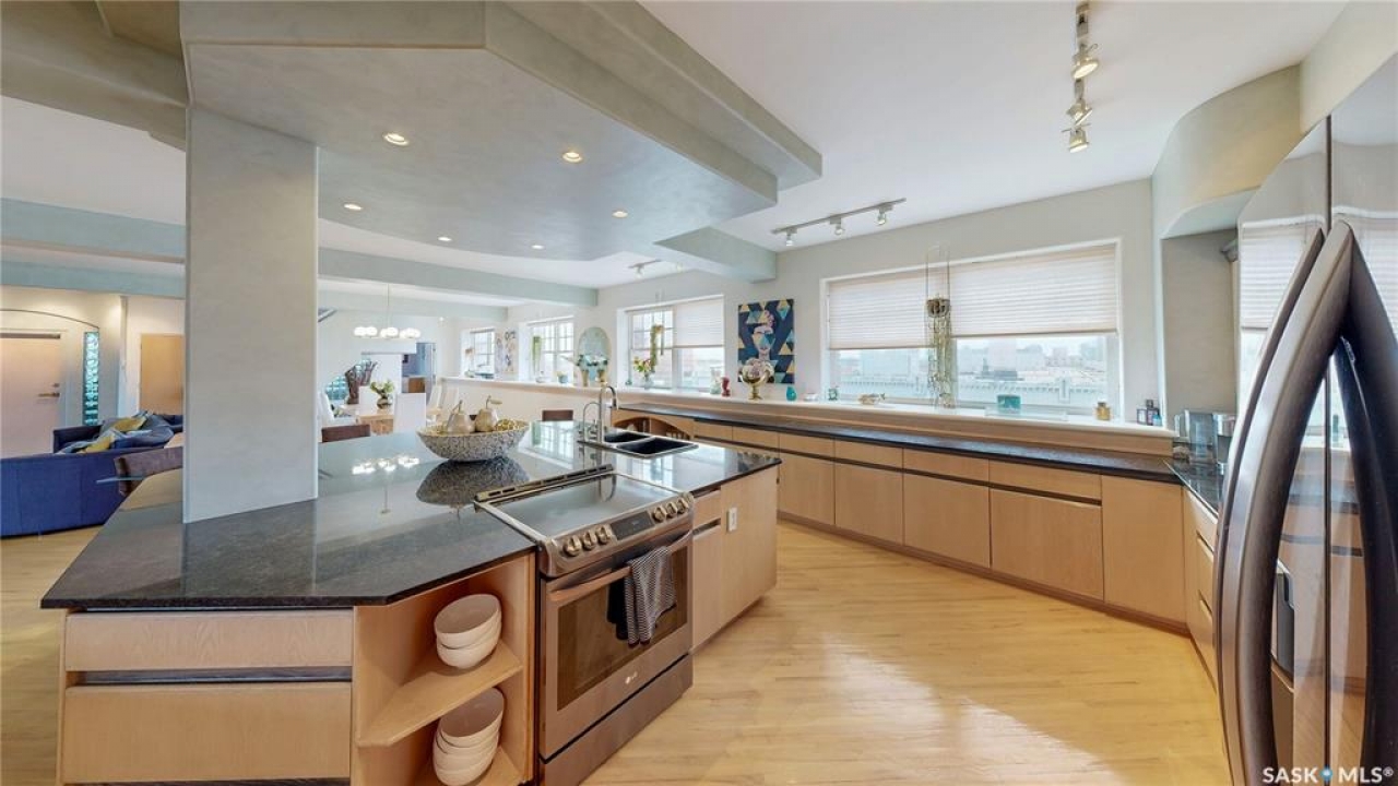 Welcome to Unit 400, the penthouse suite at 1150 Rose Street located in the vibrant Warehouse district. This 1913 built, 4917 square foot, apartment style warehouse condo has 5 bedrooms, 2 bathrooms and the grounds are completely gated. One of the most exceptional and rare highlights of this unit is the abundance of private parking spaces! There are 4 parking spots in the 56'x30' quadruple, detached, heated garage, 6 on the parking pad in front of the garage and 2 more on the side of the building! Upon entering this suite, you are welcomed into the foyer that opens into the family room with bright windows, a stone-surround wood burning fireplace and hardwood floors. The kitchen has a massive island with bar seating and the stainless steel fridge, stove, dishwasher, and garburator are all included. The open concept flows into the adjacent dining area. To the side is a versatile bedroom that also makes a wonderful office. On the opposite side of the stone fireplace, you'll find an expansive living room, offering a perfect balance of comfort and style. This area is complimented by a bedroom on one end and a cozy den on the other. The luxurious primary bedroom is spacious with a 5 piece en-suite bathroom featuring a huge bathtub, double vanity, glass shower and walk-in closet! Following that are two more bedrooms and the main 4 piece bathroom. Finishing off this level is the laundry room with tile flooring, plenty of extra storage space, a convenient wash sink, and a folding table. There is also access to the freight elevator. On the second level is a fabulous bonus room with wrap around windows, a wet bar with tile backsplash and access to your very own private rooftop deck! The ultimate spot to soak up the sun during the day and gather around the fire table with family and friends in the evening. Additional features include central air, the owned forced air boiler, gas water heater, water softener, RO system and both elevator and stair access.