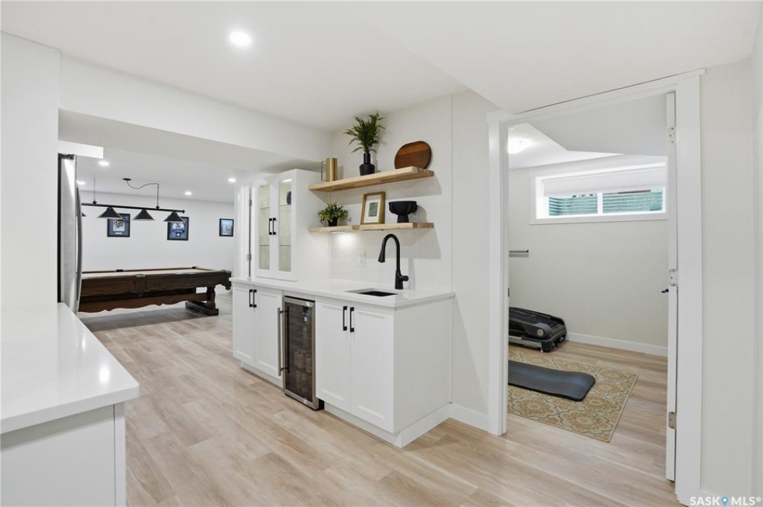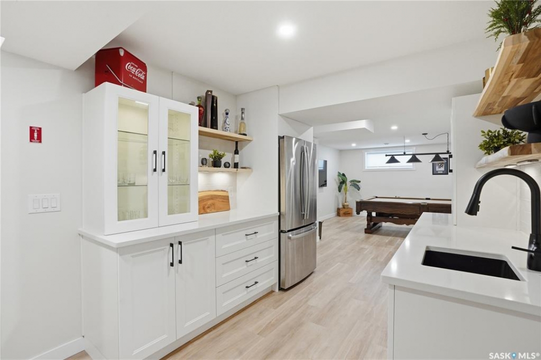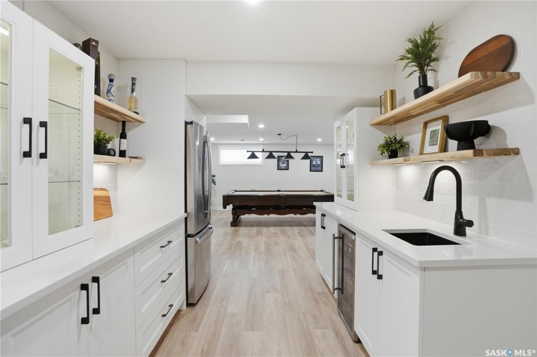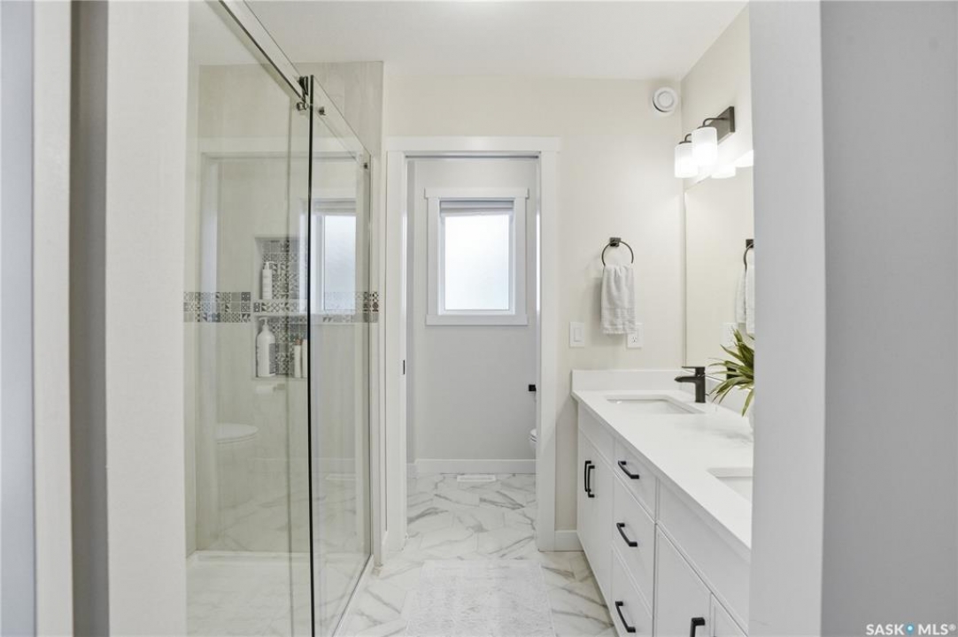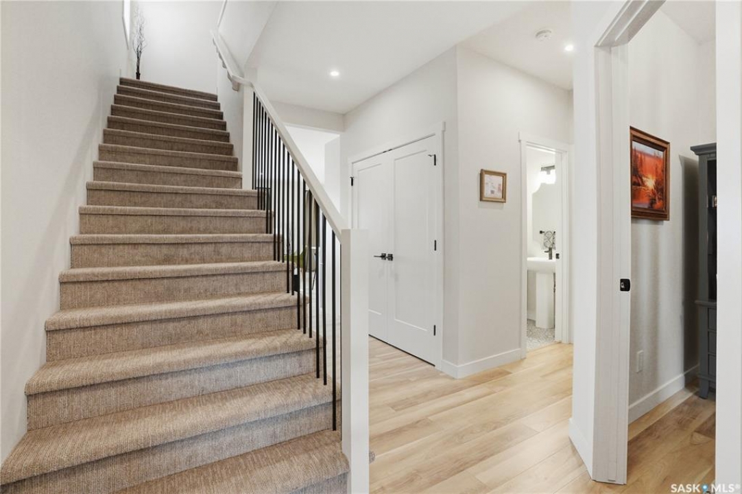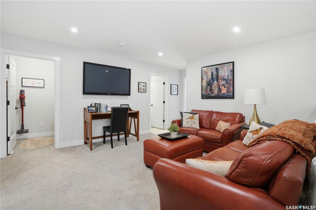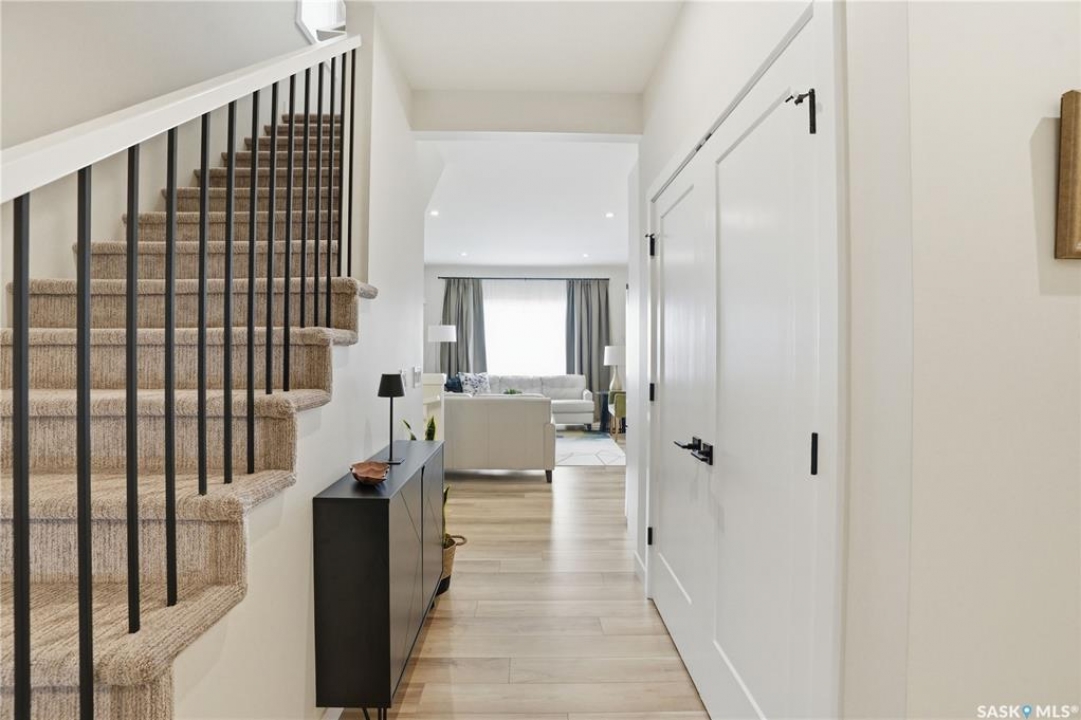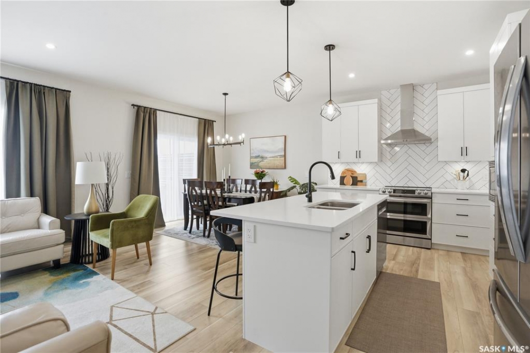 Welcome to this stunning, modern home in Rosewood, offering the perfect blend of style, functionality, and comfort. Featuring exceptional curb appeal, this property makes a strong first impression from the moment you arrive. Inside, you'll find a bright, airy open-concept main floor with wide-plank flooring, designer lighting, and large windows that flood the space with natural light. The gourmet kitchen is a true showpiece—featuring quartz surfaces, custom cabinetry, high-end stainless steel appliances, and an expansive island designed for both entertaining and casual dining. A custom walk-through pantry provides ample storage and convenience. The main living area is warm and inviting, with a thoughtfully designed layout ideal for both entertaining and everyday living. A dedicated dining space, cozy living room, and 1/2 bathroom complete the main level, along with a functional office/den —ideal for today's professional lifestyle. Upstairs, the home continues to impress with a spacious bonus room and a luxurious primary retreat complete with a walk-in closet and a spa-inspired 5-piece ensuite with dual vanities. Two additional bedrooms, a full bathroom, and convenient second-floor laundry complete this level, offering both comfort and convenience for families The fully finished basement expands your living space with a large recreation area, a wet bar, an additional bedroom, and a bathroom. Additional highlights include central air conditioning, central vacuum, and a heated triple-car garage with 220v. The outdoor space is beautifully finished with a covered deck, fencing, lawn, and backs a green space—creating a private setting perfect for relaxing or entertaining. With its prime location in Rosewood—ideally situated neighbouring to schools, parks, and amenities—this home offers a rare opportunity to experience elevated living in one of Saskatoon's most desirable neighbourhoods. Sophisticated, spacious, and move-in ready—this is luxury living redefined.