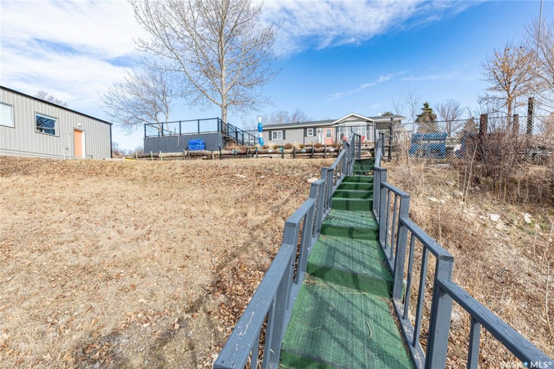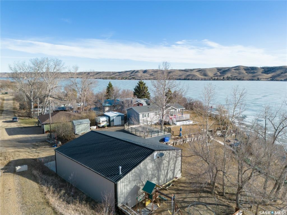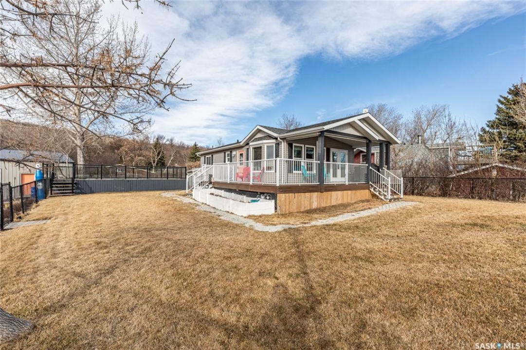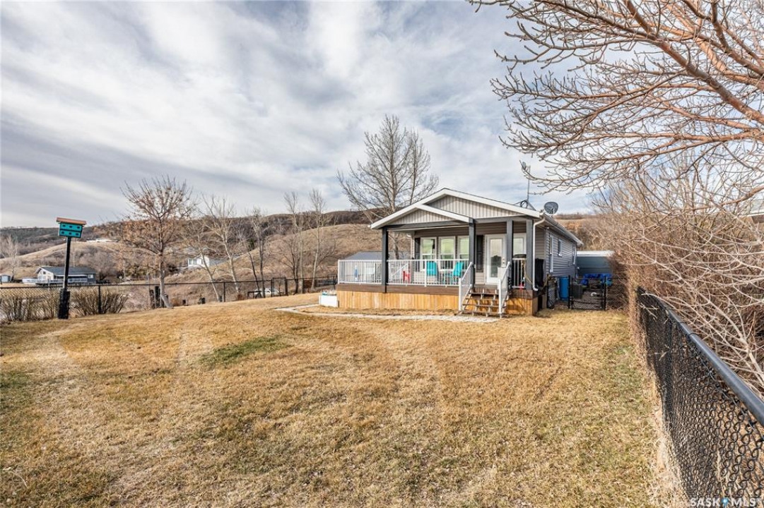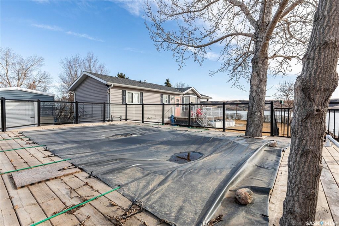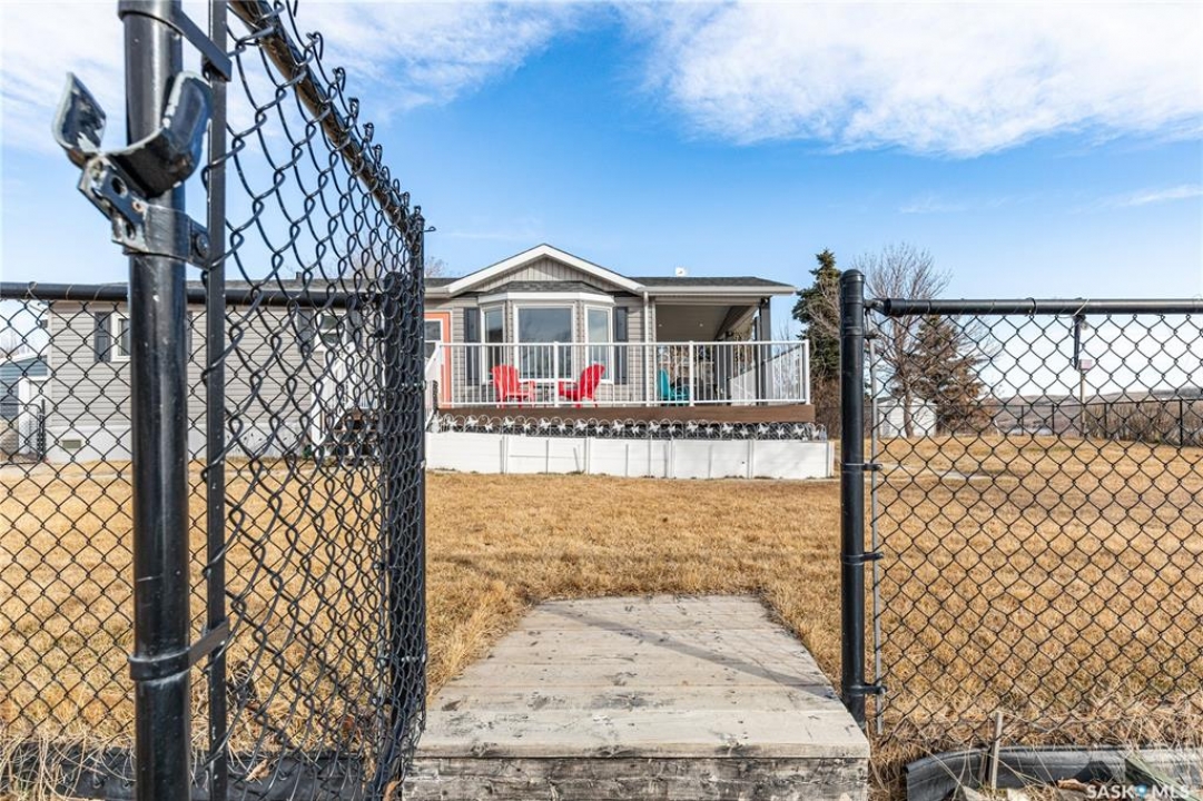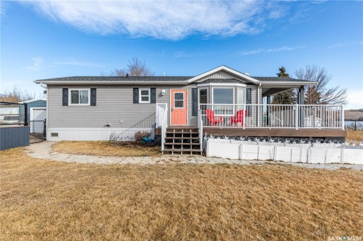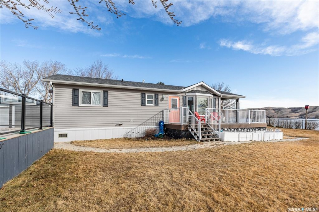Welcome to your waterfront escape at South Lake, Buffalo Pound-where privacy, comfort, and lake life come together. Situated at the very end of a quiet dead-end road, this property offers exceptional seclusion as it's the last home to the east, making it a rare find for those seeking peace and uninterrupted views. This 2013, 809 SQ/ft mobile home features a bright and inviting layout with 2 bedrooms and a beautifully remodelled 4-piece bathroom (2025). Recent upgrades include new triple-pane windows (January 2026) on the east side of the living room and both bedrooms, enhancing energy efficiency and maximizing those stunning lake views. The home is equipped with reverse osmosis, a stove, built-in dishwasher, washer and dryer, and a newer fridge with a clear-view screen. Step outside and enjoy the wraparound deck spanning two sides of the home-perfect for entertaining or relaxing-with a natural gas BBQ hookup ready to go. The 36 x 40 natural gas heated garage is a standout feature, complete with; LED lighting, 220V plugs, a floor drain, and even a convenient “not so private” 2-piece bathroom. There's ample room for all your vehicles, tools, toys, and even a place to watch the game! Behind the garage, you'll find a 20 x 30 private playground space, along with RV parking that includes a power hookup. The tiered lot is thoughtfully designed with multiple outdoor living areas, including a firepit, horseshoe pit, and steps leading down to the water where a deck pad awaits on the shoreline—perfect for soaking up those summer days. A GPS-marked location is already set for your boat lift, adding to the ease of lakefront living. Additional features include underground sprinklers, one storage shed, and a heated 10 x 20 outdoor pool with its own wraparound deck—ideal for entertaining family and friends. Whether you're looking for a year-round home or the perfect lake retreat, this property delivers lifestyle, location, and unmatched privacy.