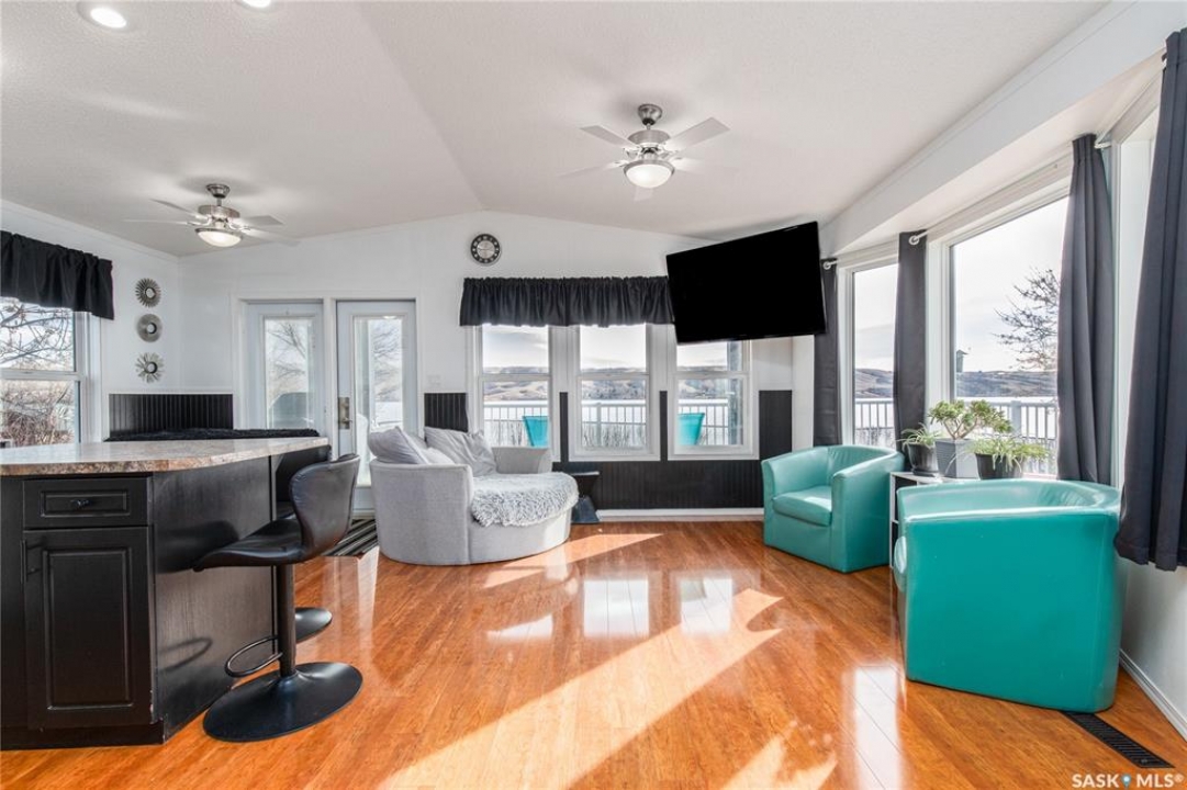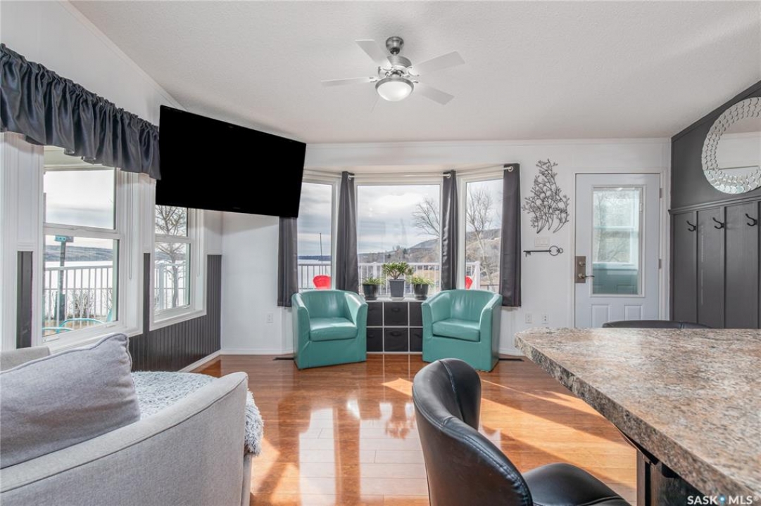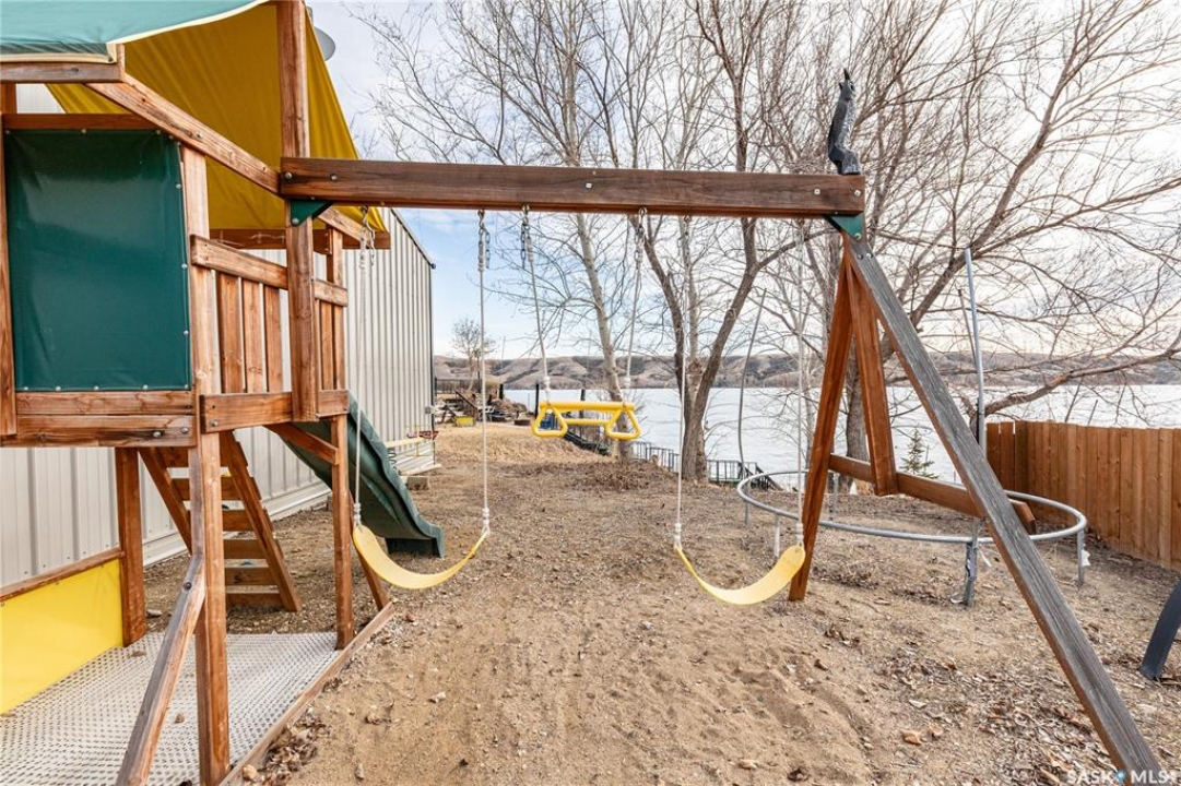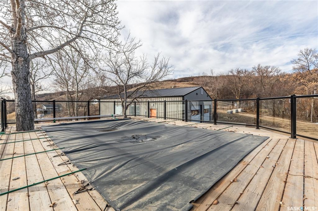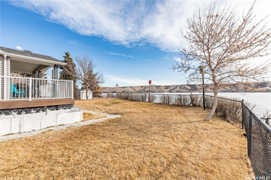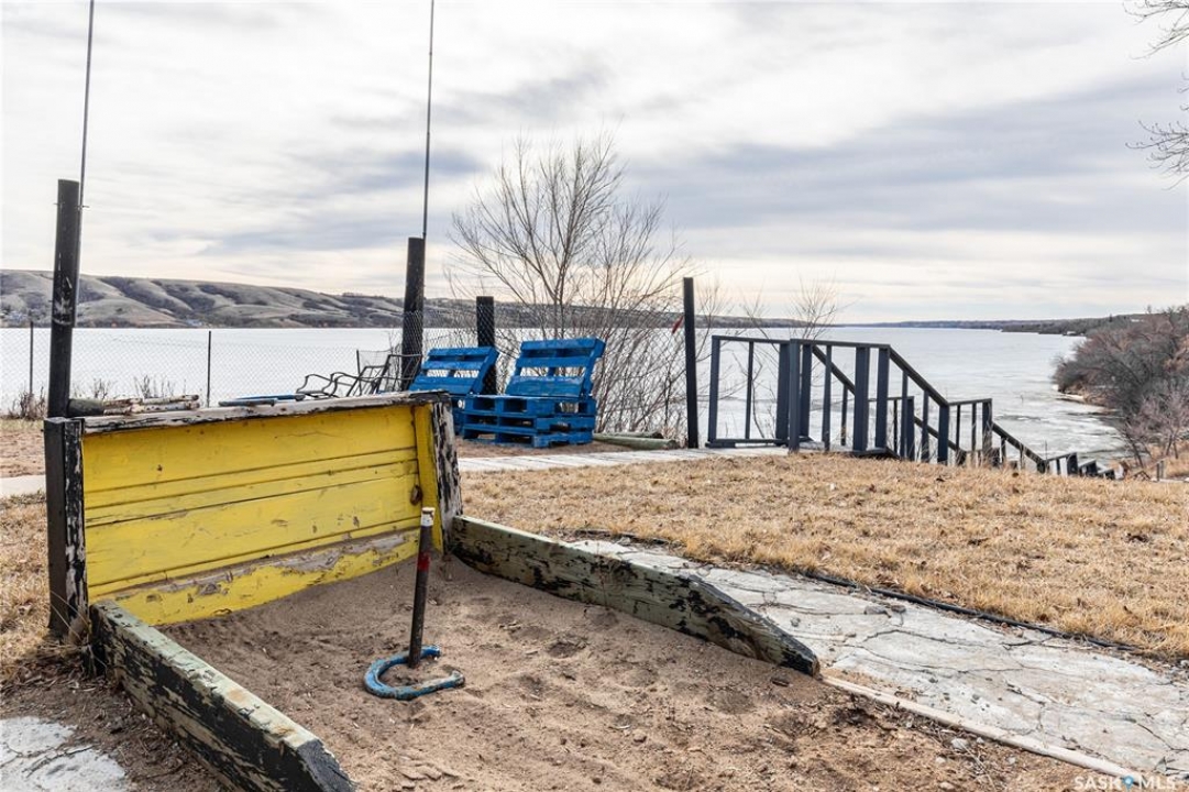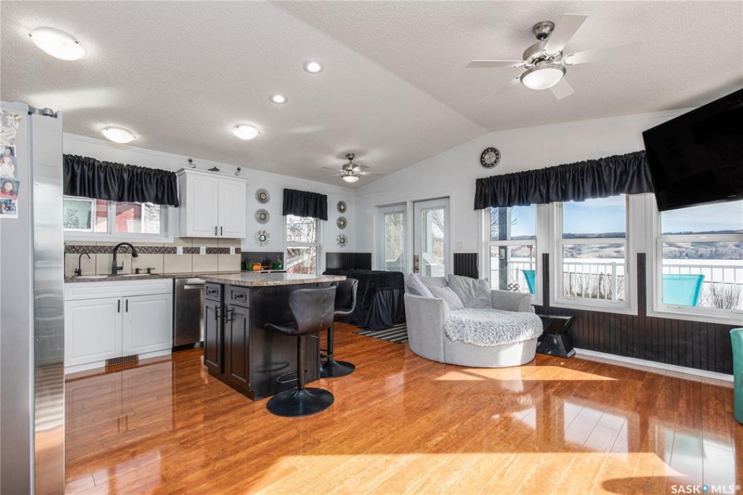 Welcome to your waterfront escape at South Lake, Buffalo Pound-where privacy, comfort, and lake life come together. Situated at the very end of a quiet dead-end road, this property offers exceptional seclusion as it's the last home to the east, making it a rare find for those seeking peace and uninterrupted views. This 2013, 809 SQ/ft mobile home features a bright and inviting layout with 2 bedrooms and a beautifully remodelled 4-piece bathroom (2025). Recent upgrades include new triple-pane windows (January 2026) on the east side of the living room and both bedrooms, enhancing energy efficiency and maximizing those stunning lake views. The home is equipped with reverse osmosis, a stove, built-in dishwasher, washer and dryer, and a newer fridge with a clear-view screen. Step outside and enjoy the wraparound deck spanning two sides of the home-perfect for entertaining or relaxing-with a natural gas BBQ hookup ready to go. The 36 x 40 natural gas heated garage is a standout feature, complete with; LED lighting, 220V plugs, a floor drain, and even a convenient “not so private” 2-piece bathroom. There's ample room for all your vehicles, tools, toys, and even a place to watch the game! Behind the garage, you'll find a 20 x 30 private playground space, along with RV parking that includes a power hookup. The tiered lot is thoughtfully designed with multiple outdoor living areas, including a firepit, horseshoe pit, and steps leading down to the water where a deck pad awaits on the shoreline—perfect for soaking up those summer days. A GPS-marked location is already set for your boat lift, adding to the ease of lakefront living. Additional features include underground sprinklers, one storage shed, and a heated 10 x 20 outdoor pool with its own wraparound deck—ideal for entertaining family and friends. Whether you're looking for a year-round home or the perfect lake retreat, this property delivers lifestyle, location, and unmatched privacy.