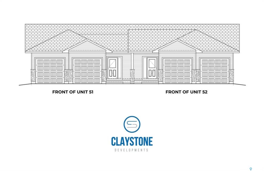 Brand new bungalow-style duplex living in the welcoming community of Hague. Welcome to 52–301 Centennial Road, currently under construction by Claystone Developments, with anticipated possession in February 2027. This thoughtfully designed Unit A offers 1,135 sq ft of main-floor living, 2 bedrooms, 2 bathrooms, and an attached double garage. The open-concept layout features a bright living and dining area that flows seamlessly into an island kitchen designed for everyday ease and entertaining. The primary bedroom includes a walkin closet private off of the ensuite, while a second bedroom and full bathroom provide flexibility for guests or a home office. Main floor laundry adds everyday convenience. Designed with minimal entry steps and true main floor living, this home is ideal for those seeking simplified, low-maintenance living without interior stairs. While not designated as accessible, the layout offers a comfortable, functional design. The attached double garage measures approximately 23' x 23'6” (per builder plans) and provides direct entry into the home. The basement remains undeveloped, offering excellent potential for future development, additional living space, or storage. Included in the purchase price are a concrete driveway, central air conditioning, completed landscaping, and fencing, with a deck available at additional cost. Hague offers a strong community atmosphere with a K–12 school, daycare, arena, spray park, playgrounds, and local amenities, with Warman and Rosthern both less than 10 minutes away and Saskatoon within comfortable commuting distance. Call today to learn more about this upcoming property!
