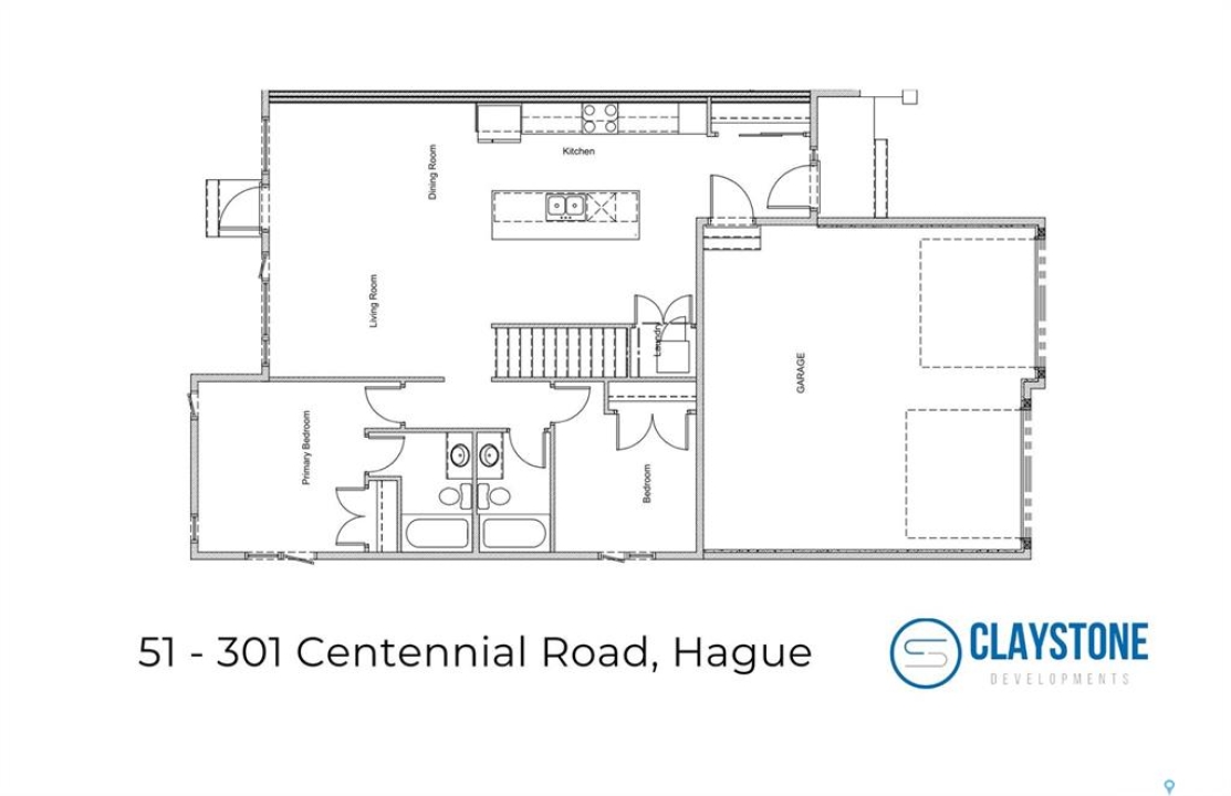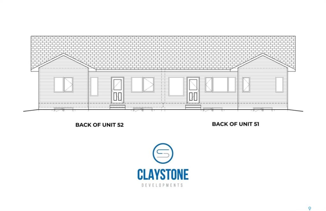 Brand new bungalow-style duplex living in the welcoming community of Hague. Welcome to 51–301 Centennial Road, currently under construction by Claystone Developments, with anticipated possession February 2027. This thoughtfully designed Unit A offers 1,145 sq ft of main-floor living, 2 bedrooms, 2 bathrooms, and an attached double garage. The open-concept layout features a bright living and dining area that flows seamlessly into an island kitchen designed for everyday ease and entertaining. The primary bedroom includes private ensuite, while a second bedroom and full bathroom provide flexibility for guests or a home office. Main floor laundry adds everyday convenience. Designed with minimal entry steps and true main floor living, this home is ideal for those seeking simplified, low-maintenance living without interior stairs. While not designated as accessible, the layout offers a comfortable, functional design. The attached double garage measures approximately 23' x 23'6” (per builder plans) and provides direct entry into the home. The basement remains undeveloped, offering excellent potential for future development, additional living space, or storage. Included in the purchase price are a concrete driveway, central air conditioning, completed landscaping, and fencing, with a deck available at additional cost. Hague offers a strong community atmosphere with a K–12 school, daycare, arena, spray park, playgrounds, and local amenities, with Warman and Rosthern both less than 10 minutes away and Saskatoon within comfortable commuting distance. Call today to learn more about this upcoming property!