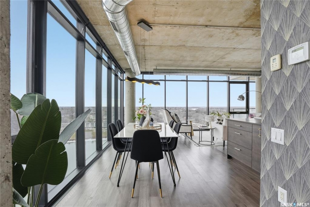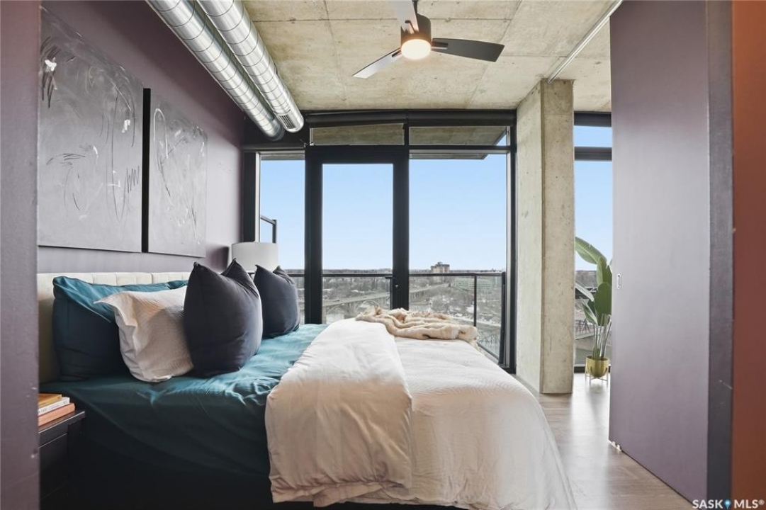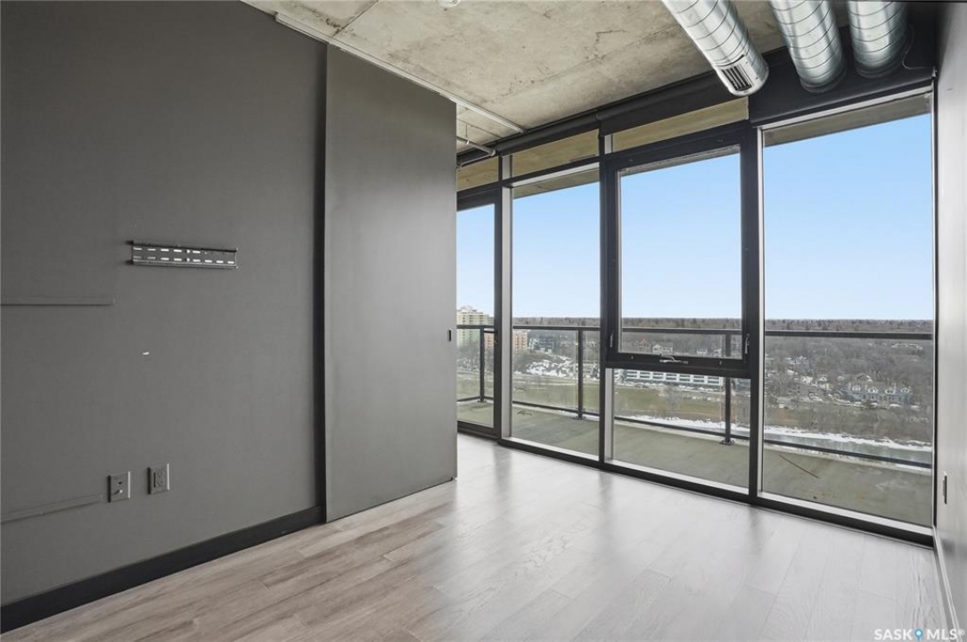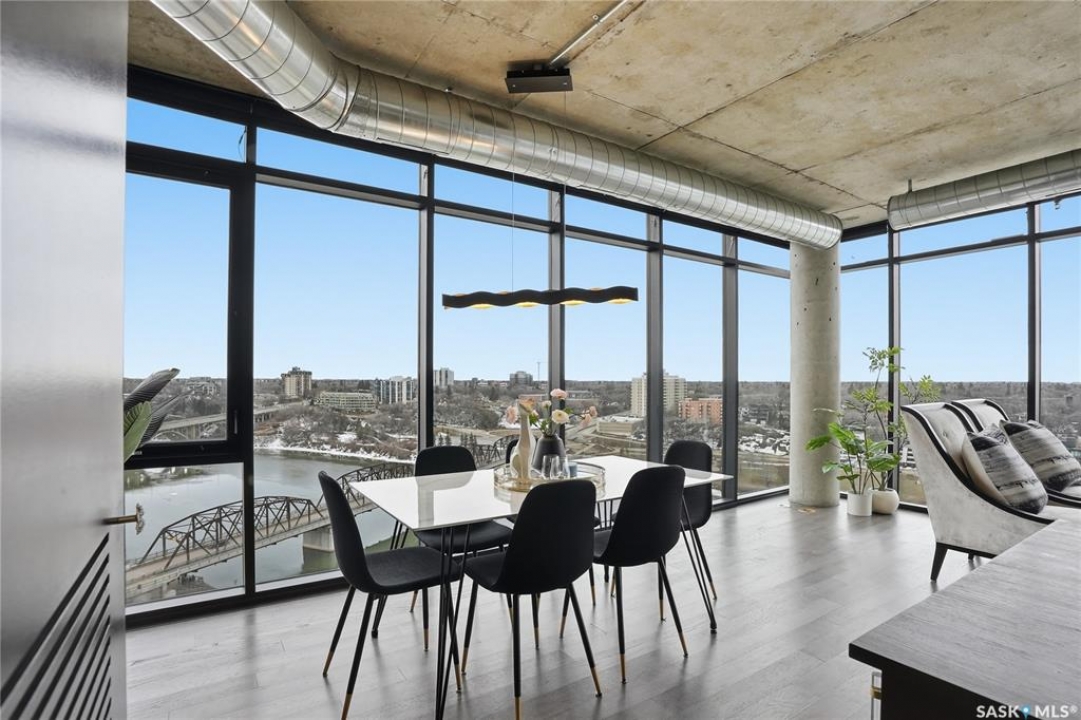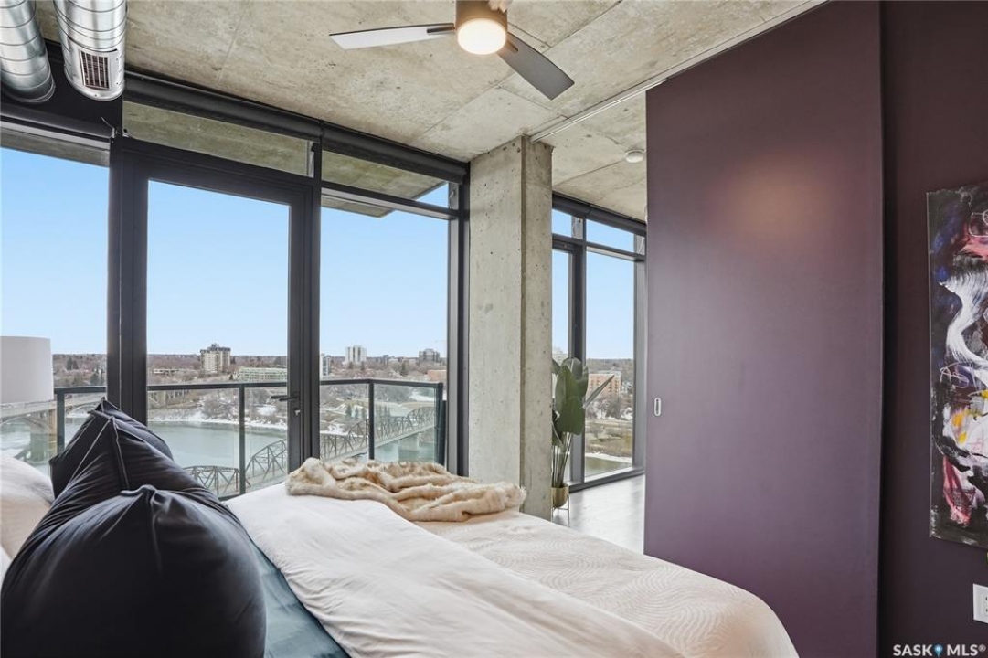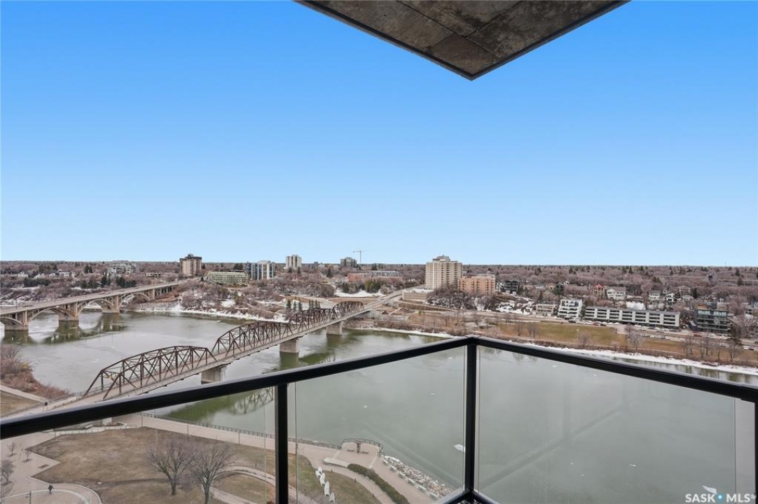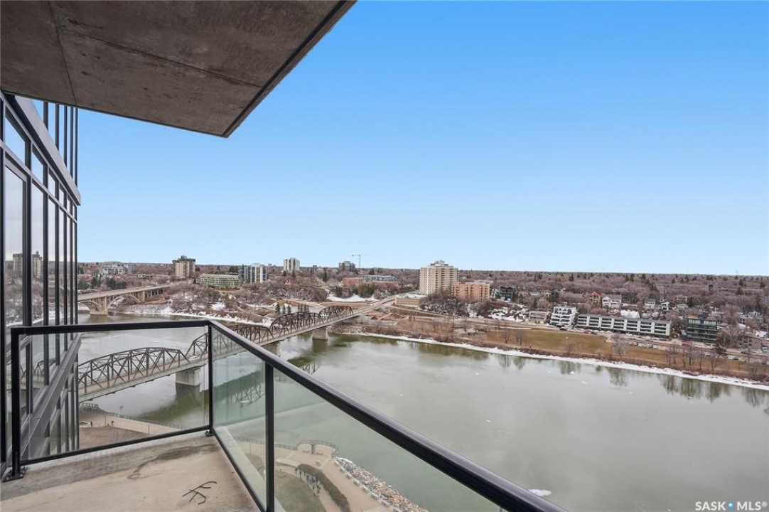 Located in No. 1 River Landing, 15 floors up with floor to ceiling glass wrapping the east and south exposures. Unobstructed views of the river, bridges, and downtown skyline. Inside, the space has been extensively customized with a bold, design-forward approach. The kitchen is anchored by an oversized extended island with quartz countertops, a corner pantry, and a refined mix of modern cabinetry and warm wood tones. A fully built-in bar with custom cabinetry, wine fridge, and additional beverage and food refrigeration creates a true entertaining space, complemented by statement wallpaper and upgraded lighting. The open concept living area is defined by engineered hardwood flooring, raw concrete ceilings, and exposed ductwork, blending industrial elements with elevated finishes. Automatic WiFi controlled blinds and dual zone heating and cooling add both comfort and convenience. This two bedroom, two bathroom layout includes a private primary suite with a walk through custom closet, upgraded ensuite with integrated lighting, and direct access to one of two balconies. A second south facing balcony extends off the main living area. Additional features include in suite laundry, upgraded paint and wallpaper accents throughout, and a separately purchased storage unit. Titled underground parking stall included. Positioned along the river valley in the heart of downtown, with trails, restaurants, and amenities just steps away. Located in one of the city's premier riverfront buildings with access to a gym and resident lounge. A refined, lock and leave lifestyle in one of Saskatoon's most sought after riverfront locations. Every detail has been intentionally designed, offering a level of finish and customization rarely found in condo living.