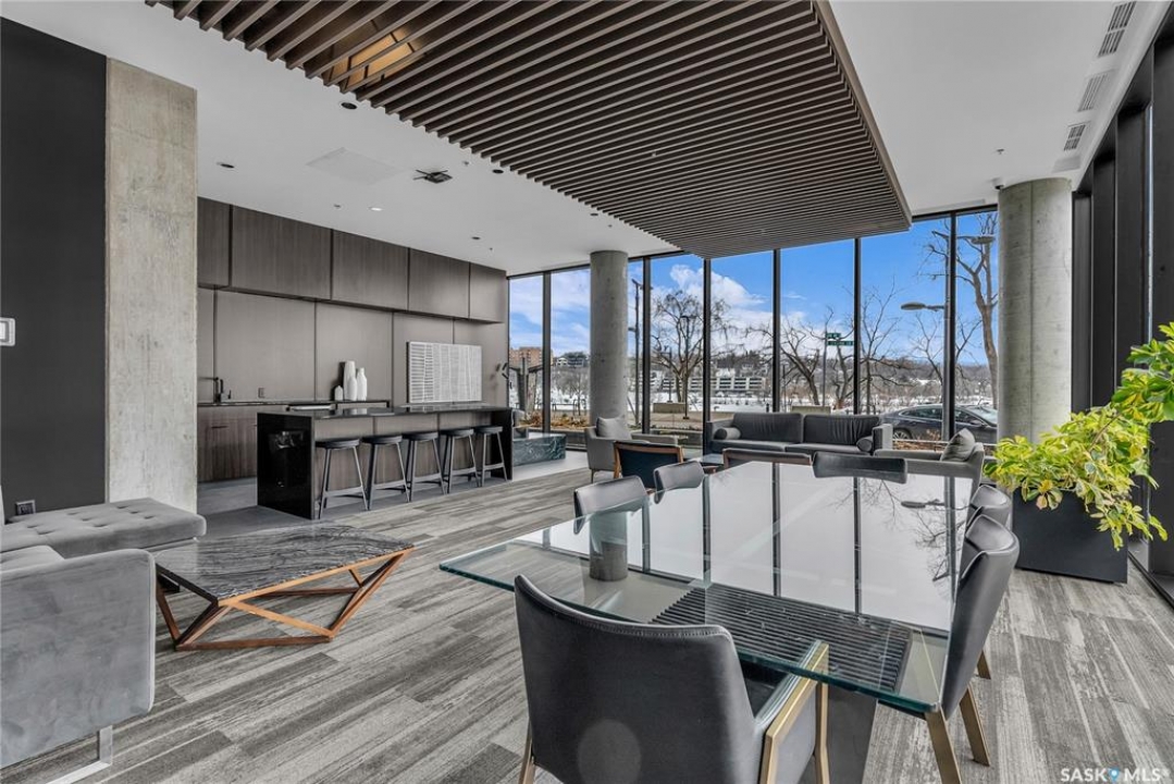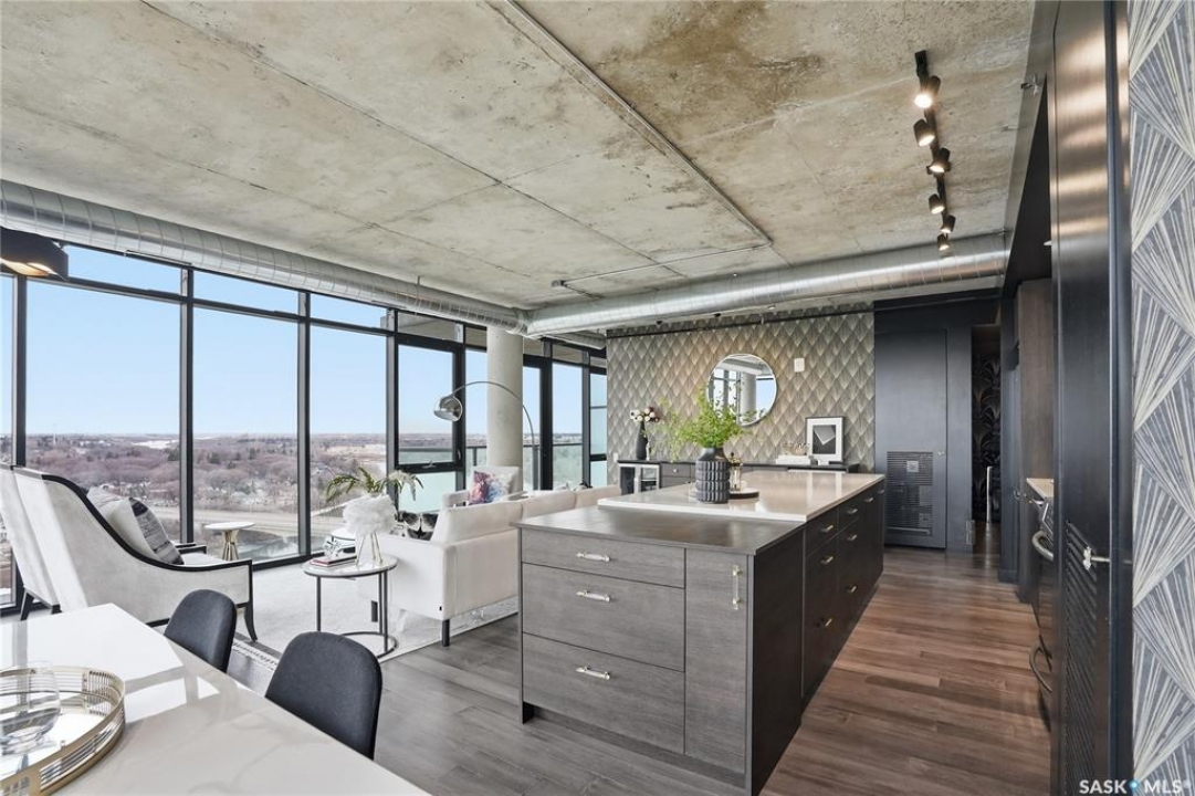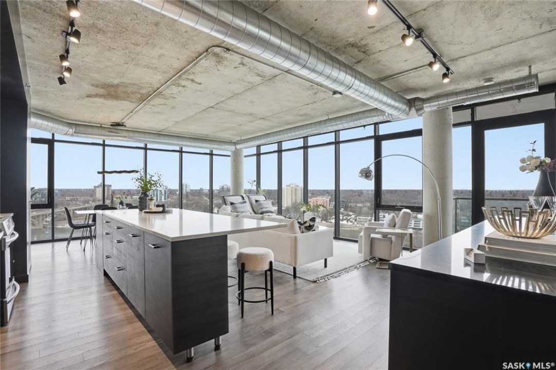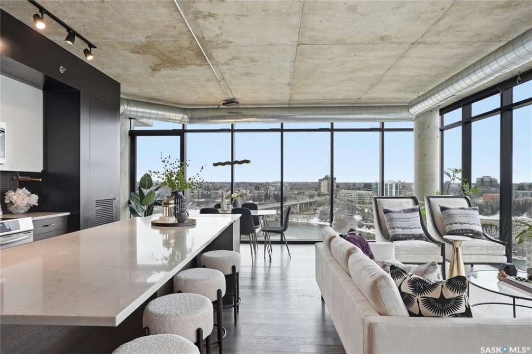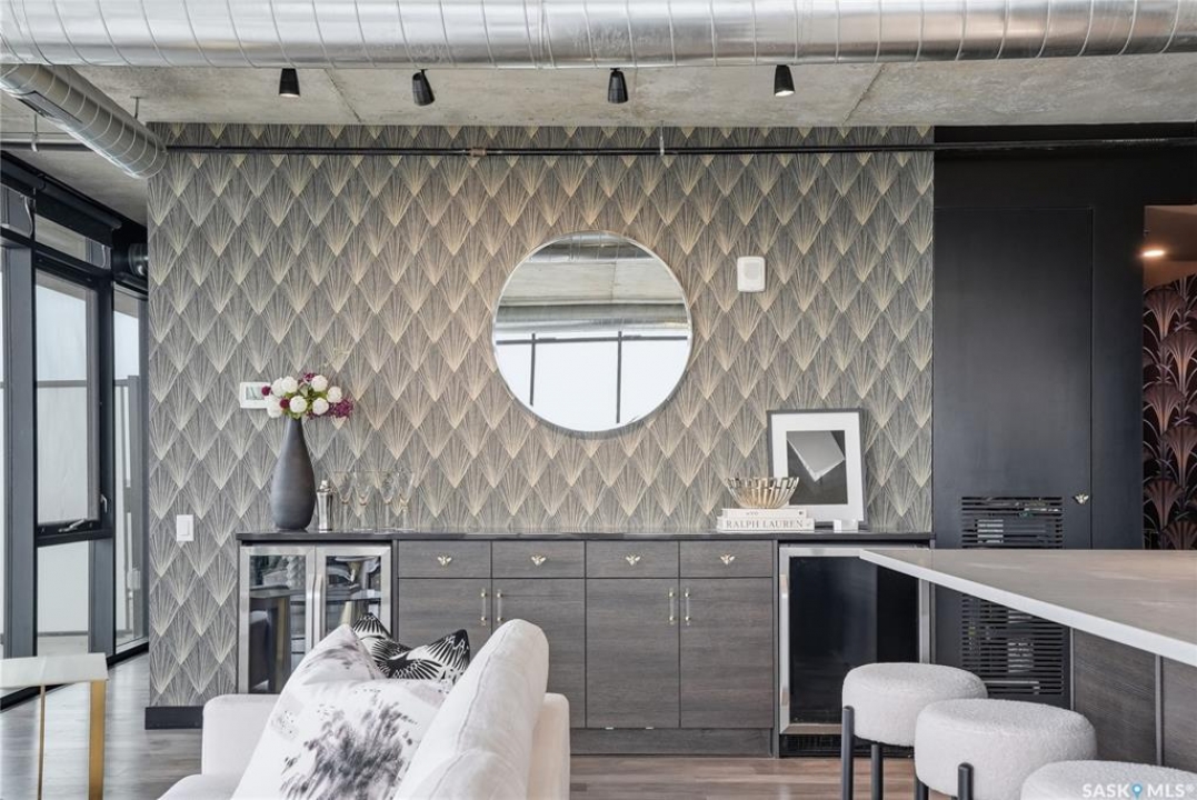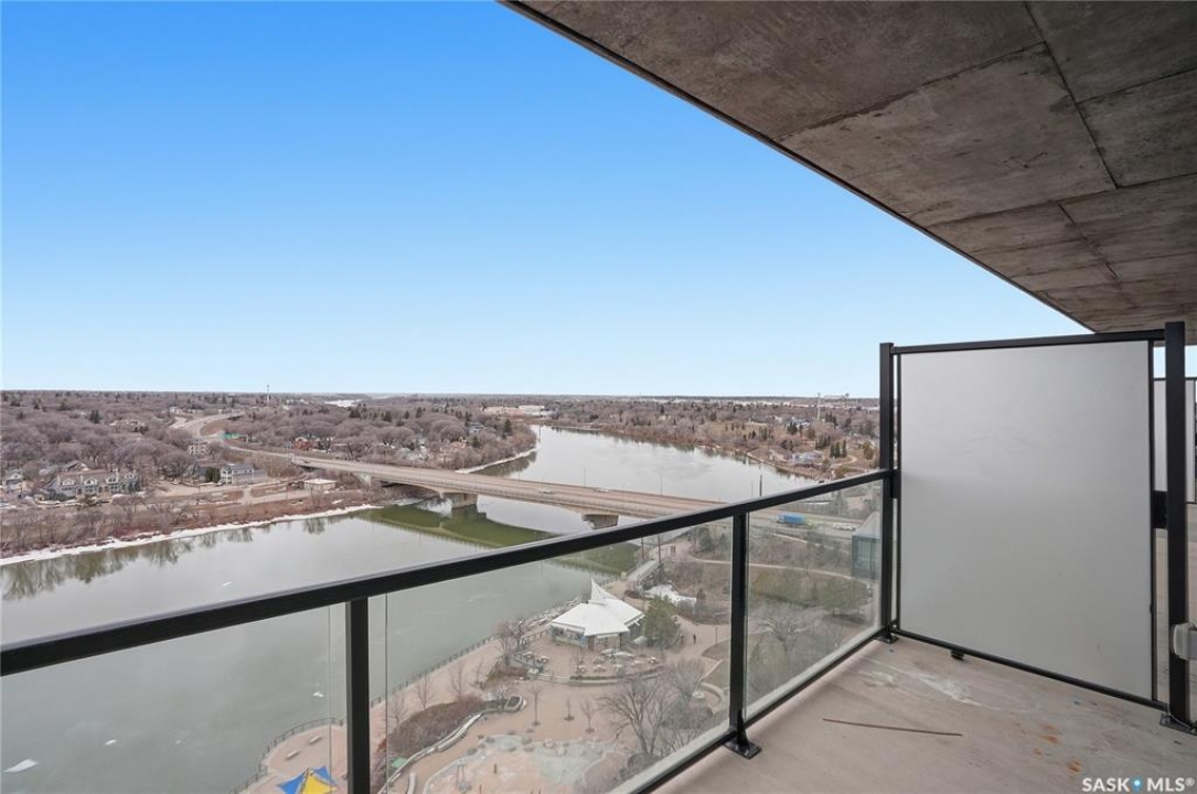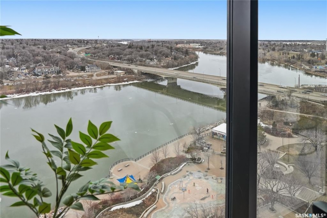 Located in No. 1 River Landing, 15 floors up with floor to ceiling glass wrapping the east and south exposures. Unobstructed views of the river, bridges, and downtown skyline. Inside, the space has been extensively customized with a bold, design-forward approach. The kitchen is anchored by an oversized extended island with quartz countertops, a corner pantry, and a refined mix of modern cabinetry and warm wood tones. A fully built-in bar with custom cabinetry, wine fridge, and additional beverage and food refrigeration creates a true entertaining space, complemented by statement wallpaper and upgraded lighting. The open concept living area is defined by engineered hardwood flooring, raw concrete ceilings, and exposed ductwork, blending industrial elements with elevated finishes. Automatic WiFi controlled blinds and dual zone heating and cooling add both comfort and convenience. This two bedroom, two bathroom layout includes a private primary suite with a walk through custom closet, upgraded ensuite with integrated lighting, and direct access to one of two balconies. A second south facing balcony extends off the main living area. Additional features include in suite laundry, upgraded paint and wallpaper accents throughout, and a separately purchased storage unit. Titled underground parking stall included. Positioned along the river valley in the heart of downtown, with trails, restaurants, and amenities just steps away. Located in one of the city's premier riverfront buildings with access to a gym and resident lounge. A refined, lock and leave lifestyle in one of Saskatoon's most sought after riverfront locations. Every detail has been intentionally designed, offering a level of finish and customization rarely found in condo living.
