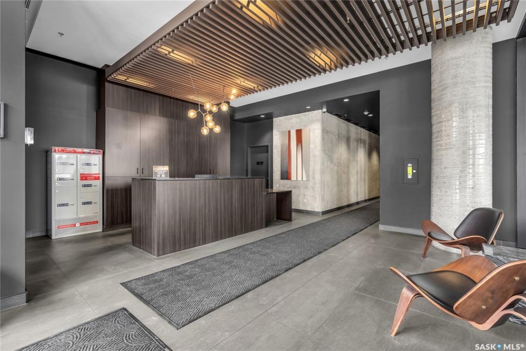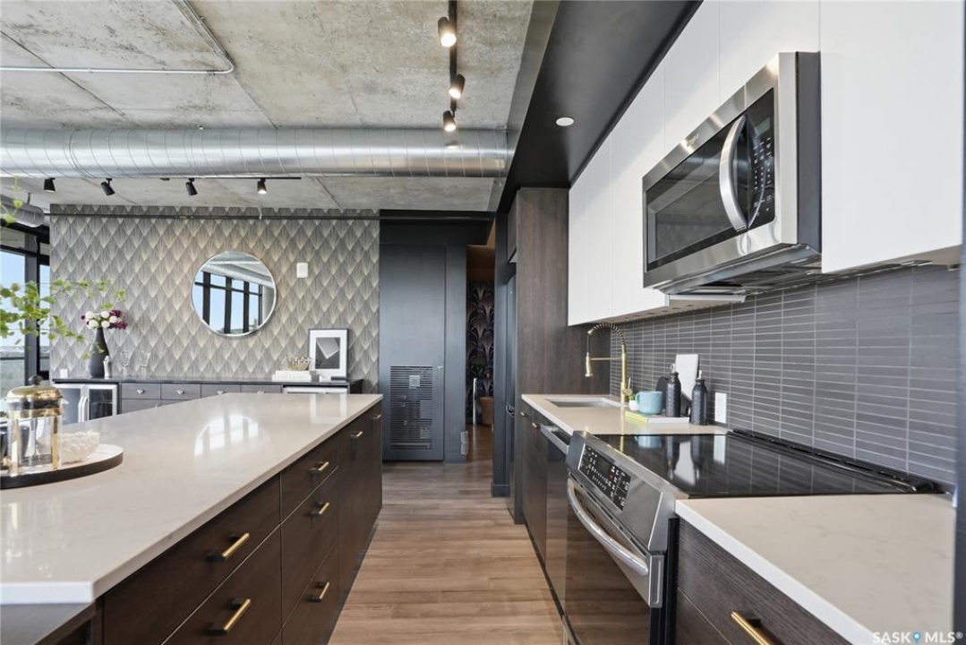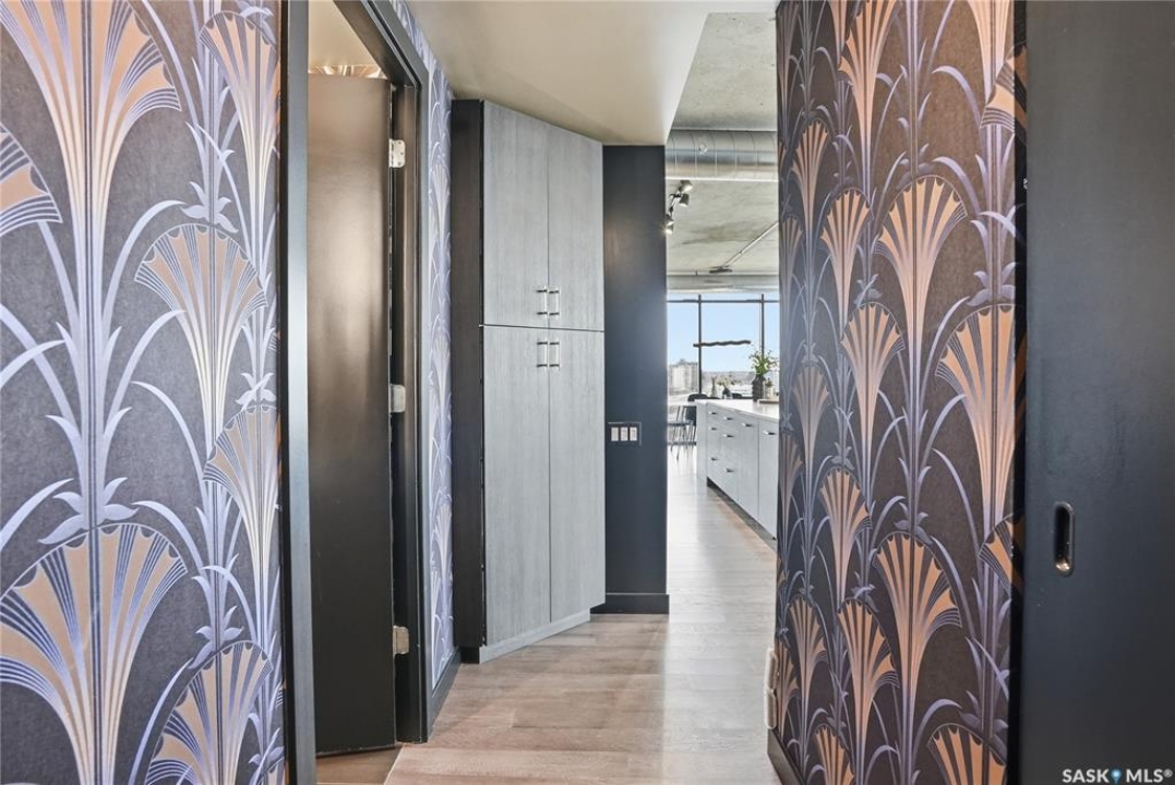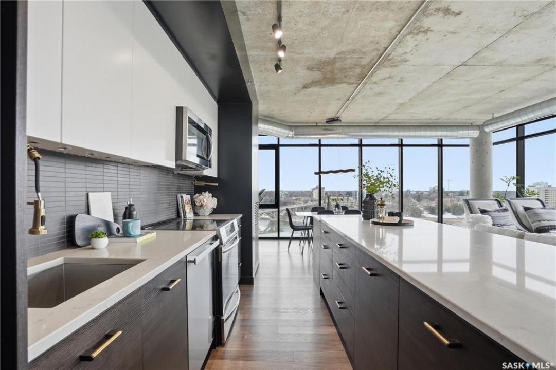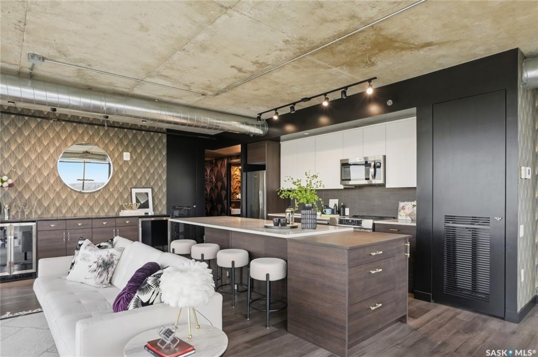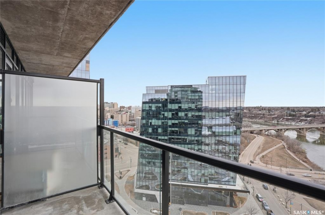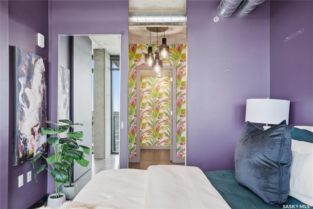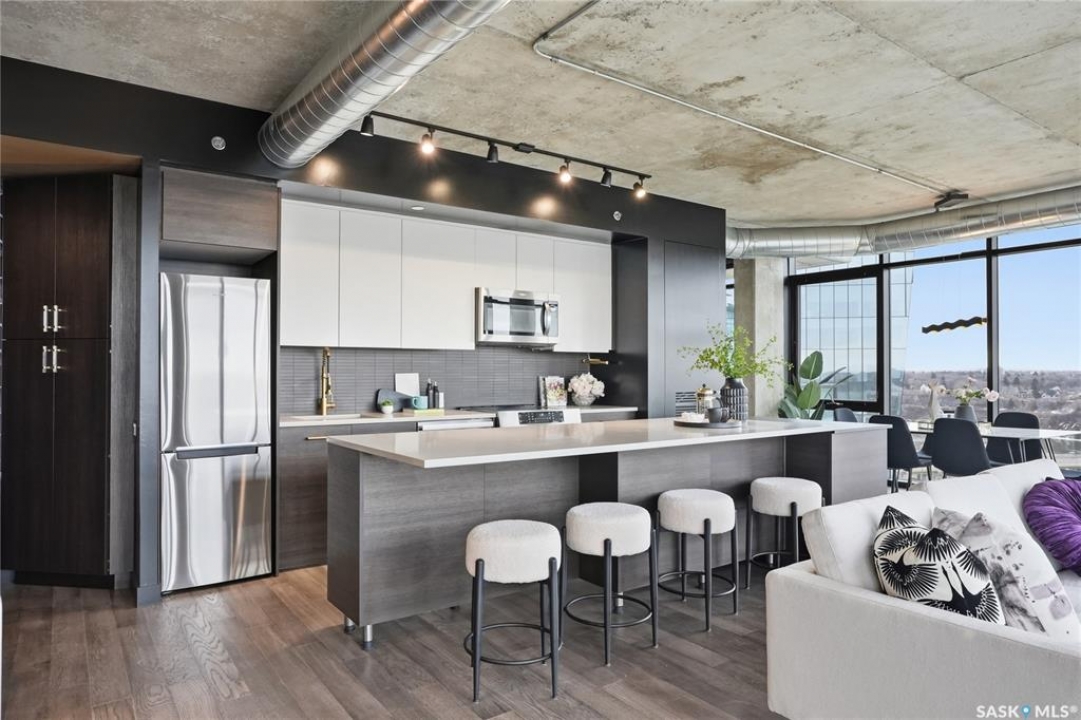 Located in No. 1 River Landing, 15 floors up with floor to ceiling glass wrapping the east and south exposures. Unobstructed views of the river, bridges, and downtown skyline. Inside, the space has been extensively customized with a bold, design-forward approach. The kitchen is anchored by an oversized extended island with quartz countertops, a corner pantry, and a refined mix of modern cabinetry and warm wood tones. A fully built-in bar with custom cabinetry, wine fridge, and additional beverage and food refrigeration creates a true entertaining space, complemented by statement wallpaper and upgraded lighting. The open concept living area is defined by engineered hardwood flooring, raw concrete ceilings, and exposed ductwork, blending industrial elements with elevated finishes. Automatic WiFi controlled blinds and dual zone heating and cooling add both comfort and convenience. This two bedroom, two bathroom layout includes a private primary suite with a walk through custom closet, upgraded ensuite with integrated lighting, and direct access to one of two balconies. A second south facing balcony extends off the main living area. Additional features include in suite laundry, upgraded paint and wallpaper accents throughout, and a separately purchased storage unit. Titled underground parking stall included. Positioned along the river valley in the heart of downtown, with trails, restaurants, and amenities just steps away. Located in one of the city's premier riverfront buildings with access to a gym and resident lounge. A refined, lock and leave lifestyle in one of Saskatoon's most sought after riverfront locations. Every detail has been intentionally designed, offering a level of finish and customization rarely found in condo living.
