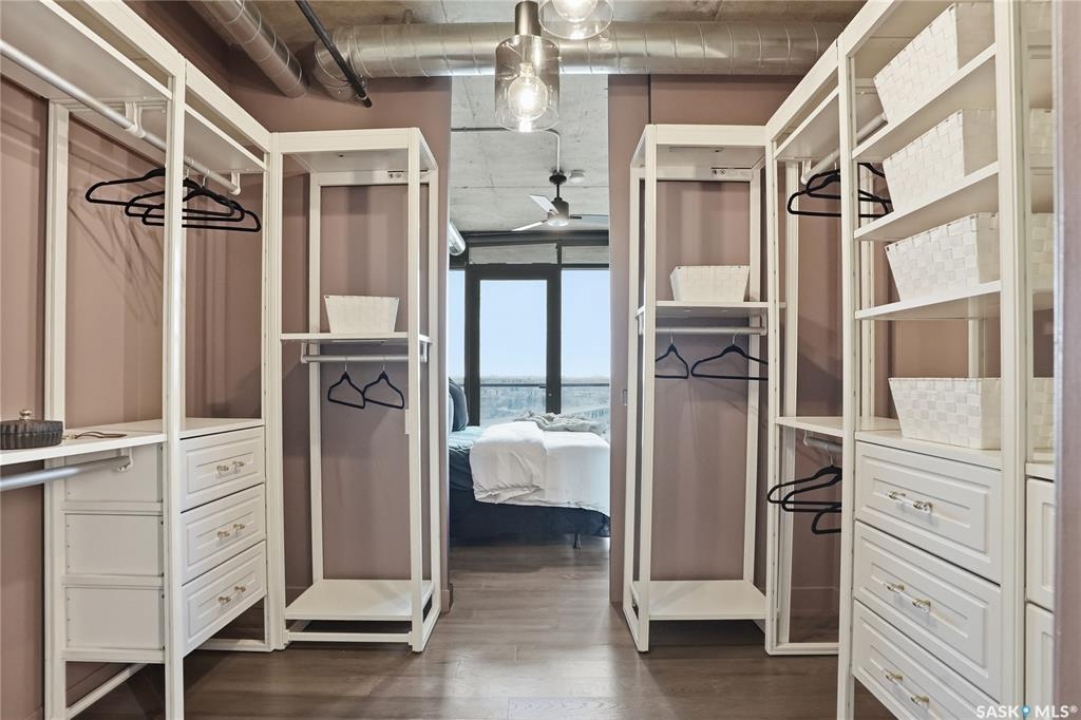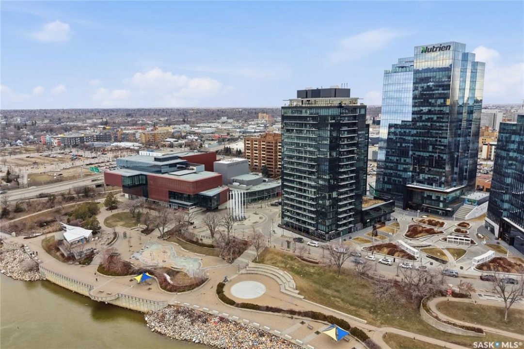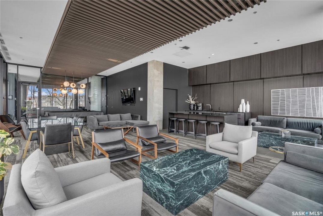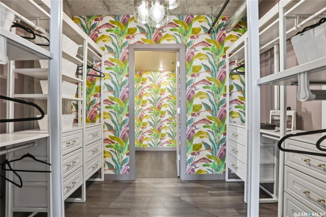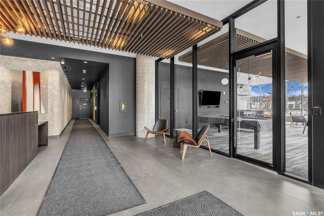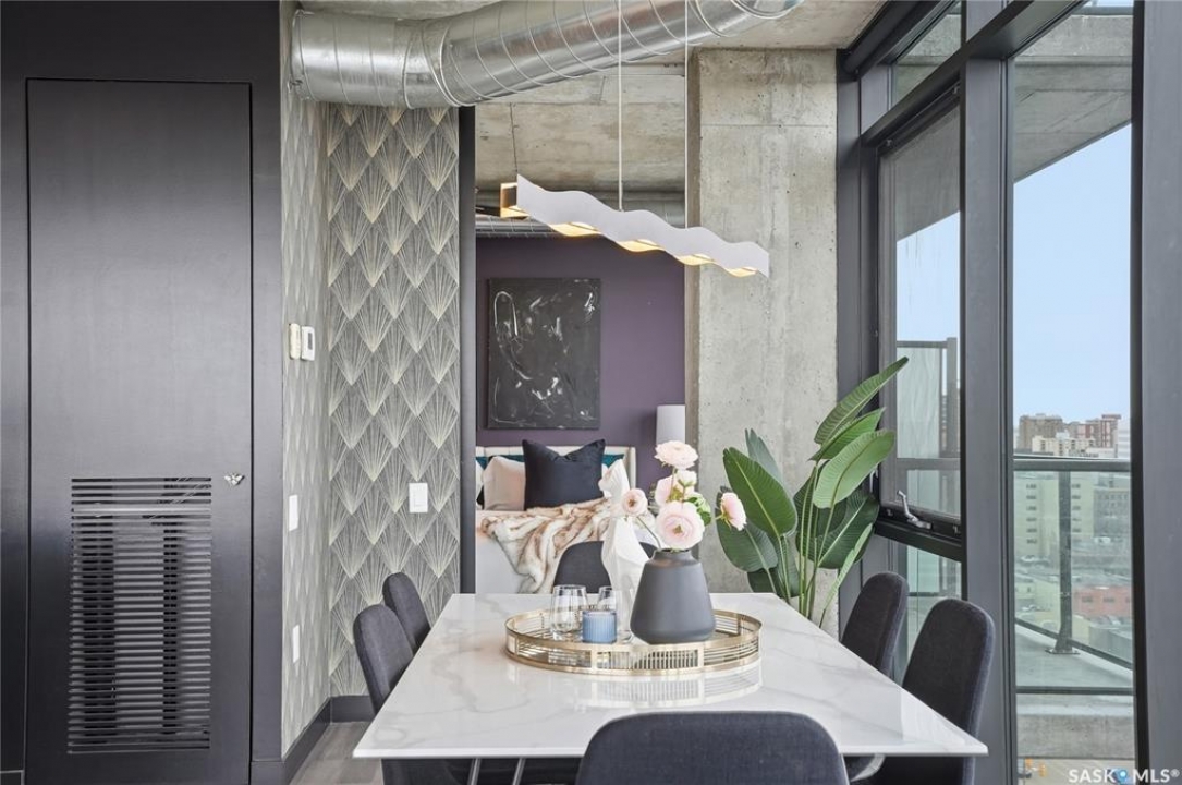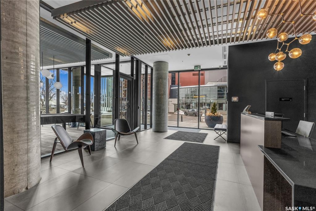 Located in No. 1 River Landing, 15 floors up with floor to ceiling glass wrapping the east and south exposures. Unobstructed views of the river, bridges, and downtown skyline. Inside, the space has been extensively customized with a bold, design-forward approach. The kitchen is anchored by an oversized extended island with quartz countertops, a corner pantry, and a refined mix of modern cabinetry and warm wood tones. A fully built-in bar with custom cabinetry, wine fridge, and additional beverage and food refrigeration creates a true entertaining space, complemented by statement wallpaper and upgraded lighting. The open concept living area is defined by engineered hardwood flooring, raw concrete ceilings, and exposed ductwork, blending industrial elements with elevated finishes. Automatic WiFi controlled blinds and dual zone heating and cooling add both comfort and convenience. This two bedroom, two bathroom layout includes a private primary suite with a walk through custom closet, upgraded ensuite with integrated lighting, and direct access to one of two balconies. A second south facing balcony extends off the main living area. Additional features include in suite laundry, upgraded paint and wallpaper accents throughout, and a separately purchased storage unit. Titled underground parking stall included. Positioned along the river valley in the heart of downtown, with trails, restaurants, and amenities just steps away. Located in one of the city's premier riverfront buildings with access to a gym and resident lounge. A refined, lock and leave lifestyle in one of Saskatoon's most sought after riverfront locations. Every detail has been intentionally designed, offering a level of finish and customization rarely found in condo living.