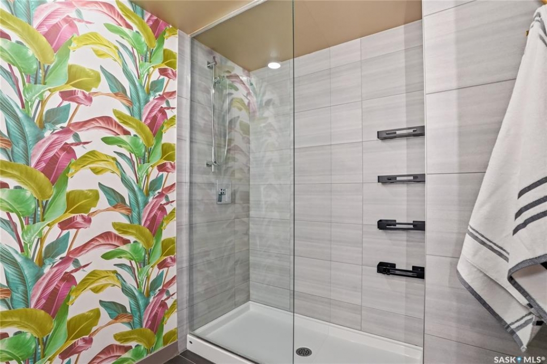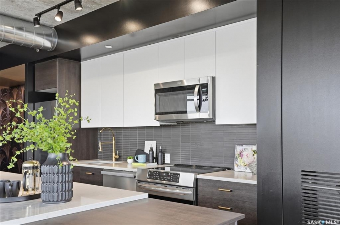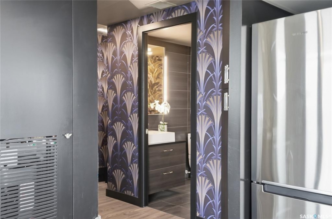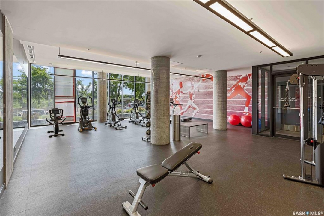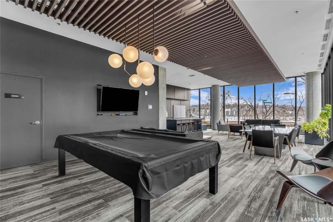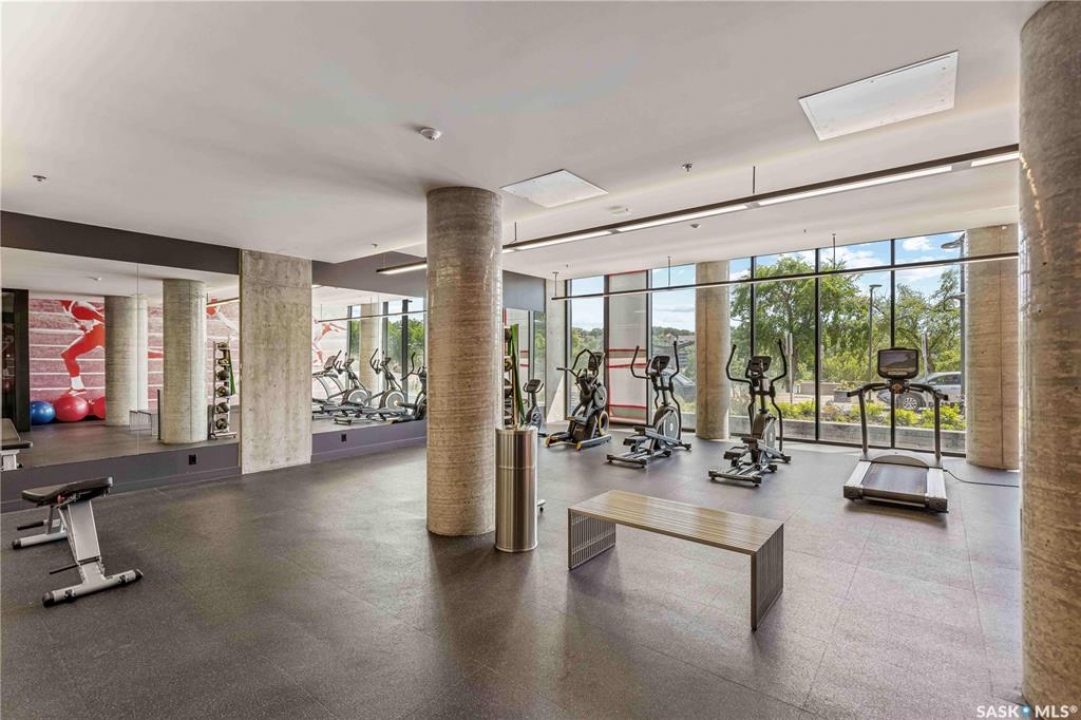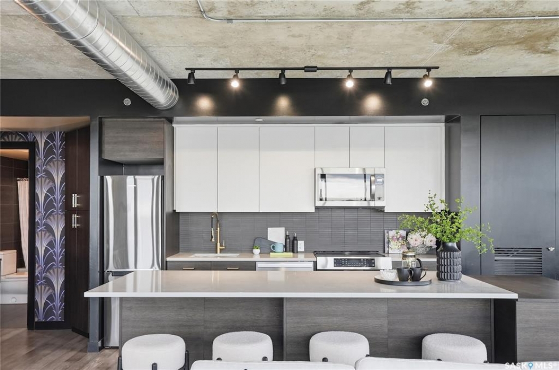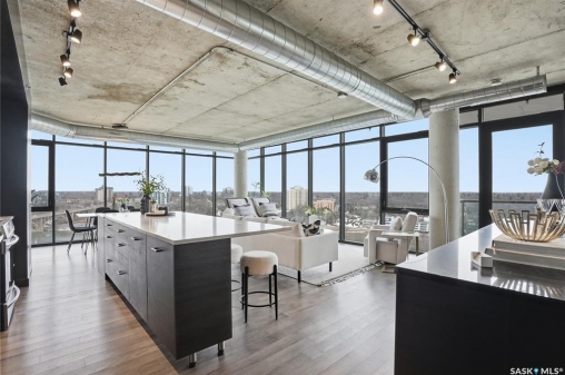 Located in No. 1 River Landing, 15 floors up with floor to ceiling glass wrapping the east and south exposures. Unobstructed views of the river, bridges, and downtown skyline. Inside, the space has been extensively customized with a bold, design-forward approach. The kitchen is anchored by an oversized extended island with quartz countertops, a corner pantry, and a refined mix of modern cabinetry and warm wood tones. A fully built-in bar with custom cabinetry, wine fridge, and additional beverage and food refrigeration creates a true entertaining space, complemented by statement wallpaper and upgraded lighting. The open concept living area is defined by engineered hardwood flooring, raw concrete ceilings, and exposed ductwork, blending industrial elements with elevated finishes. Automatic WiFi controlled blinds and dual zone heating and cooling add both comfort and convenience. This two bedroom, two bathroom layout includes a private primary suite with a walk through custom closet, upgraded ensuite with integrated lighting, and direct access to one of two balconies. A second south facing balcony extends off the main living area. Additional features include in suite laundry, upgraded paint and wallpaper accents throughout, and a separately purchased storage unit. Titled underground parking stall included. Positioned along the river valley in the heart of downtown, with trails, restaurants, and amenities just steps away. Located in one of the city's premier riverfront buildings with access to a gym and resident lounge. A refined, lock and leave lifestyle in one of Saskatoon's most sought after riverfront locations. Every detail has been intentionally designed, offering a level of finish and customization rarely found in condo living.
