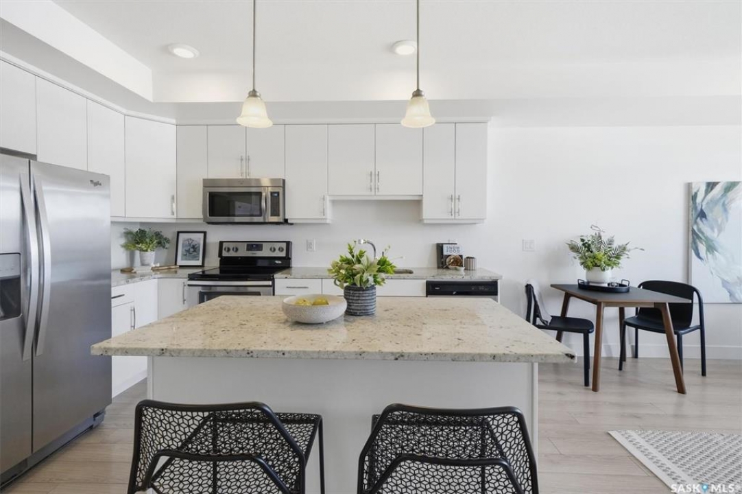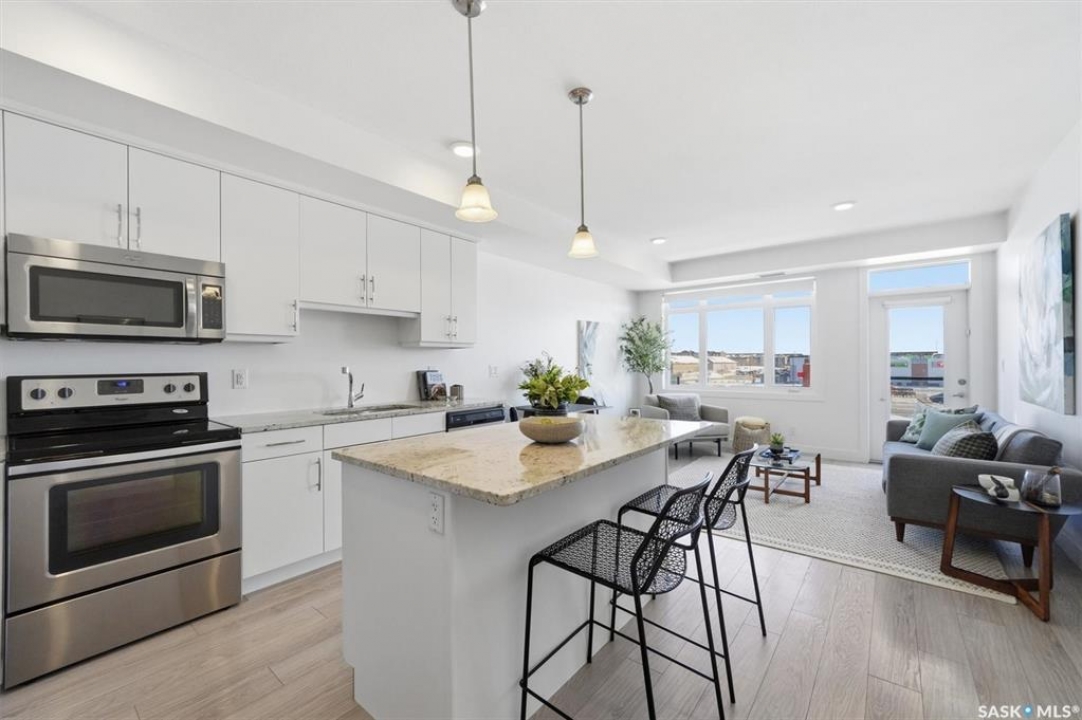 Welcome to this well-designed condo in the heart of Kensington, offering a bright and functional space in a location buyers love. The open-concept layout is filled with natural light, thanks to its south-facing exposure, keeping the main living areas warm and sunny throughout the day. The kitchen is a standout feature, complete with granite countertops, stainless steel appliances, ample cabinetry, and a spacious island with eat-up seating, perfect for both everyday living and entertaining. This unit offers two bedrooms, including a primary suite with a walk-in closet and a four-piece ensuite, along with a second full bathroom. Step out onto the south-facing balcony to enjoy your own sun-soaked outdoor space, ideal for morning coffee or winding down at the end of the day. You'll appreciate the added value of two parking stalls: one secure, heated underground stall and one non-electrified surface stall. Additional features include in-suite laundry, central air conditioning, forced-air heating, and elevator access. Located just steps from Kensington's shops, restaurants, groceries, parks, and more, with quick access to main routes. Bright, functional, and in a prime location—this is an easy one to step into.