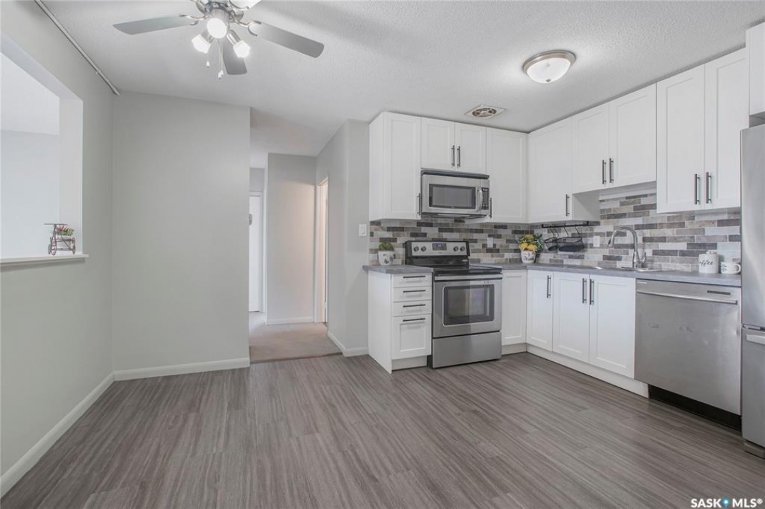 Welcome to 32–3113 7th Street East in the heart of Brevoort Park! This bright top-floor corner unit is perfectly located close to schools, shopping, grocery stores, public transit, and all essential amenities, making it an ideal choice for first-time buyers, young families, students, or savvy investors. This beautifully updated 2-bedroom, 1-bathroom third-level suite features numerous renovations, including a modern kitchen, refreshed bedrooms, and a stylish bathroom, creating a clean and inviting living space. The spacious layout offers well-sized bedrooms and a large kitchen that opens to the living room, complete with L-shaped cabinetry, tile backsplash, new flooring, a dedicated dining area, and a generous walk-in pantry. The upgraded bathroom boasts a luxurious full-tile shower and tile flooring, while additional highlights include shared laundry on the lower level, one electrified exterior parking stall, and thoughtful upgrades throughout that reflect true pride of ownership. Affordable and move-in ready, this home is priced to sell—book your private showing today!