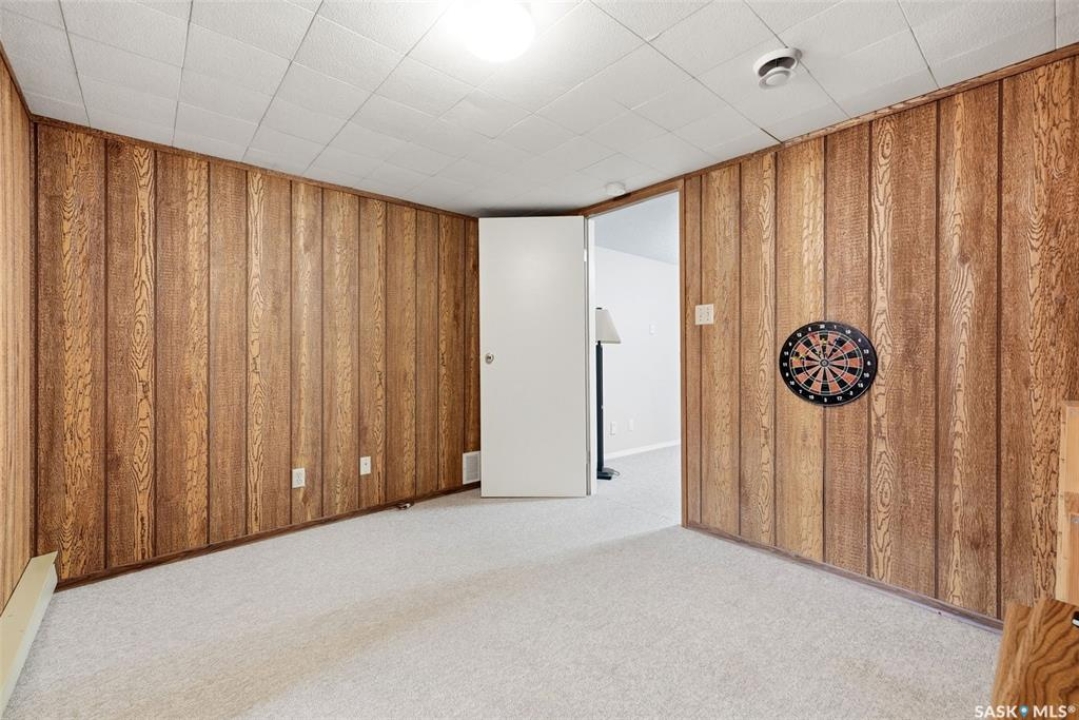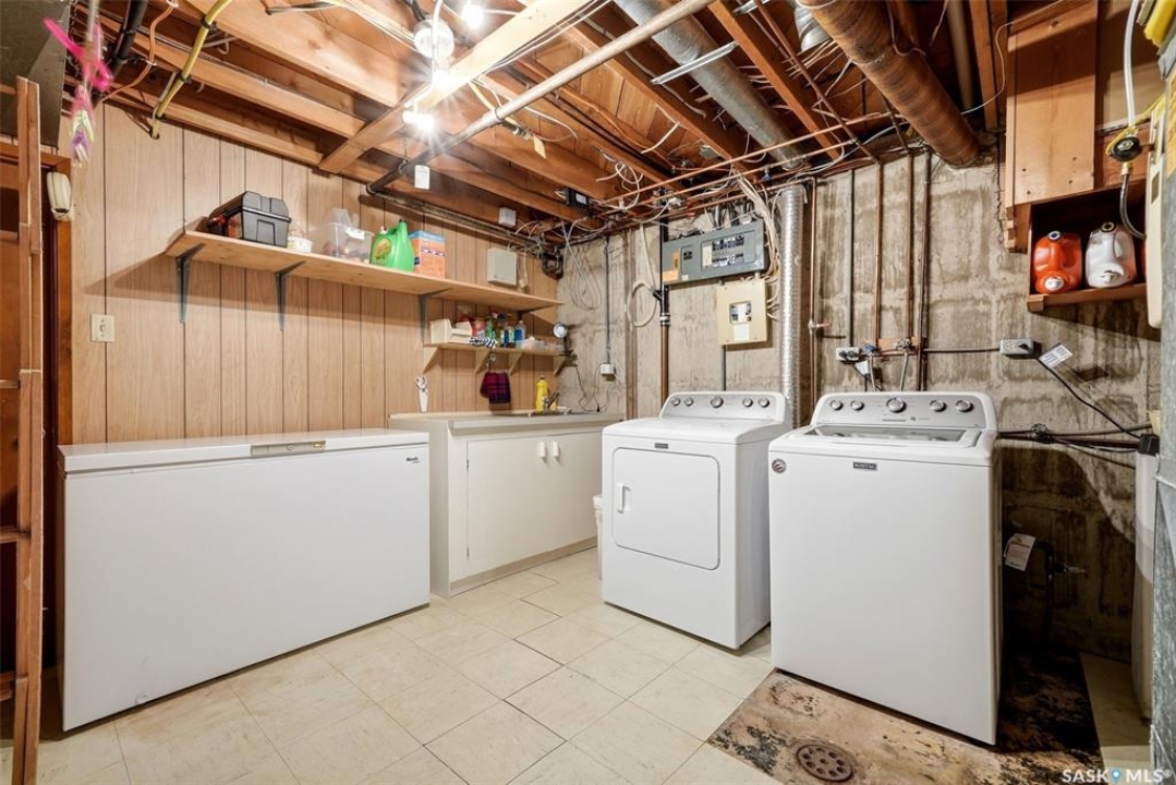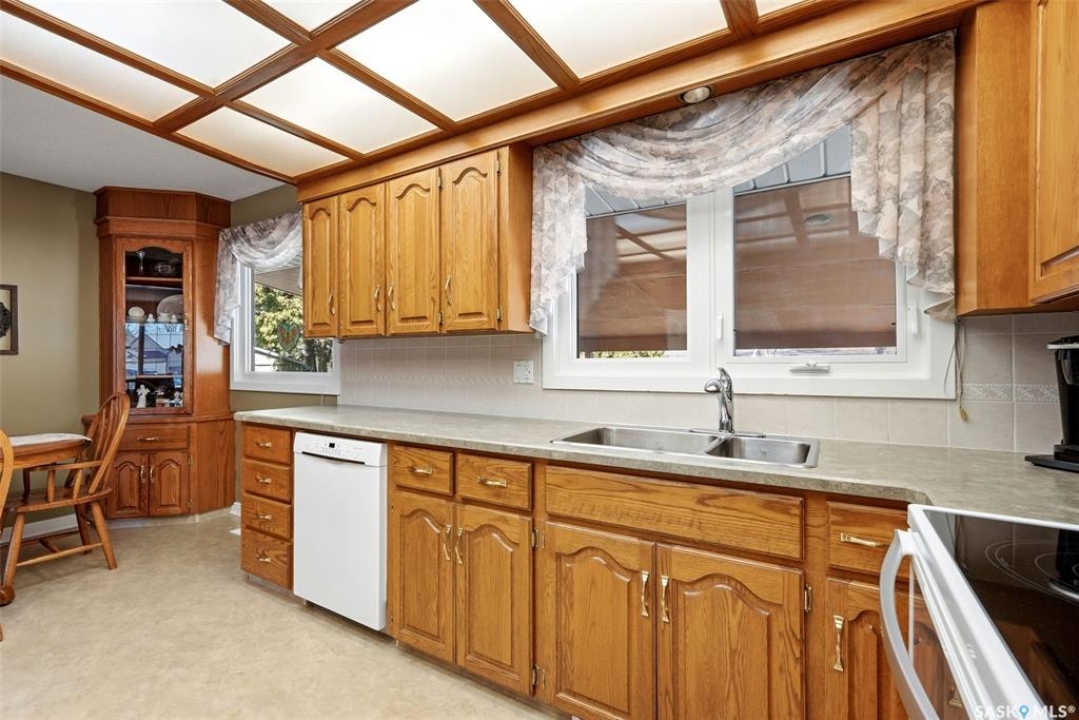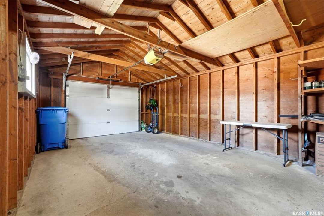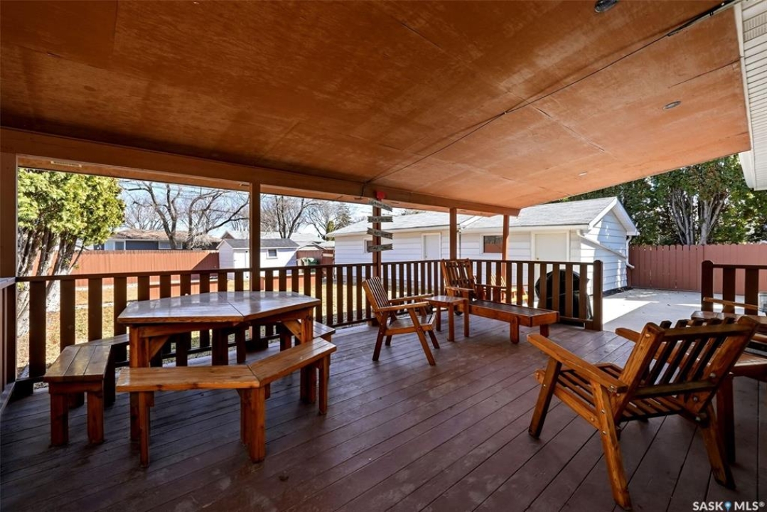 Welcome to 4027 Elphinstone Street—lovingly maintained by its original owners and thoughtfully updated over the past 60 years. Situated on a quiet street in desirable Parliament Place, this home offers fantastic street appeal! Step inside to a bright and spacious living room featuring three large updated triple-pane picture windows with custom cellular blinds (2023), allowing for an abundance of natural light. All windows on the main level have been updated to PVC. A cozy gas fireplace, added in 2003, creates a warm and inviting atmosphere. The living room flows seamlessly into the dining area and kitchen. Solid oak kitchen, updated in the 1990s, offers excellent functionality with a pantry featuring pullouts, pot drawer pullouts, and two built-in corner china cabinet. Appliances include a newer Whirlpool stove, microwave, hood fan, fridge, and a newer Bosch dishwasher. Main floor offers three bedrooms and a full bathroom complete with a jetted tub. Primary bedroom also features a convenient three-piece ensuite. Fully developed basement provides excellent additional living space with two more bedrooms, a den, and a large rec room complete with a wood-burning fireplace. A three-piece bathroom adds extra convenience, along with a cold storage room, a spacious utility room plus storage. Additional features include a newer sump pump, central air conditioning, and a central vacuum. Backyard is ideal for outdoor enjoyment, offering a large covered deck, a single detached garage with a newer overhead door, and a separate workshop area with a built-in bench. A storage shed is also included, and the deep lot provides ample space for potential future garage development. Ideally located in south Regina, this home is close to schools, parks, and all south-end amenities including shopping, restaurants, and services. Nearby bus routes provide convenient access to other areas of the city, adding to the overall appeal of this well-cared-for property.
