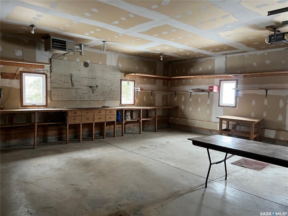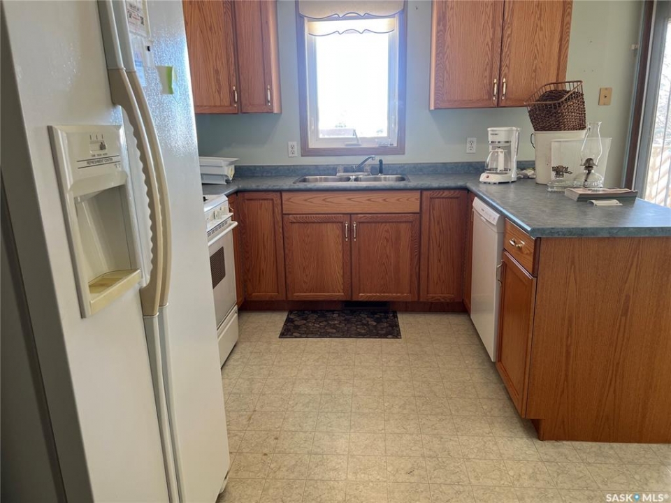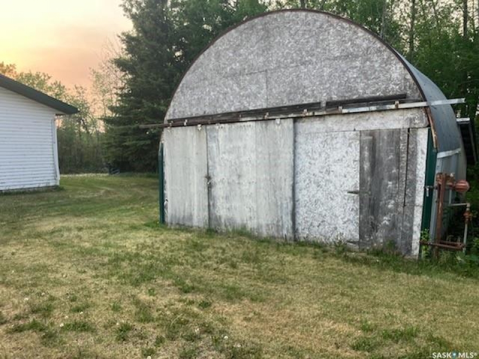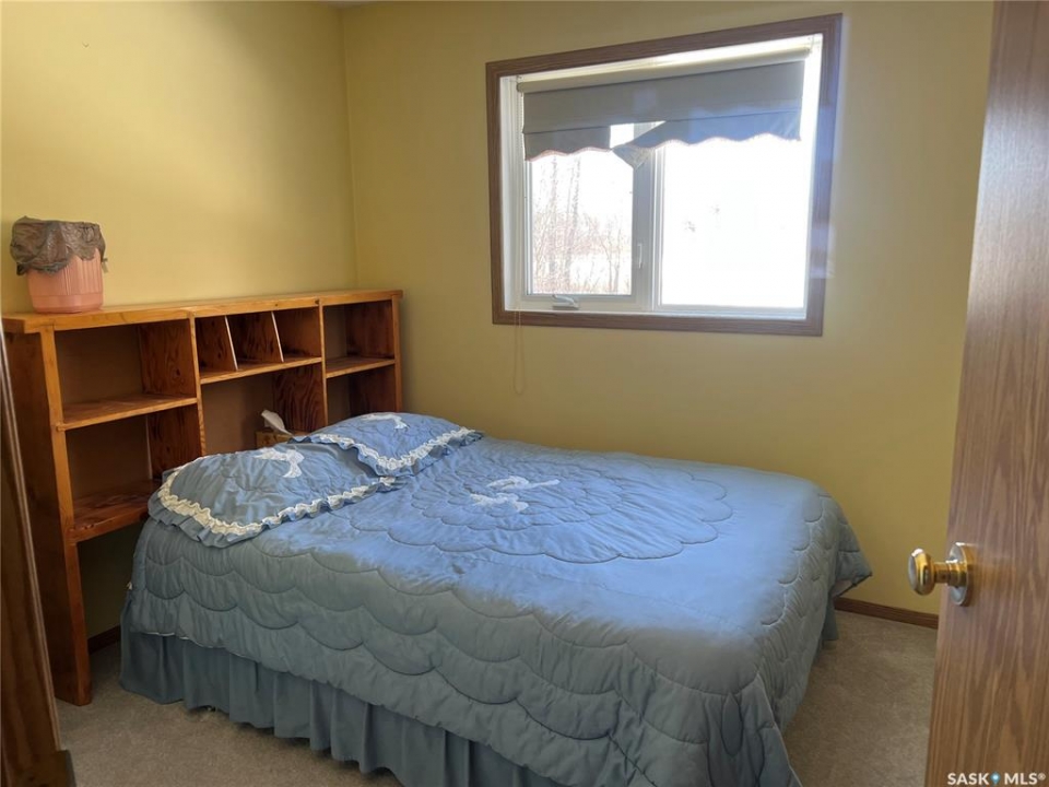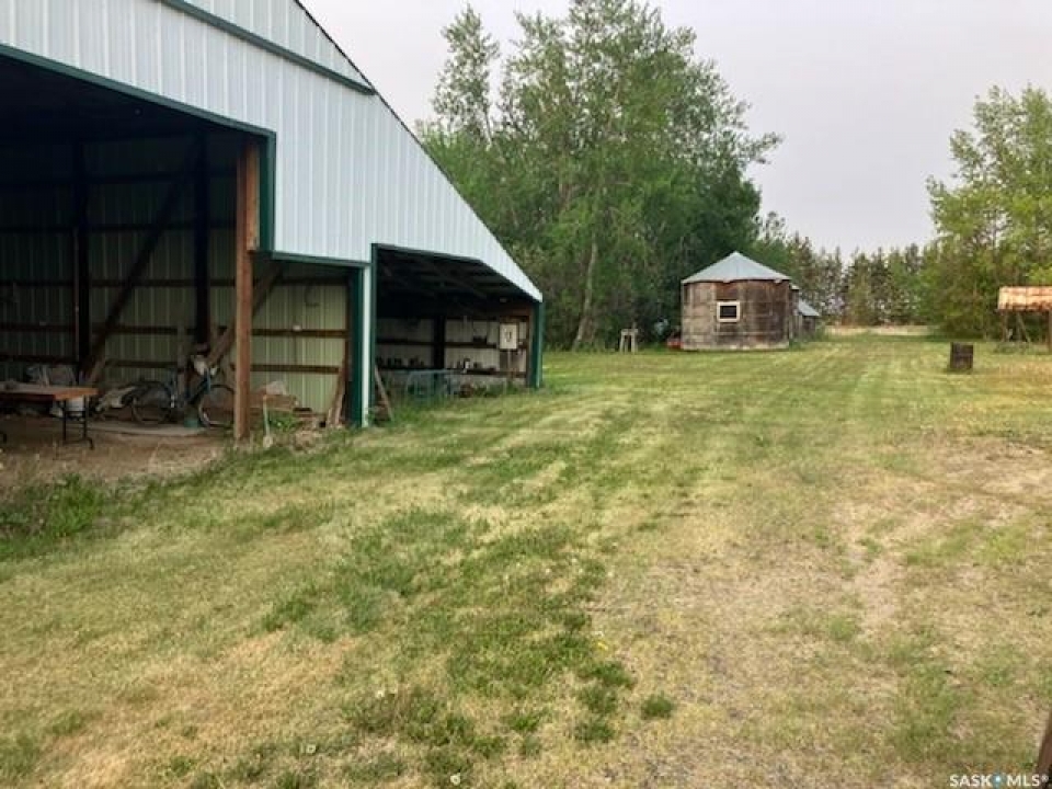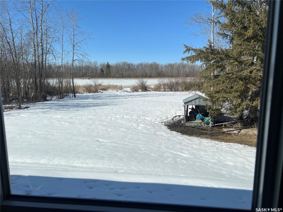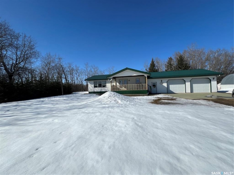 Look! Look! Built in 2000, this 1092 sq. ft. 3 bedroom, 1 full bath bungalow with breezeway and attached double garage is situated on 10 beautifully landscaped acres. Yard has great appeal from the grid road. Garden is close to the road by the driveway. Deck offers shade and a great view of the surrounding area while barbequing on the NG BBQ. Private lake in back provides your own piece of paradise! Garage has NG overhead heater, lots of windows for plenty of natural light. It is fully lined, insulated and wired with automatic openers. Concrete floor in excellent condition. Work area on back wall. Yard has underground power; large dugout for water; septic tank and pumpout for sewage disposal. Mature spruce shelterbelt surrounds the yard. Outbuildings include: Arch rib shop with addition, Metal clad pole shed with 3 sided lean to; 3 older wooden bins were used as a workshop. Bungalow has large covered deck on front with garden doors to the dining room. Walk-in door to the breezeway/ mudroom allow access to the double garage or up 3 steps to the home. Breezeway/ mudroom has storage for coats and boots plus storage room for preserves. Upon entering the home, the door to the basement / crawl space is directly ahead. The kitchen is to the left and the hallway is to the right. Kitchen has custom oak cabinets with built in dishwasher, NG stove, fridge. Island separates kitchen from dining room. Double sided NG fireplace separates dining room from living room. Huge living room, great for entertaining! Living room opens into hallway. Primary bedroom has panoramic view of small lake back of the home. All 3 bedrooms have a great view of the lake! 4pc main bath. An area has been cleared for firepit and barbeques where guests can listen to the frogs sing or watch the geese fly in to land! Great place to commune with nature! A small shed near the firepit area, house a pressure system from the lake which is used to water the garden.