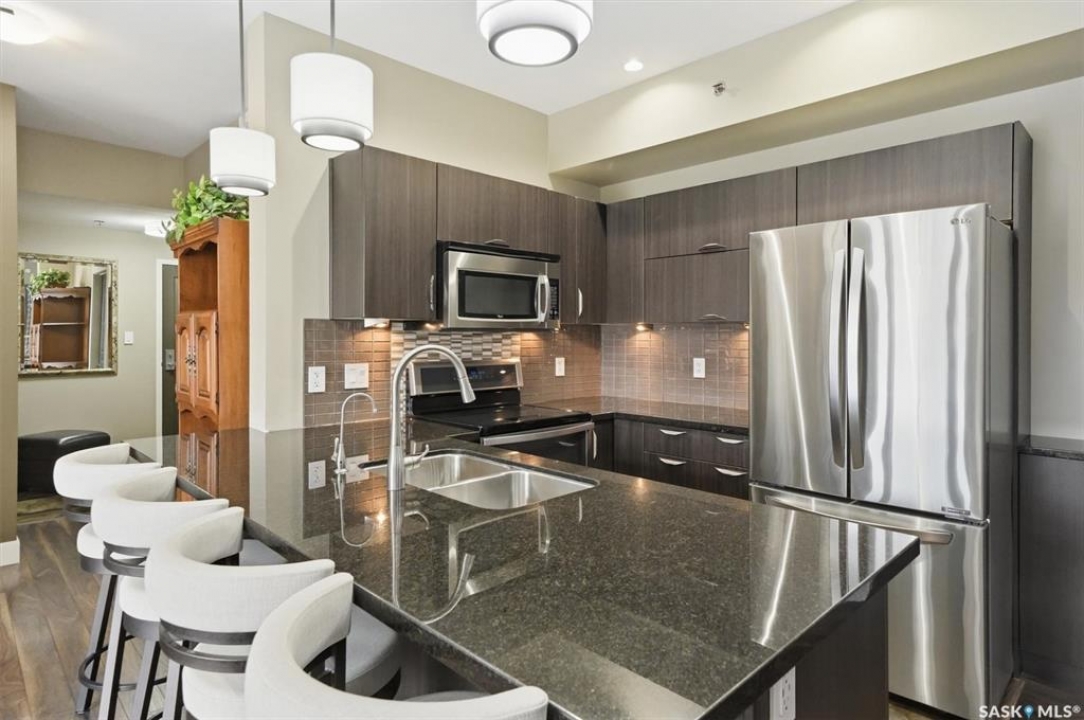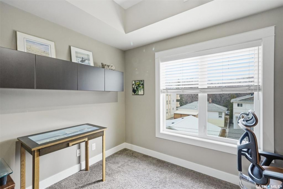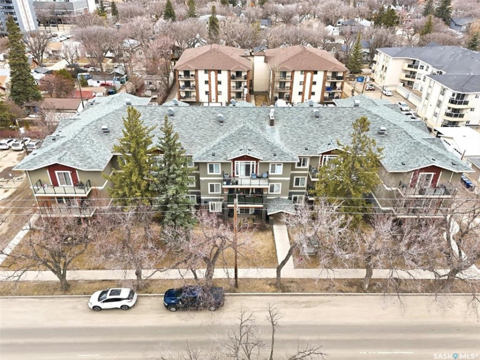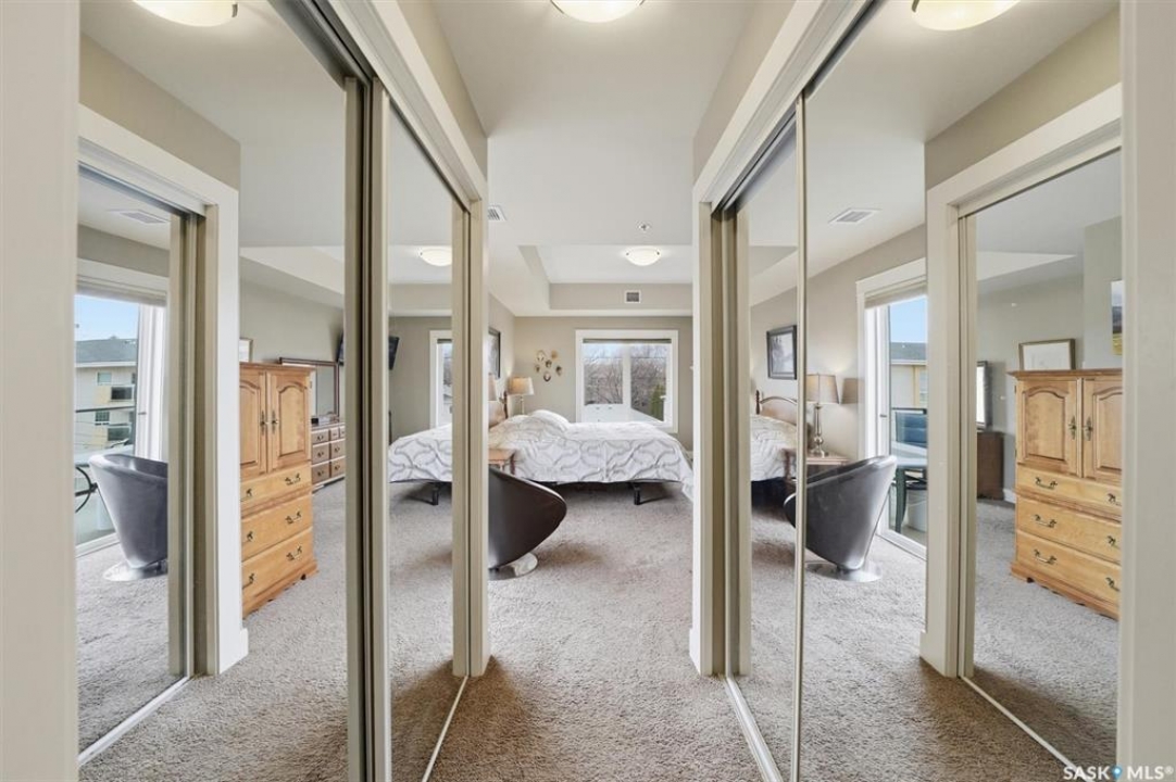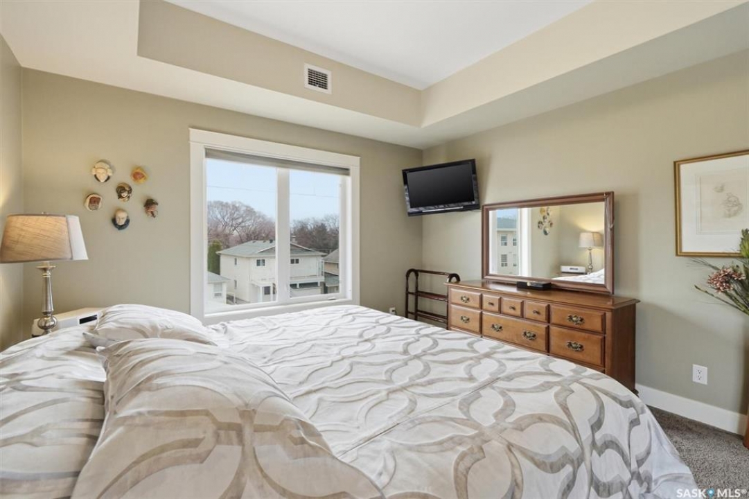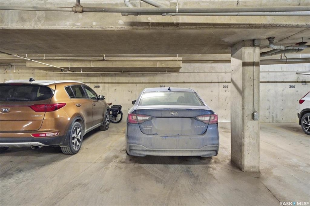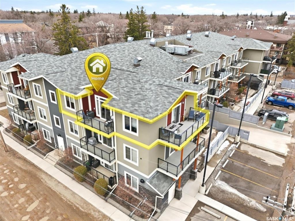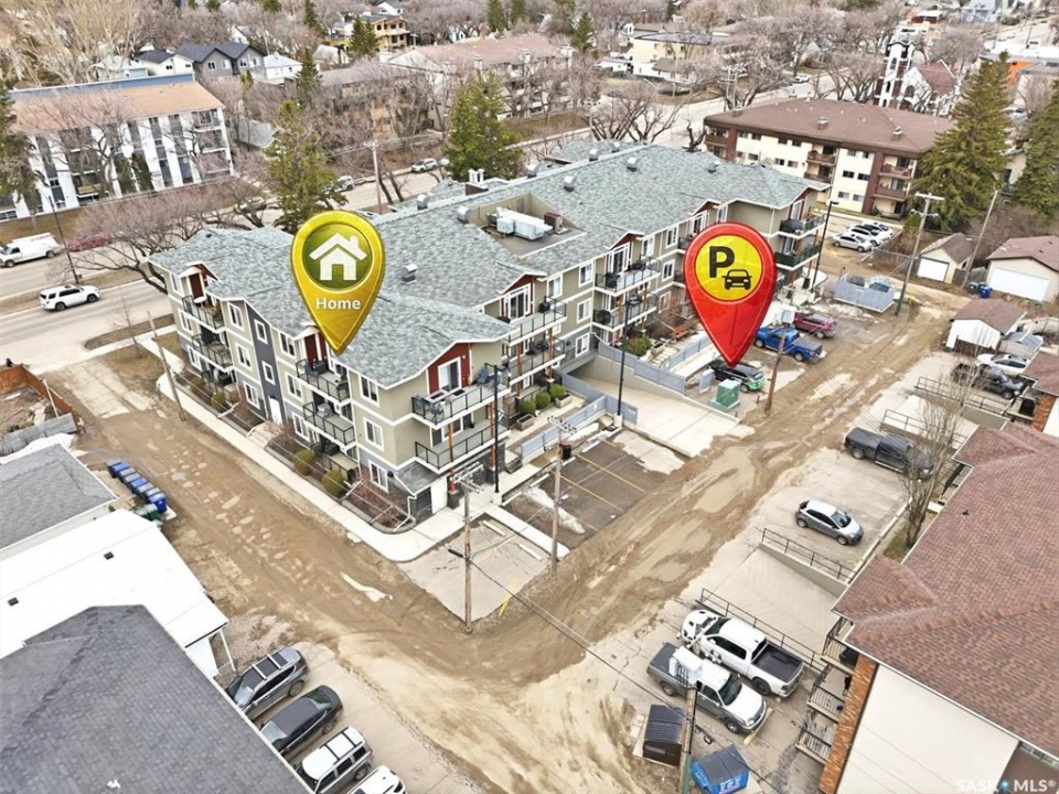 Welcome to “The Vestel” on 8th Street, where elevated condo living meets the vibrant Broadway lifestyle. Ideally located between Dufferin and Lansdowne, this well-maintained and professionally managed building offers exceptional walkability: just a 10-minute walk to the Broadway Bridge and 20 minutes to Midtown Plaza, with easy access to restaurants, coffee shops, schools, and everyday amenities. This top-floor corner unit features 1,132 sq ft of thoughtfully designed living space with 2 bedrooms and 2 bathrooms, highlighted by soaring peaked ceilings and an abundance of natural light that create a bright, open feel throughout. A standout feature of this home is the extensive custom built-in cabinetry, with over $10,000 invested in beautifully matched millwork that seamlessly integrates with the kitchen while providing exceptional storage and functionality, along with a dedicated water filtration system and drinking water tap for added convenience. Enjoy outdoor living with two spacious private balconies, one featuring natural gas hookups, while also enjoying access to a shared common-area patio perfect for gathering and relaxing. Additional features include three titled parking stalls, with two underground and one surface stall, an underground storage unit, central air conditioning, in-suite laundry, elevator access, and a heated concrete ramp to the underground parkade for added year-round comfort. The building also features pressurized hallways, which help reduce noise transfer and contain cooking odors within each suite, contributing to a quieter and more comfortable living environment. The complex is very well maintained and self managed, with owners who take pride in the building, creating a strong sense of community. This is a rare opportunity to own a spacious, top-floor condo with premium features in one of Saskatoon's most walkable and desirable locations.