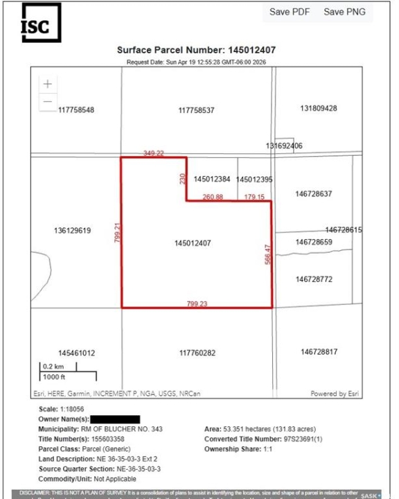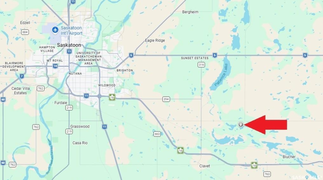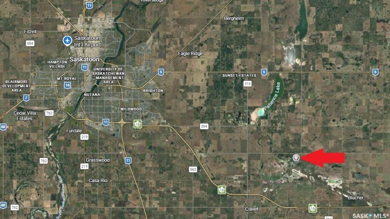 131.83 acres of pasture land in the RM of Blucher, only 15 minutes from Saskatoon. Fully fenced with newer barbed wire on the west and south sides, and older but functional barbed wire on the north and east sides. Seller had cows on the land in the past and states that natural gas runs through the property and electrical service across the road. RM office indicated potential for building site for a dwelling, please contact the RM office for details. SAMA report indicates type K soil on 67 acres with none to few stones, 65 acres of slough, and nearly level topography. The 2025 property taxes were only $270. Short drive to Saskatoon South Costco. Has main road access; the east-west road is a school bus route to Clavet and is very well maintained. From Zimmerman Rd, head east 10.3km on HWY 394 (Patience Lake Potash Road), turn right & go south 3.2km on HWY 316, turn left at TWP 360 (Cement Plant Road) & go east 5.6km on gravel - property on right-hand side (south) of road. No for sale sign, orange metal stake at the north west corner of the property. Red and yellow lines on maps in photos are approximate only. Call now for additional information.