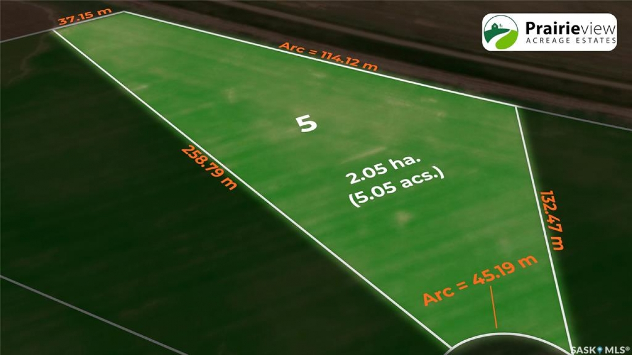 Build your dream home in Prairieview Acreage Estates! Located on paved HWY 734, just 10 minutes from Regina's north end, you will find this country residential acreage community. Escape the hustle of the city and live the acreage lifestyle you have been dreaming of! Gas and power services are provided to the property, making building your dream home a breeze. The acreages in the development range in size from 4.6 acres to 12.69 acres. These large acreage lots provide ample opportunity for creative home designs. The location is just minutes from three golf courses (Flowing Springs, Deer Valley, and Sherwood Forest Country Club). Bus access is provided to Lumsden Elementary and Lumsden High School, offering both English and French programs. Another bonus—choose your own builder! Don't miss the opportunity to visit Prairieview Acreage Estates today and experience the unmatched views and peaceful serenity of country living at its finest. Visit the developer's website at �https://www.prairieviewestates.ca