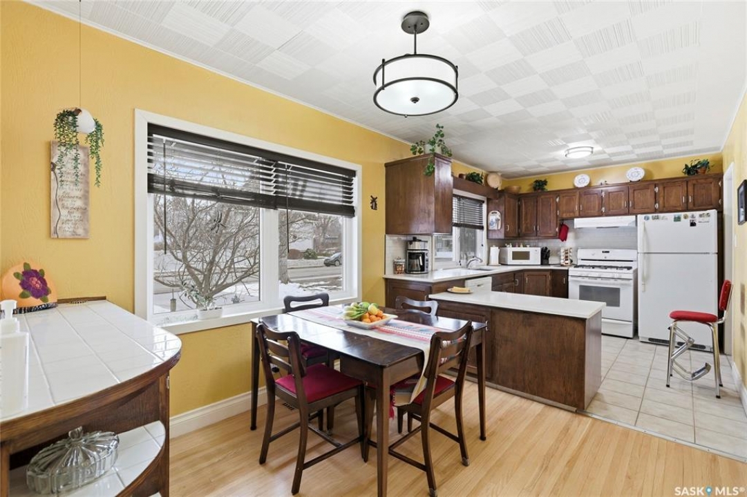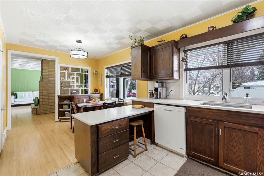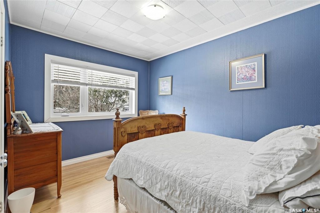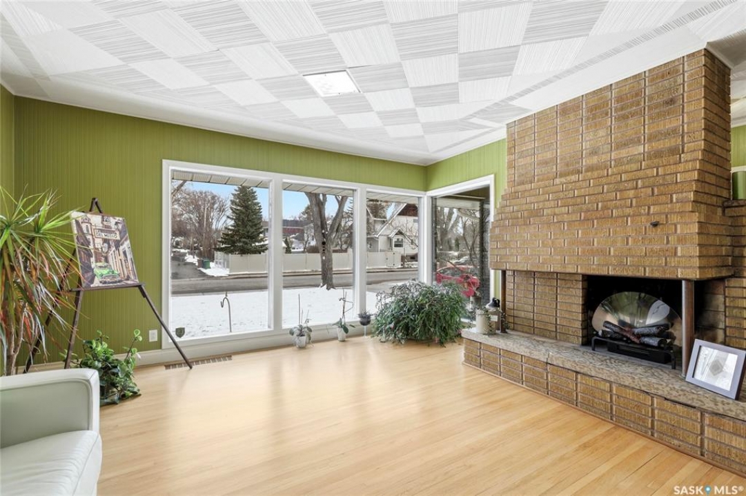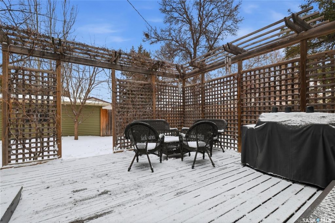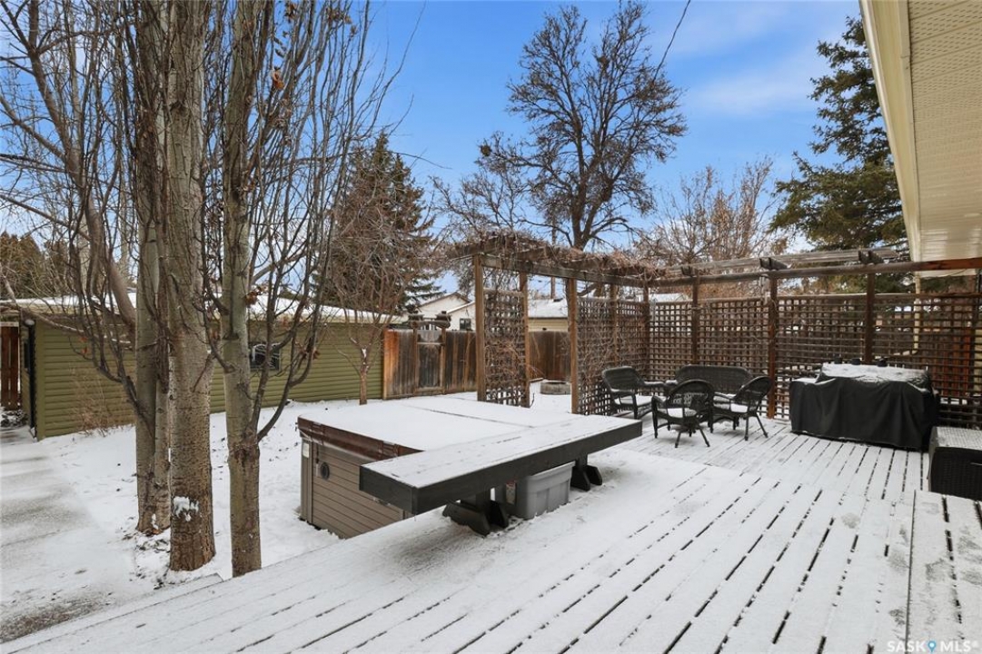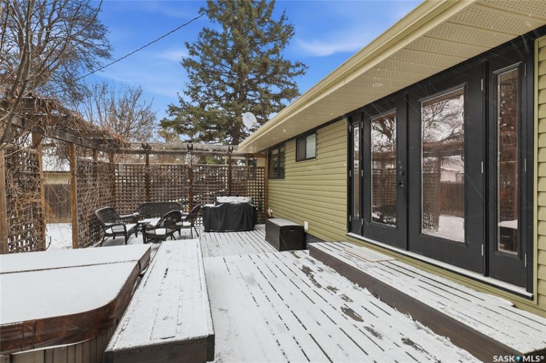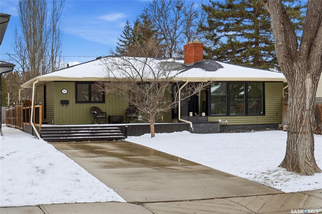 Midcentury charm meets modern conveniences in exclusive Lakeview. Regina's Lakeview is just a short walk to Wascana Park where you can lose yourself among the paths along the water. 10 minutes the other direction you will find a children's splash park and a par 3 golf course. University of Regina and Sask. Polytechnic are also within walking distance. K-12, both public and separate schools are in the area. As soon as you enter the home you cannot miss the original character perfectly aligned with today's luxuries. Floor to ceiling windows illuminate the living room with natural sunlight bringing the outside in. Brick and Tindal Stone fireplace gives separation between the kitchen and living room. (fireplace has never been used by owner) Kitchen has updated espresso cabinetry with endless quartz countertops and more large east-facing windows. The walk-in pantry has space for additional food items and small appliances. Good-sized eating area can accommodate a medium sized table. All kitchen appliances will remain. Main hall leads to three family-sized bedrooms and updated bathroom. Bathroom offers a deep soaker tub with subway tile surround and vanity with matching wall cabinet. Primary bedroom has double closets and garden doors that lead to your personal retreat. Escape the bustle of life to your own backyard paradise surrounded by towering trees with privacy and quiet. Enjoy the hot tub or family time on the deck. Lower level is warm with added insulation and has space for the entire family. Large rec room, full bathroom, extra large bedroom (window is large but may not meet current egress codes) for teenager or convert to a gym and utility /laundry with additional storage. Maintenance free exterior. Single detached garage. This home is move-in-ready. Just unpack and enjoy. The many upgrades include: sewer line private side and back flow valve, insulated and air-sealed basement R28, new wiring in basement, some new PVC triple pane windows, shingles.